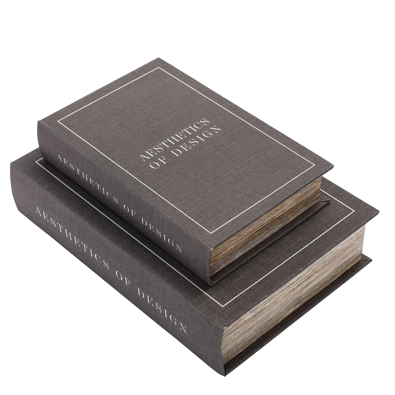 This set of two decorative book boxes is wrapped in charcoal-toned canvas with crisp serif lettering for a timeless, refined finish. Designed to resemble classic hardbacks, their muted palette and understated design make them a versatile addition to contemporary or traditional interiors. Inside, each box is lined with soft velvet, creating a discreet space for storing essentials while maintaining a curated look on shelves, consoles or bedside tables. Large W30 x D21 x H7 cm, Small W26 x D17 x H5 cm