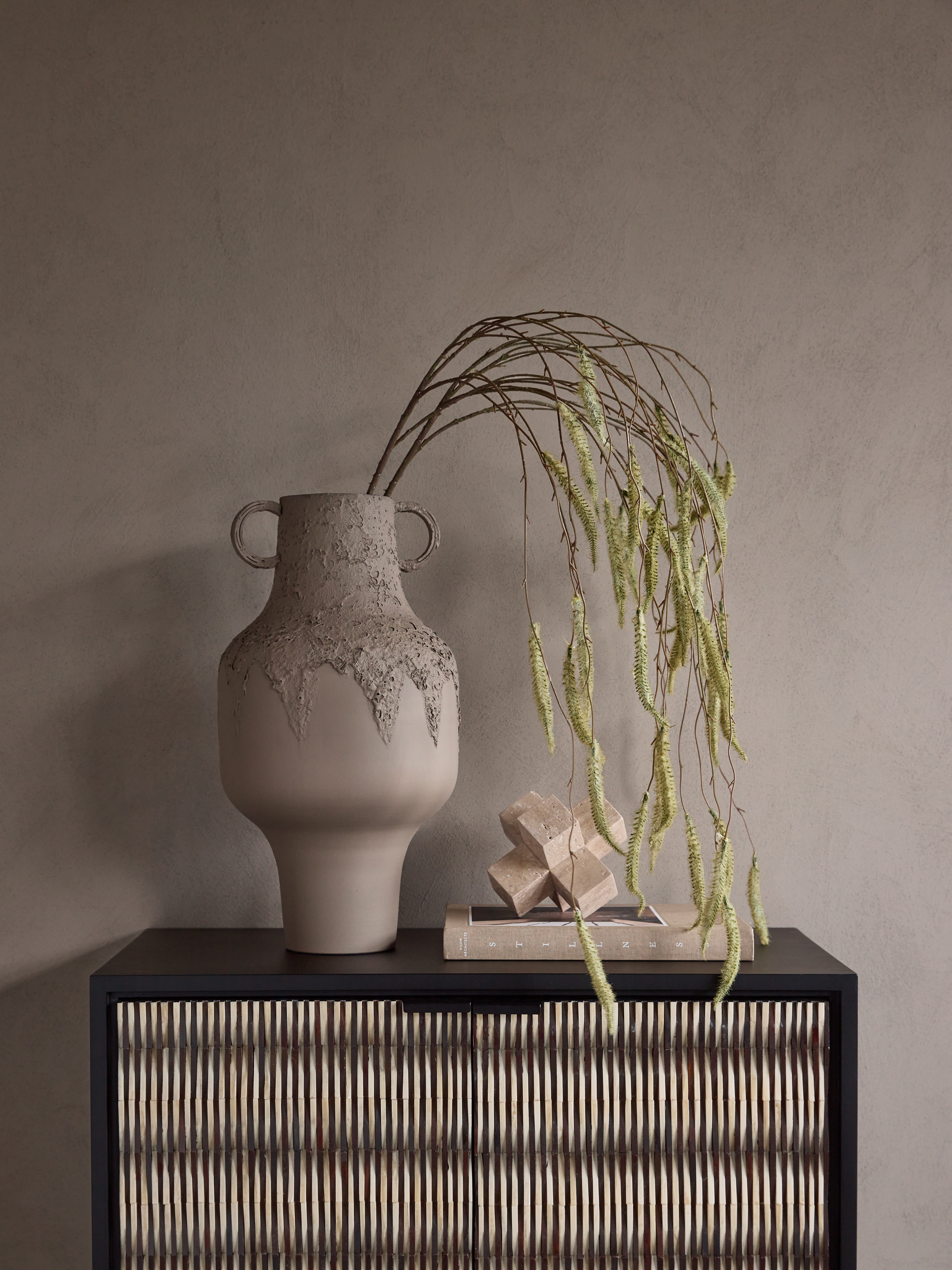Tall, sculptural, and full of character, the Alora Textured Vase is a standout accent piece for contemporary or rustic settings. Its elongated amphora-inspired form is finished in a deep earthy tone, with the upper portion coated in a hand-applied burnish texture. The tactile finish is crafted individually, meaning each vase carries its own unique surface quality and artisanal variation. Display with dried grasses or branches for an organic statement, or leave empty to highlight its sculptural quality. Coordinate with the small and large Alora vases for a cohesive, textural trio. W28 x D28 x H51 cm.