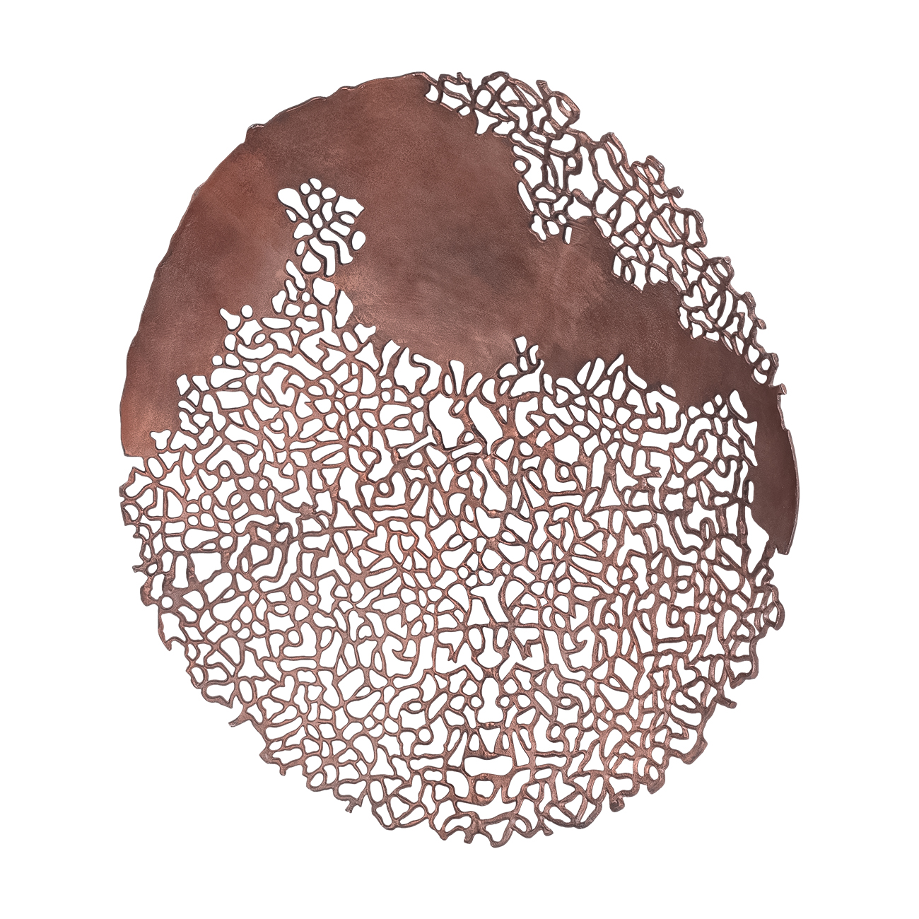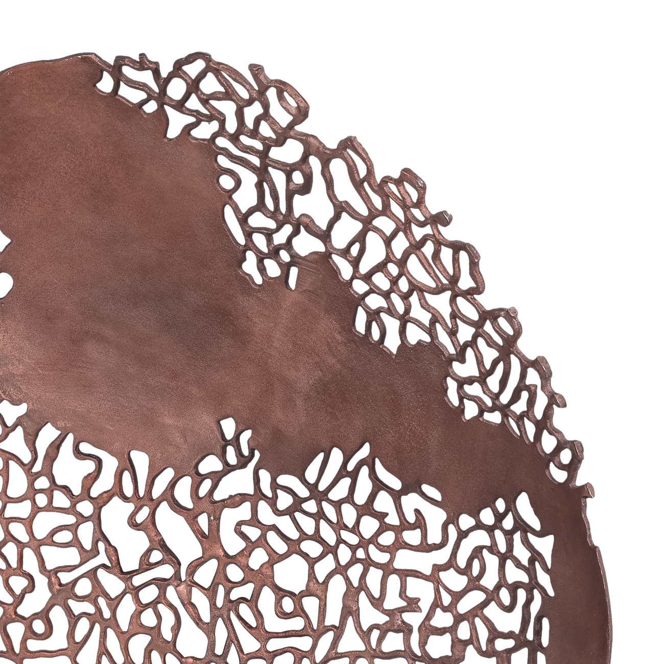 Drawing inspiration from the intricate formations of natural coral, the Apo Coral Wall Plaque is a statement in sculptural design. Cast in aluminium and finished in a distinctive raw bronze tone, it reveals every delicate curve and perforation with quiet precision. The broad, circular form adds depth and drama to a wall, while the open structure allows light and shadow to play across its surface. Ideal for anchoring a console, sofa or dining arrangement, it serves as both art piece and focal point. Also available in a raw silver finish. Dimensions: W92 Ă— D13 Ă— H92 cm