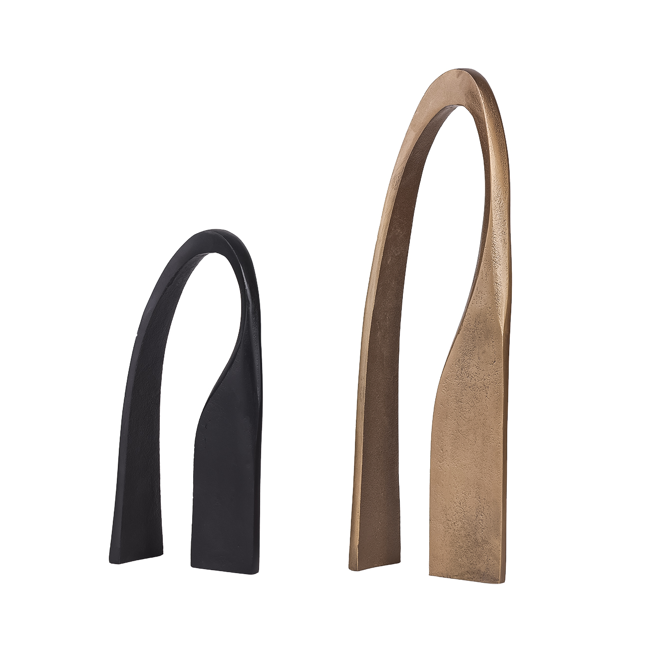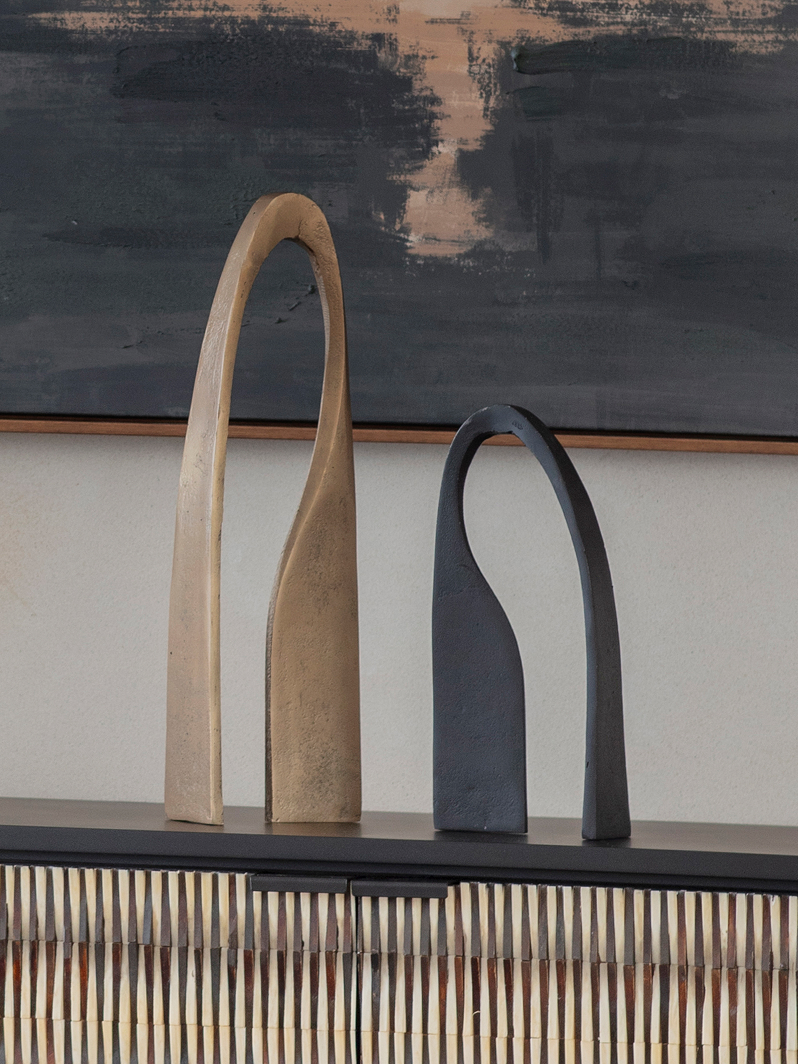 A refined expression of minimal form, the Arch Sculpture in Antique Brass celebrates a huge trend in art and architecture. Cast in textured aluminium with a soft antique brass finish, its fluid curves create an architectural silhouette that stands beautifully on its own or layered into a styled surface. Its taller profile makes a striking vertical accent on shelves, consoles or sideboards. Solid cast. Display with the coordinating smaller black sculpture of the same name for a design conscious alternative to sculpture. W14 x D7 x H45cm.