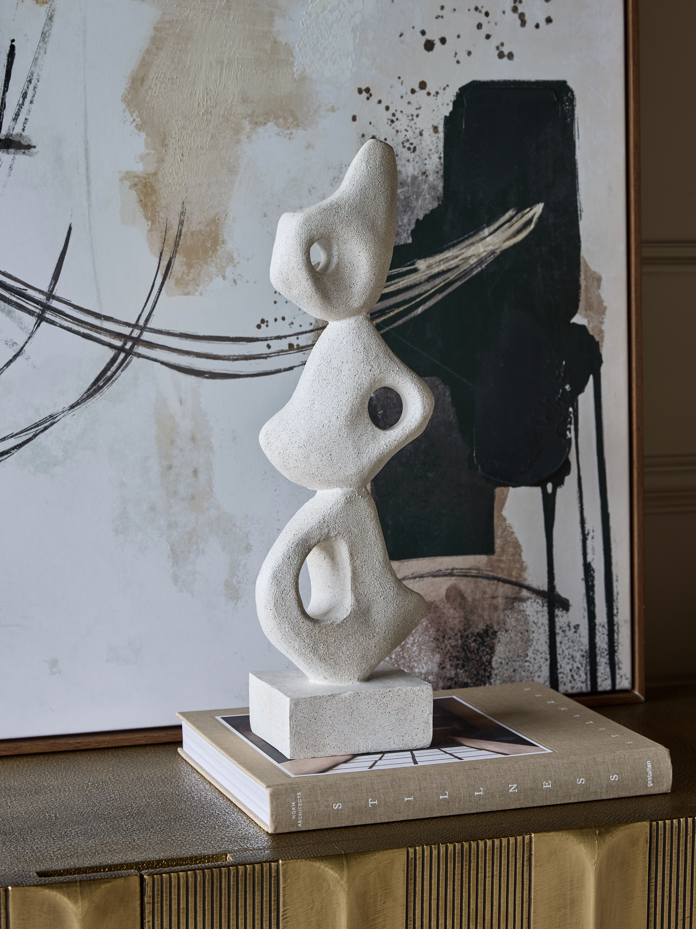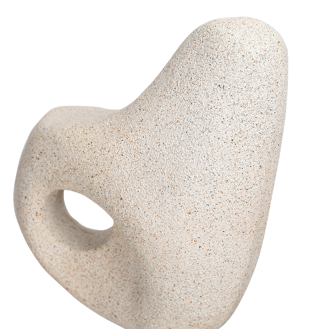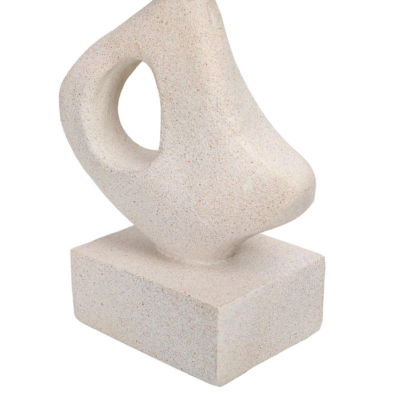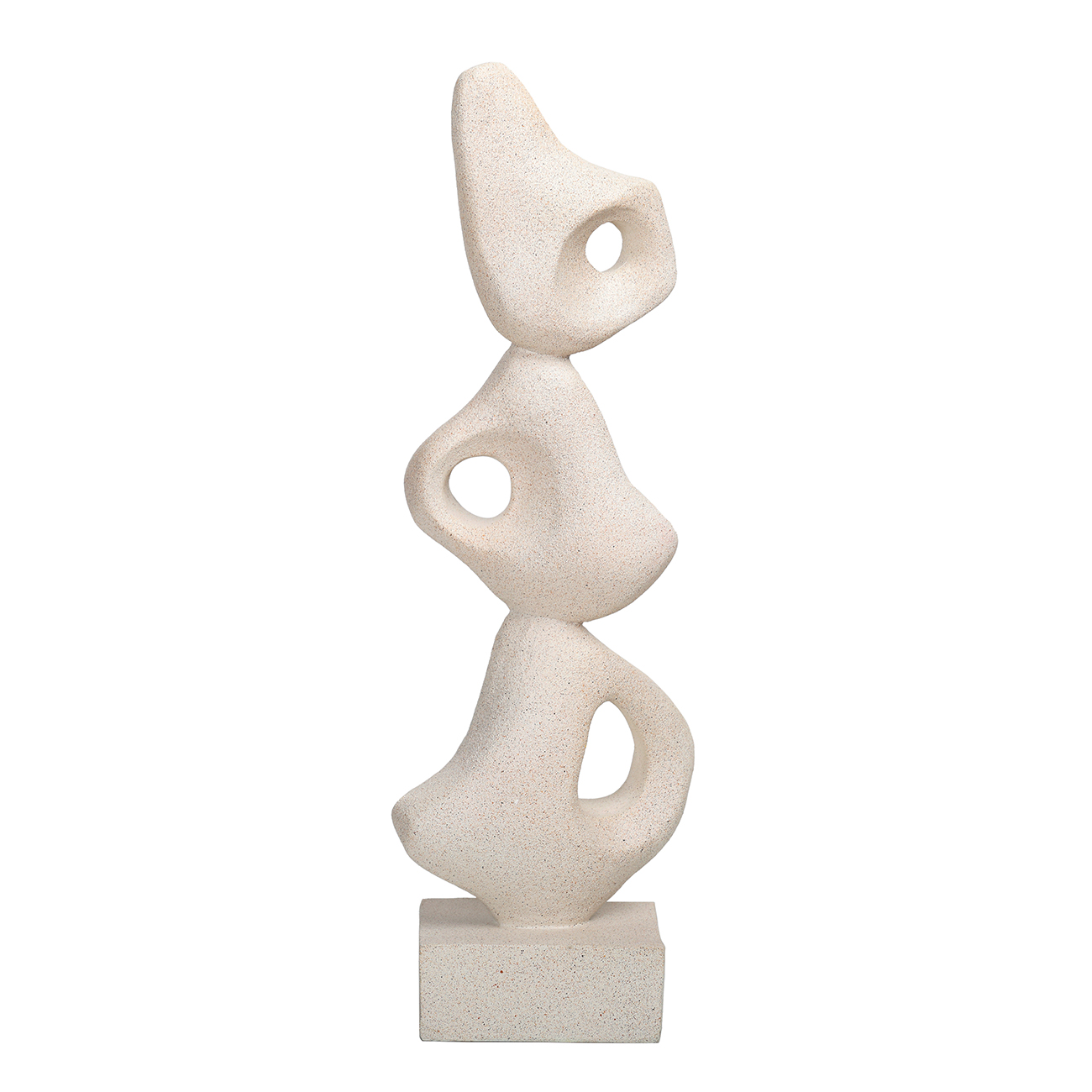 This sculptural form explores balance through abstraction. Three biomorphic shapes, each distinct in curvature and scale, are stacked in a vertical composition that feels both grounded and weightless. Cast in a stone-like resin blend, the surface has a sandy matte texture that recalls hand-carved limestone. Its pale, natural tone complements both neutral and richly layered interiors, offering visual interest without excess. A refined statement piece that pairs sculptural artistry with quiet material presence. W15 x D10 x H48.5cm