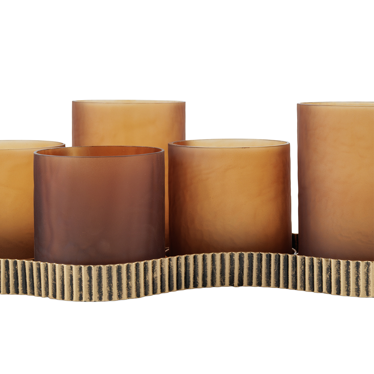 The Belvedere 9 Light Candle Holder in Aged Gold exudes warm sophistication, combining a striking presence with intricate timeless design. Its undulating corrugated iron base, finished in antique gold, holds nine hammered glass votives in a deep matte butter rum tone. The alternating heights of the holders create visual rhythm, while the frosted glass diffuses the candlelight into a soft, inviting glow. Ideal for adding drama to dining tables, mantles, or console displays, this exclusive Libra piece offers both texture and elegance. Dimensions: W61 Ă— D18.5 Ă— H12 cm.