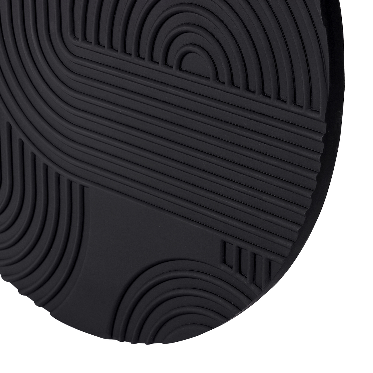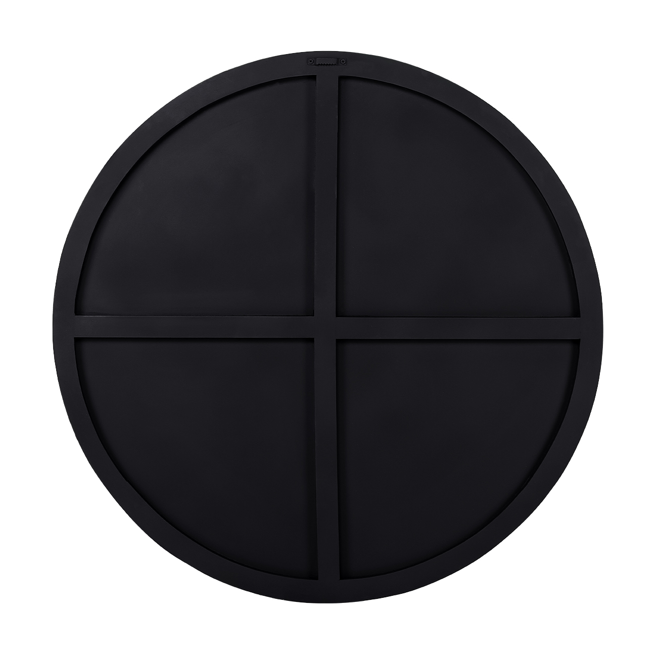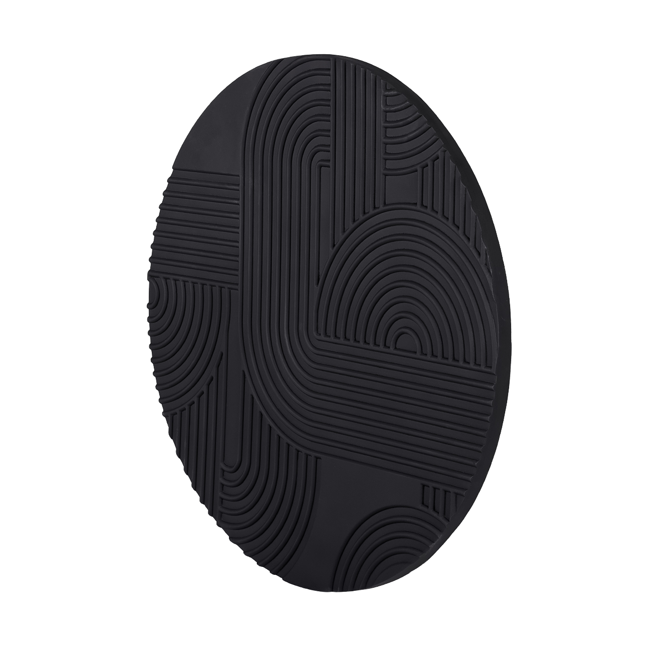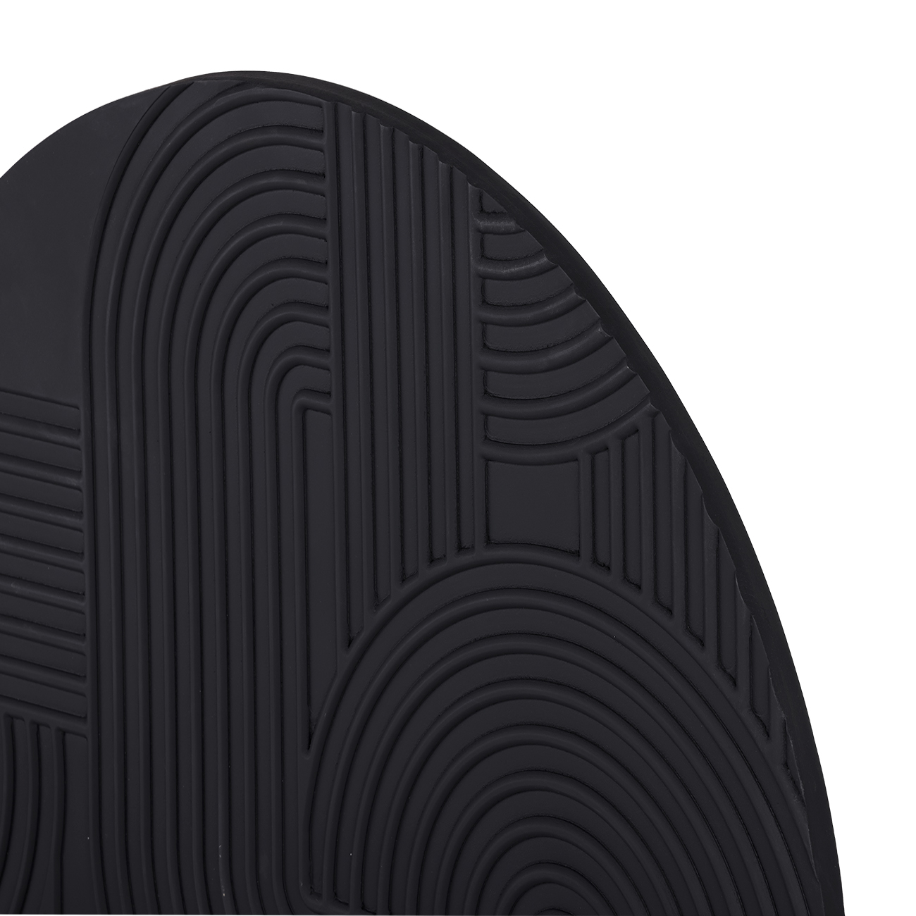 This circular wall panel explores the interplay of arcs and linear grooves, creating a surface of quiet rhythm and sculptural intent. Crafted from engineered wood and finished in a deep, uniform black, it highlights the precision of its carved pattern while offering a bold, graphic presence. Ideal for minimalist or architectural interiors, it serves as a confident focal point that rewards both distant viewing and close inspection. Supplied with a single sawtooth hanger for simple wall mounting. W90 x D3 x H90 cm