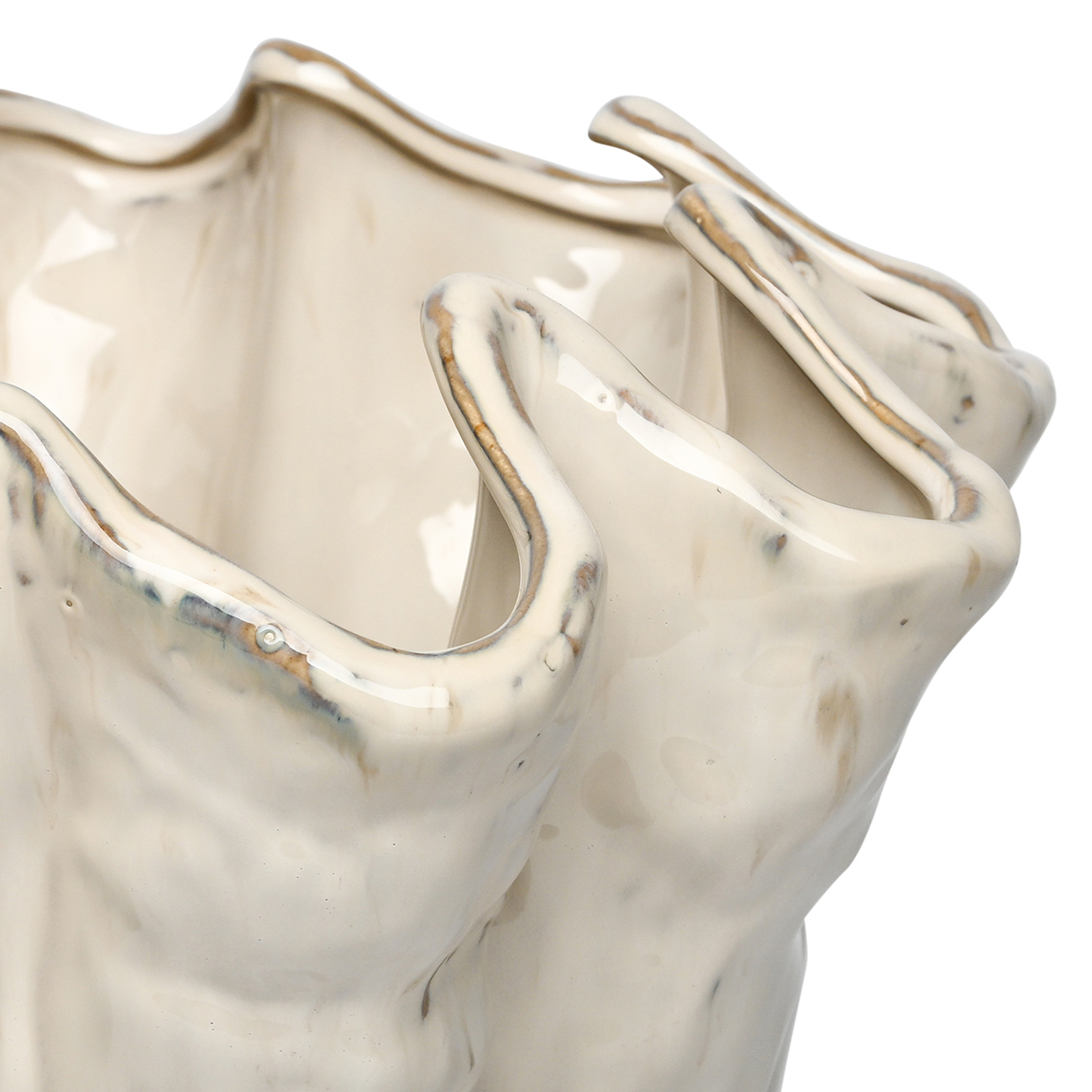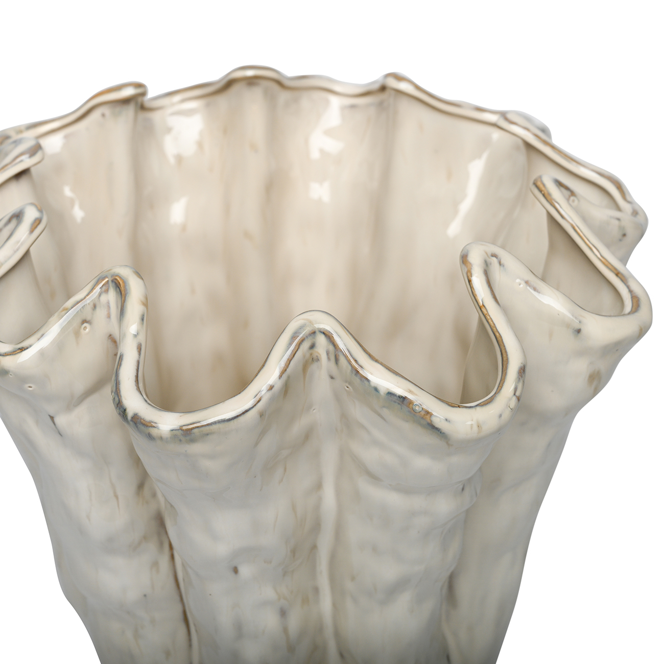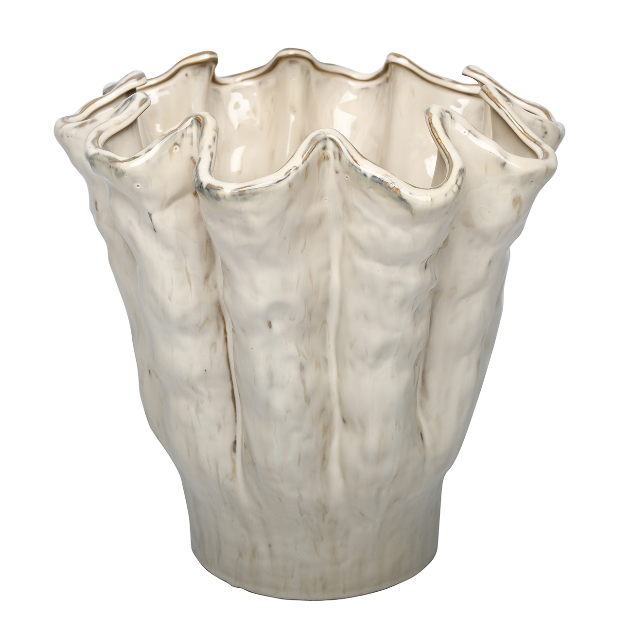 Striking in scale and softly textured, the Coralie Glazed Vase Large introduces sculptural presence to interior settings. Inspired by natural coral, its flowing ridges and speckled glaze invite movement and light across the surface. Glazed internally for use with water, this large vase is ideal for statement stems or tall branches. Display on its own or alongside the coordinating Medium and Small vases to complete the look. Dimensions: W39.3 x D34.5 x H37.2 cm