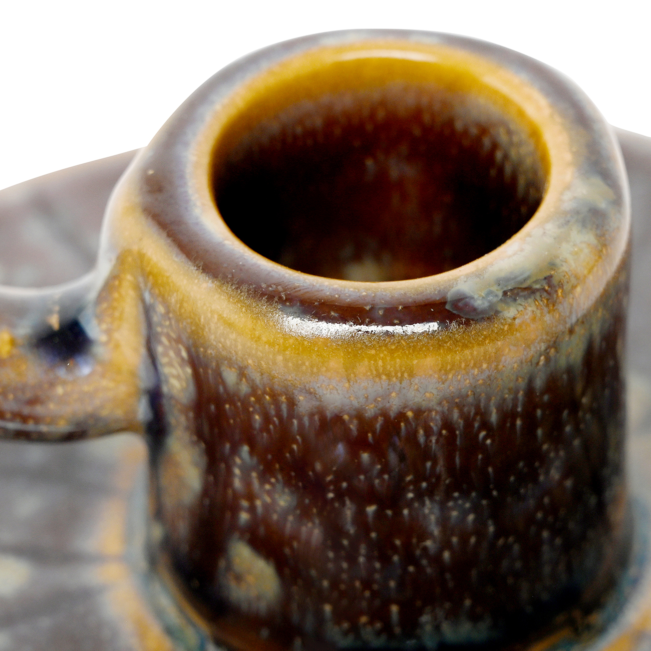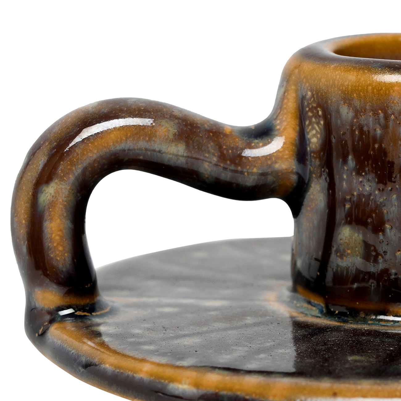 Drawing on the charm of heritage candle holders, the Denton Glazed Candlestick - Brown Green reimagines a timeless silhouette in tactile ceramic. Crafted in stoneware with a reactive glaze, its swirling surface blends earthy browns with soft green undertones, shifting beautifully in the light. A wide base and delicate handle offer both balance and visual charm, making it a characterful accent whether styled alone or within a layered tablescape. Compact yet expressive, it brings quiet focus to atmospheric corners and intimate settings. Dimensions: W10.5 x D10.5 x H4 cm