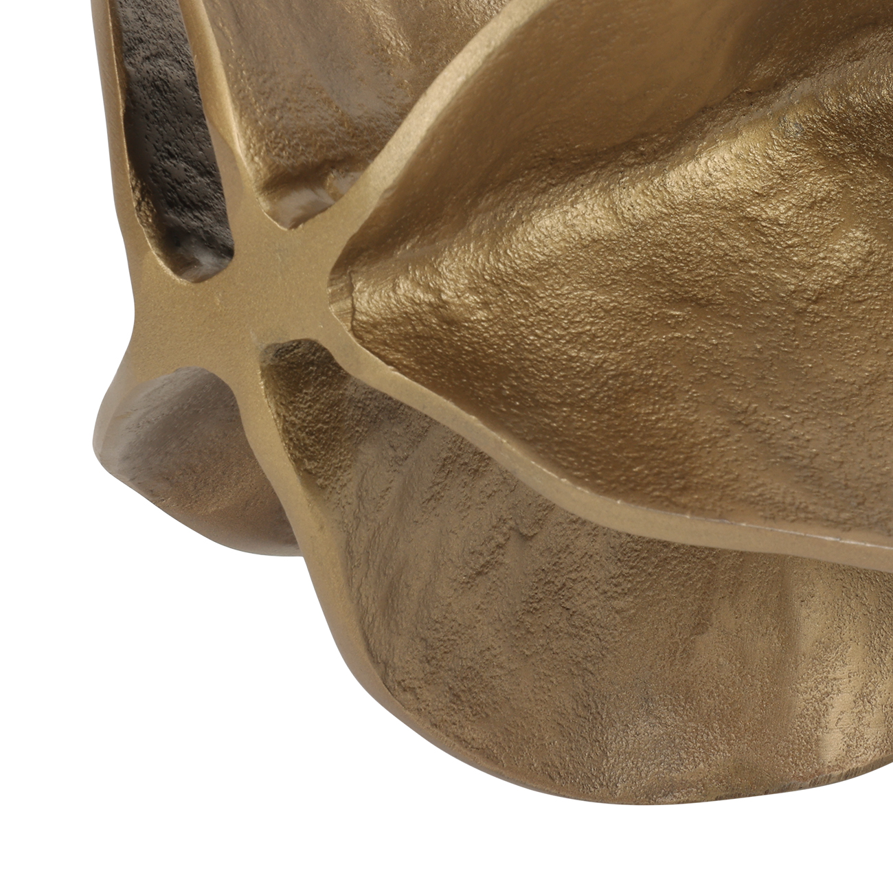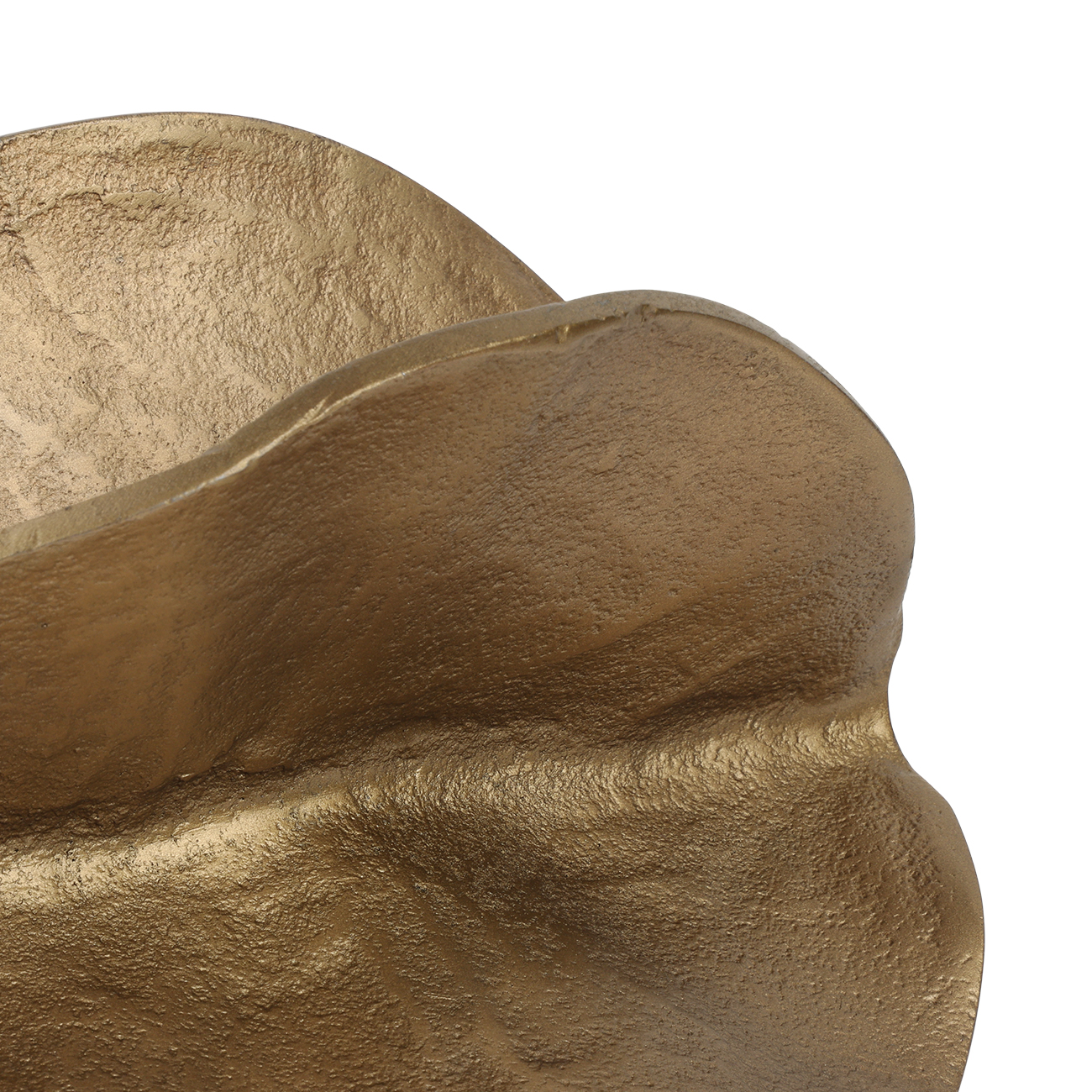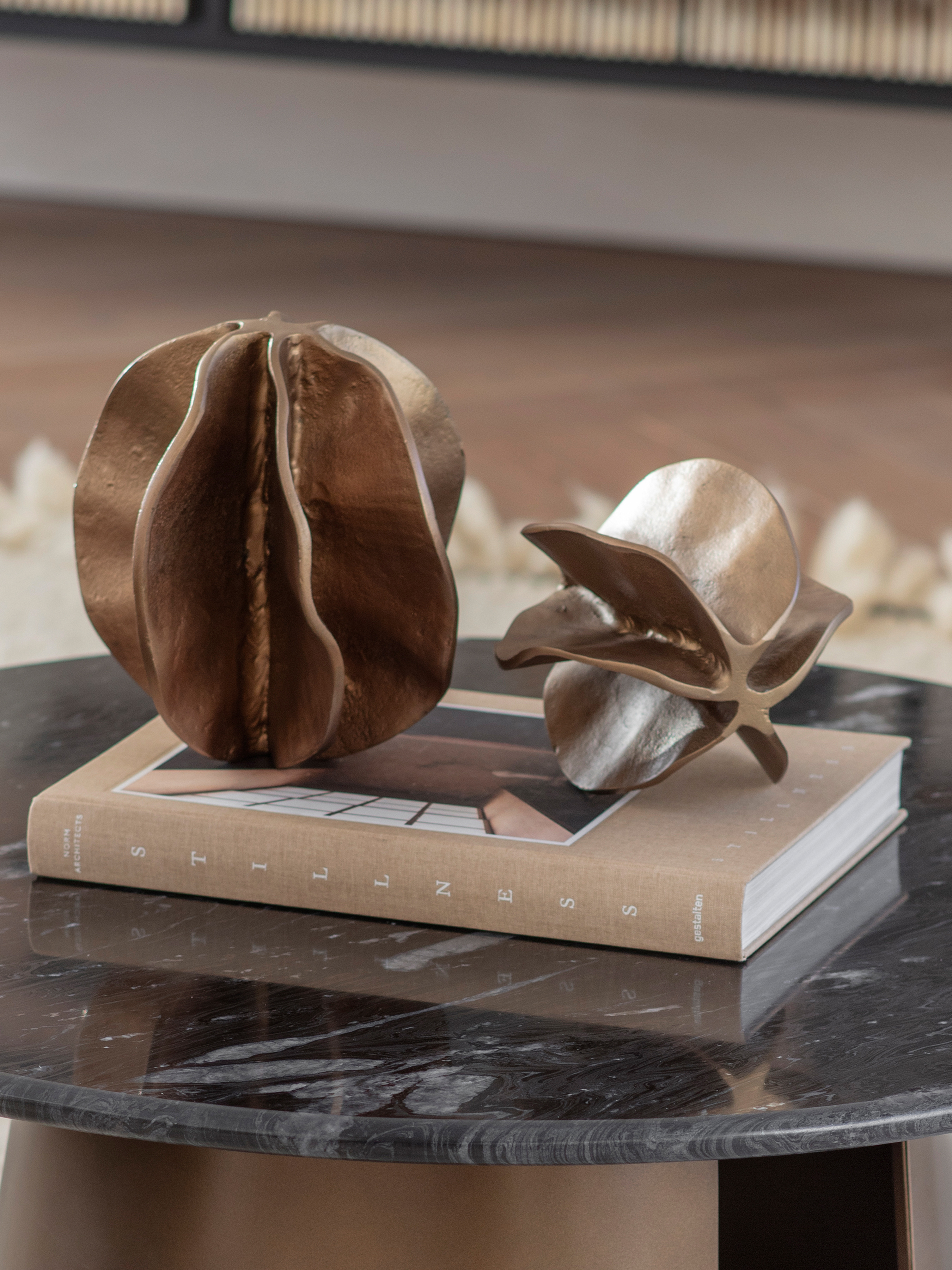 With its layered curves and hand-textured finish, the Ellie sculpture brings organic form and sculptural presence to interior styling. Cast from solid aluminium and finished in a warm brass antique tone, its shape echoes the folds of petals or leaves, offering depth and movement from every angle. Whether styled solo or resting atop stacked books or a console, Ellie makes a refined statement. Pair with the smaller version for a balanced and tactile display. W21 x D21 x H20 cm.