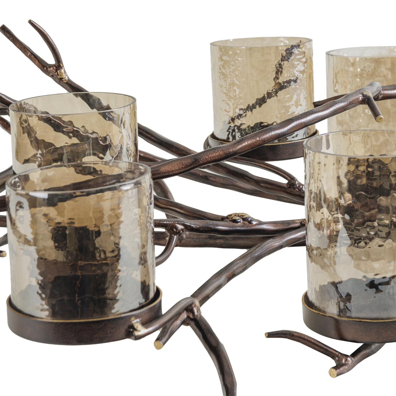 Striking a balance between organic artistry and functionality, the Ember Root 6 Light Candle Holder brings natural elegance to everyday surfaces. Crafted from iron with a hammered copper brown finish, the design evokes entwined branches, complete with gold-tipped details that lend a hint of luxe. The six smoked glass holders are lightly dappled, creating a softened glow when lit. Ideal as a statement on dining tables or sideboards, this Libra Retail channel exclusive is also offered in a larger eleven-light version for greater impact. Dimensions: W66.5 x D42 x H24.5 cm