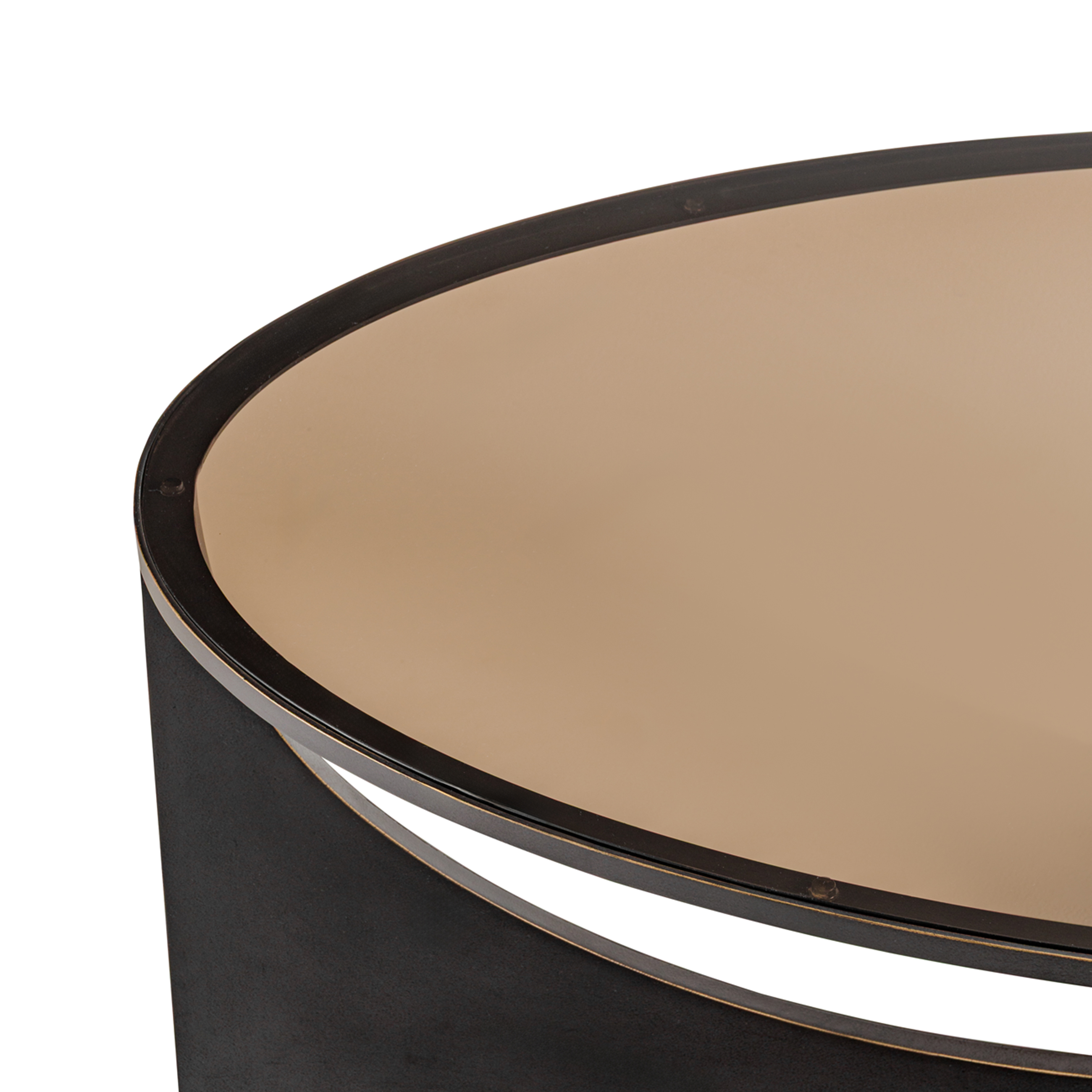 The Glenthorpe Coffee Table combines a brown-tinted glass top with a precisely laser-cut iron base, finished in hand-applied gilded oak wood. Its low, sweeping profile and intersecting curves align with the continued rise of sculptural, art gallery-influenced furniture, where clean geometry and bold silhouette define the room. The mix of smoked glass and dark metal reflects the broader trend for warm, moody palettes, introducing depth and understated luxury to living spaces. Pairs effortlessly with the Glenthorpe Console Table, Accent Table, Floor Lamp and Table Lamp. W110 x D65 x H42cm