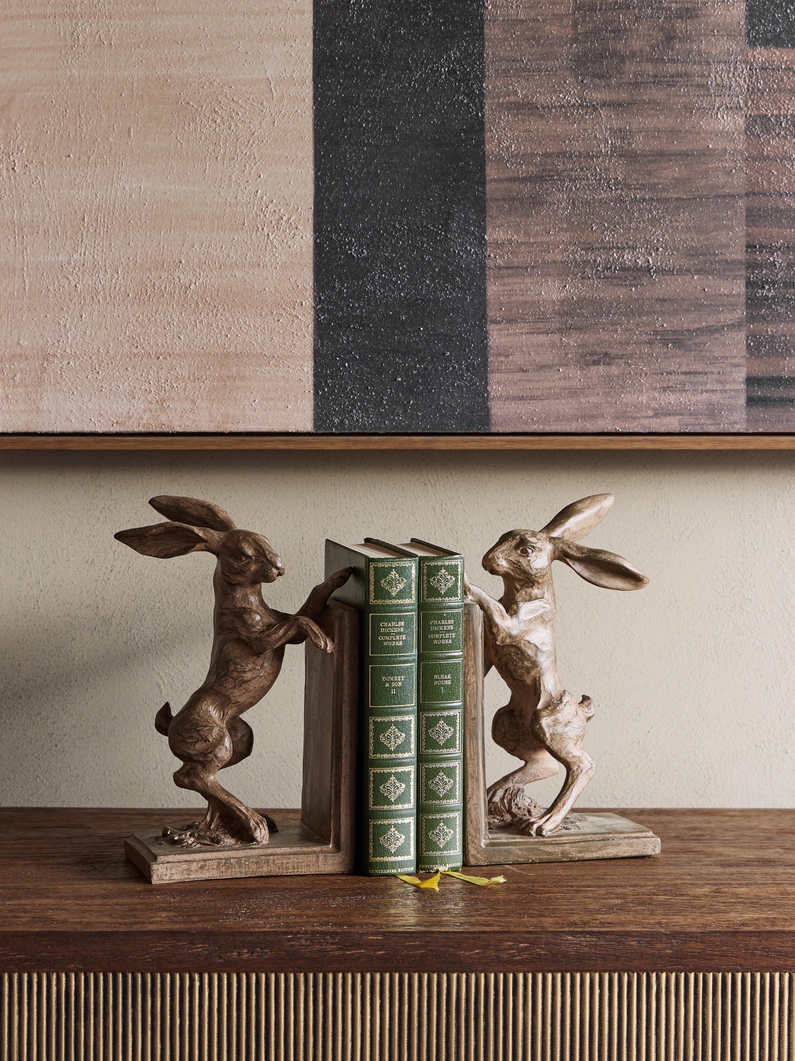 Striking a playful yet noble pose, this charming pair of Hurrel bookends features two boxing hares, adding character and whimsy to your bookshelf or mantel. Each hare is sculpted with keen attention to muscle tone and fur texture, giving a sense of movement and natural elegance. Crafted from a durable blend of polyresin and limestone, the pair is finished in a rustic, hand-weathered effect that lends antique charm. Compact and expressive, they offer both decorative appeal and practical support for your favourite reads. Dimensions: W14.4 x D9.4 x H23.4 cm
