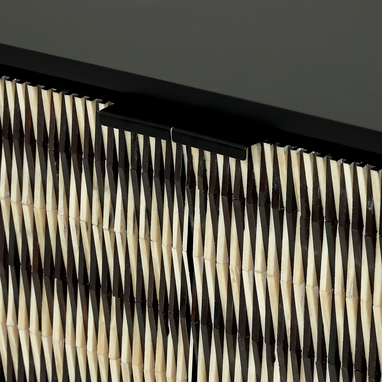 Elegant and sculptural, the Imperia Bone Inlay two Door Cabinet brings depth, texture and modern artistry to contemporary interiors. Its handcrafted doors feature a raised, rhythmic black-and-ivory bone pattern that plays with light, echoing today’s move toward sculptural surfaces and tactile materials. A matte black frame and slim legs ground the look with quiet glamour, while practical shelving keeps spaces calm and ordered. Style with the Imperia Sideboard, Chest and Bedside for a cohesive collection. W80 x D40 x H80 cm.