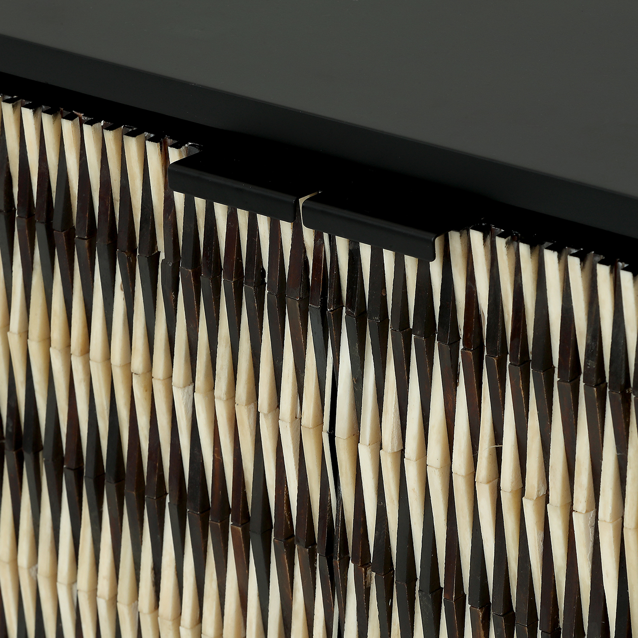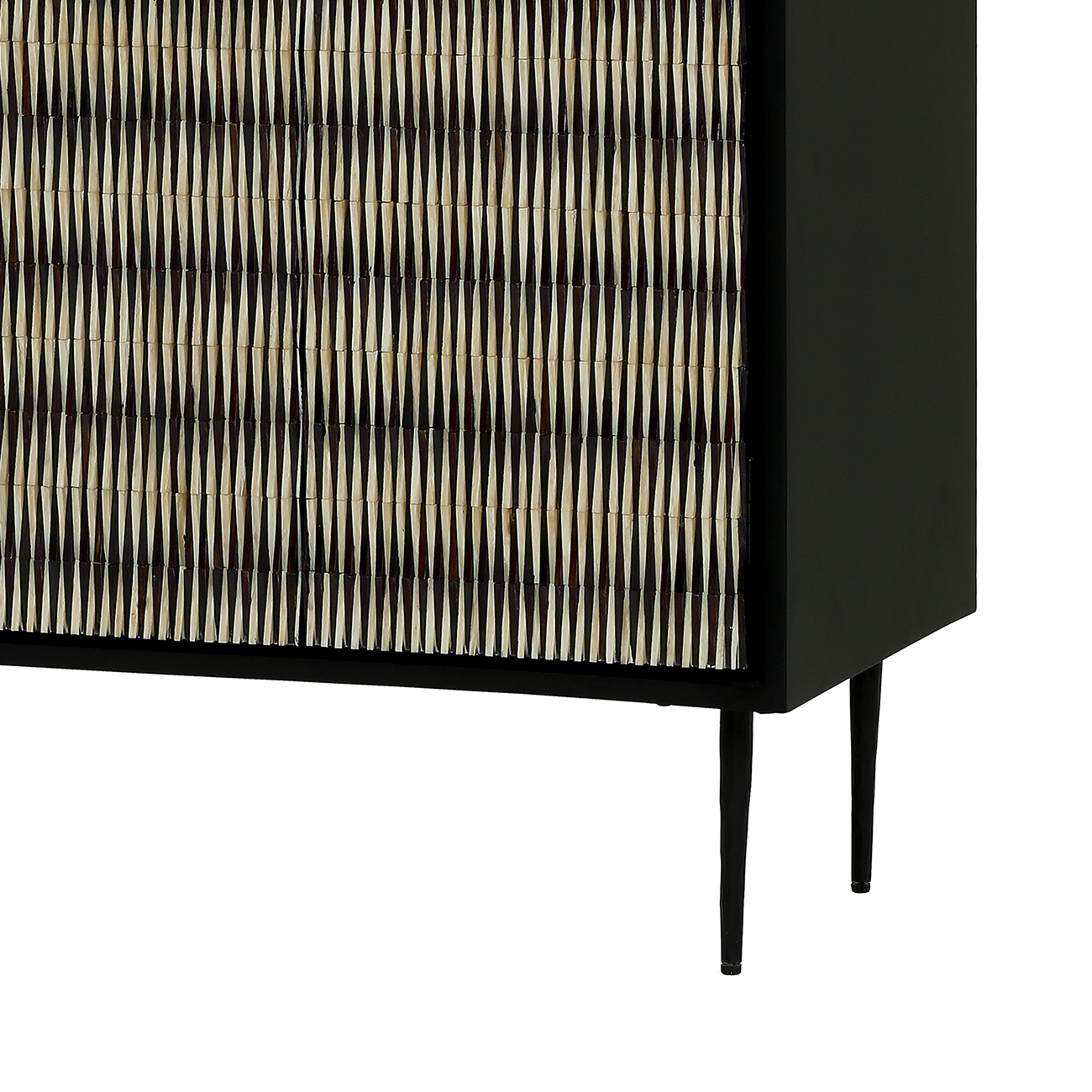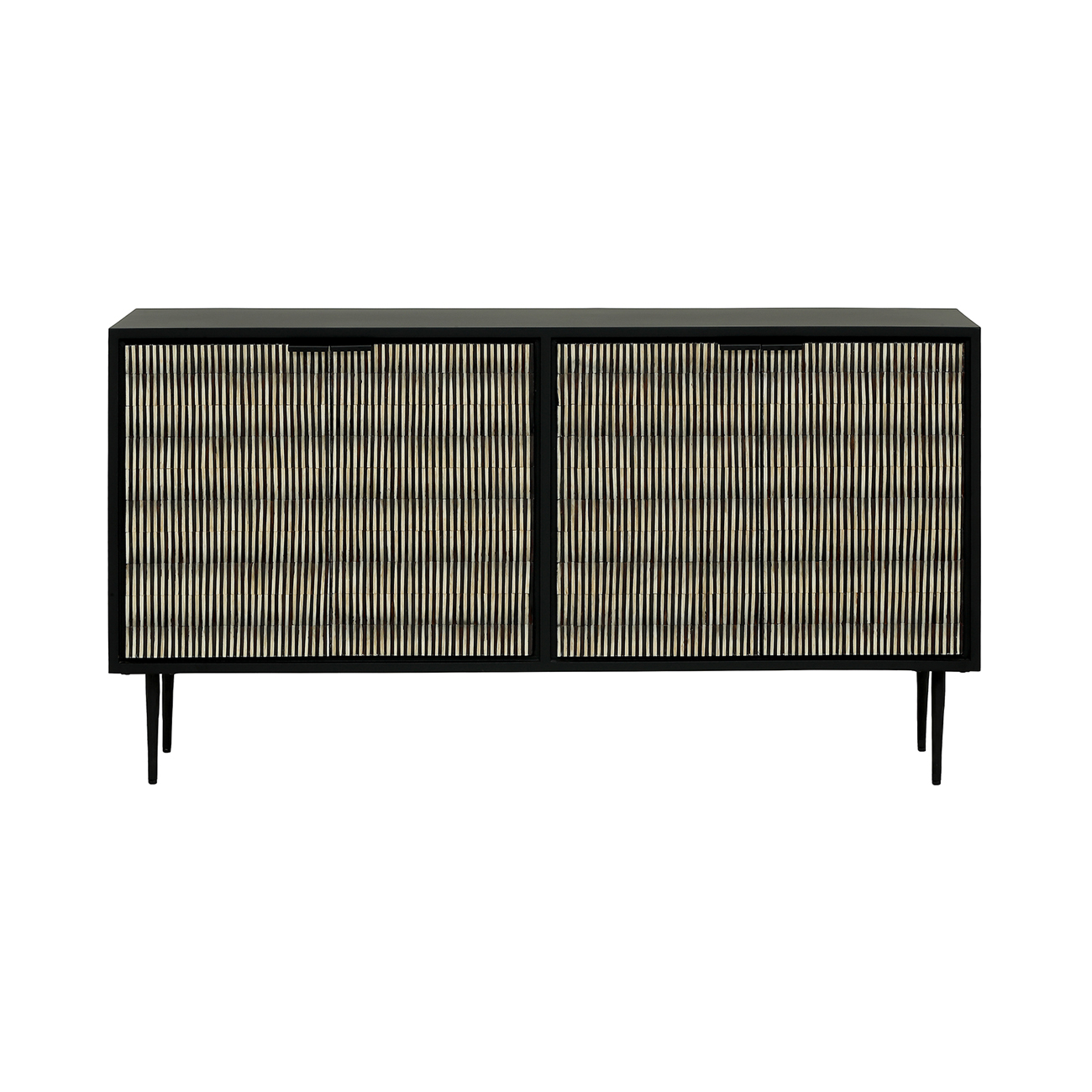 Refined and sculptural, the Imperia Bone Inlay Sideboard brings depth and modern artistry to contemporary interiors. Its handcrafted doors feature a raised, rhythmic black-and-ivory bone pattern that plays with light, echoing today’s focus on sculptural surfaces and tactile materials. A matte black frame and slim legs ground the piece with quiet glamour, while generous storage keeps spaces calm and organised. Style with the Imperia Cabinet, Chest and Bedside for a cohesive collection. W150 x D40 x H80 cm.