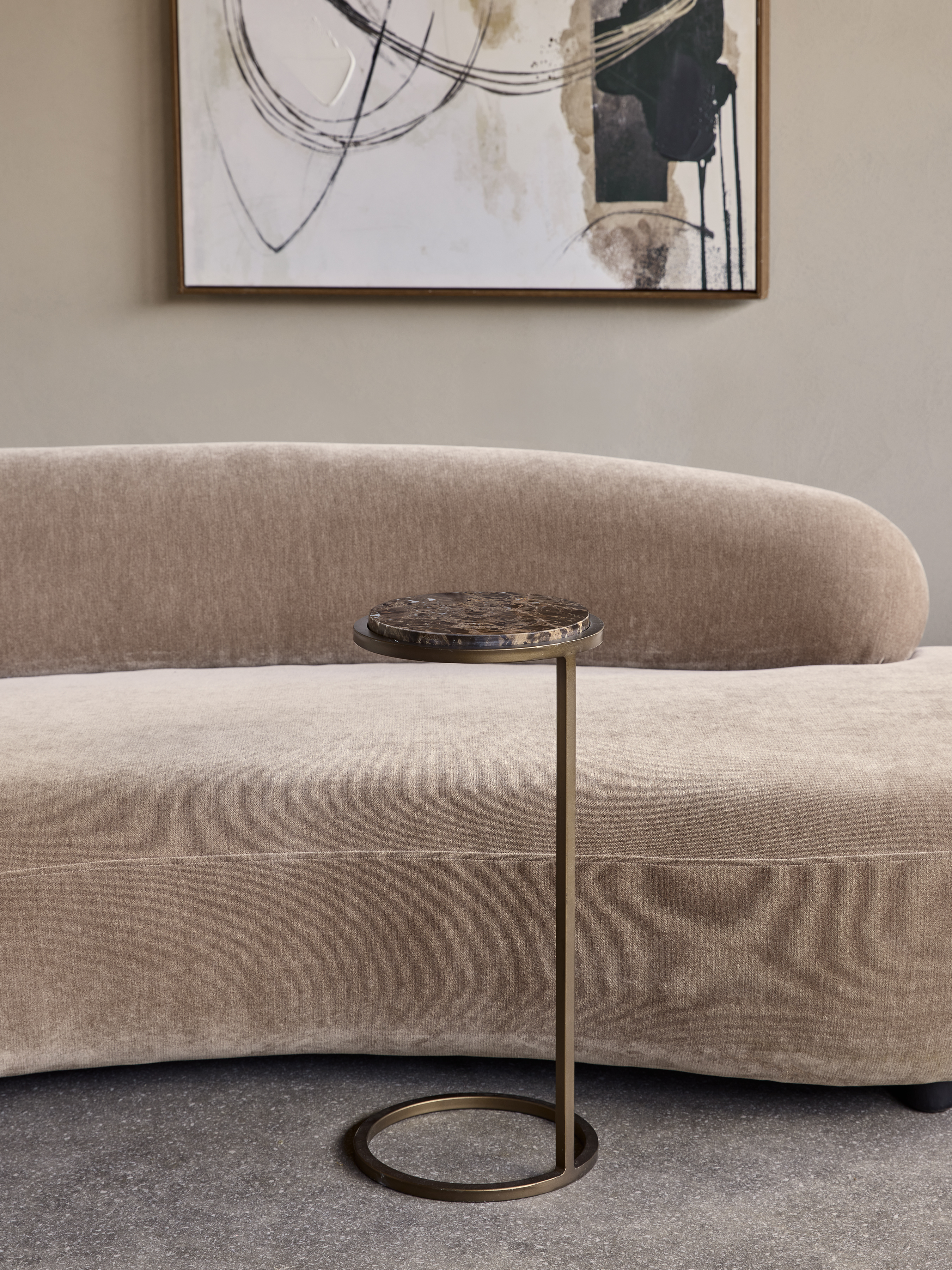 The Iota Side Table in Brown Emperador with a brushed metal finish in smoked gold is a stylish and stable piece of occasional furniture. The elegant table features a rich, warm Brown Emperador Italian marble top with intricate natural veining, making each piece unique as this is a natural product. This marble top is complemented by a sleek, brushed metal base, giving the table a contemporary and polished look.