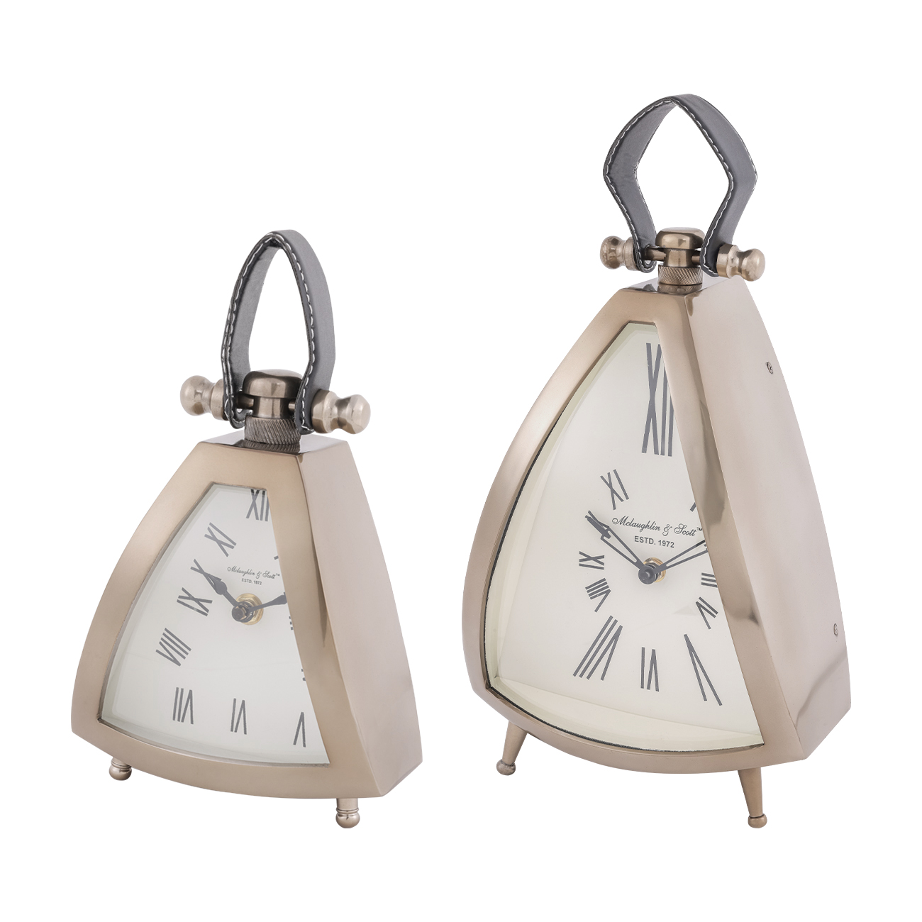 A new colourway of our much-loved Isosceles clock design, this larger antique brass version brings warmth and heritage charm to the collection. Crafted from aluminium and stainless steel, the distinctive triangular shape is softened with a curved glass front, while a stitched black leather handle adds a tactile contrast. A smaller antique brass version is also available, as well as the original nickel finish in both sizes. Requires 1 x AA battery, not included. Dimensions 44.3 x 9 x 20.5 cm.