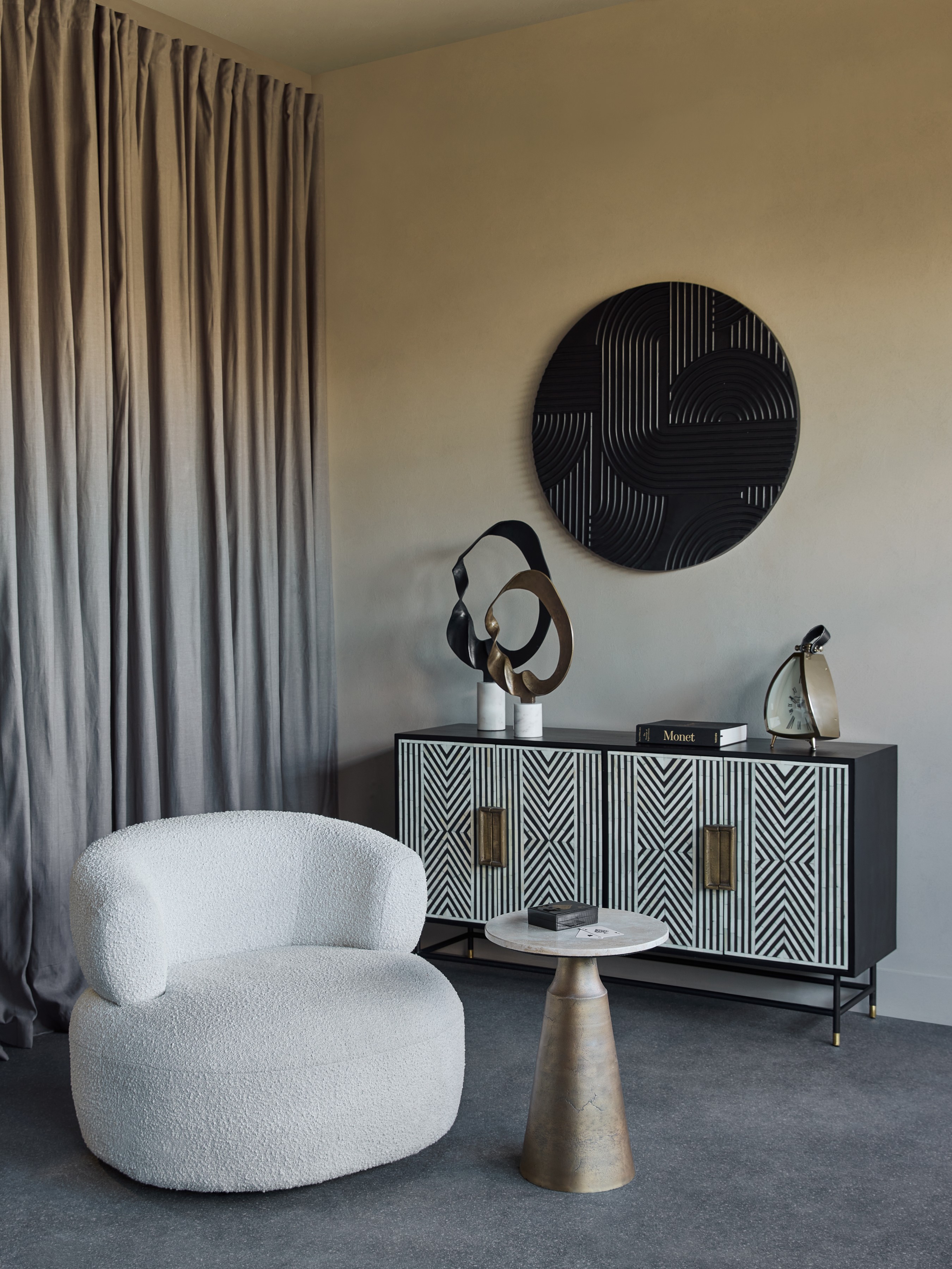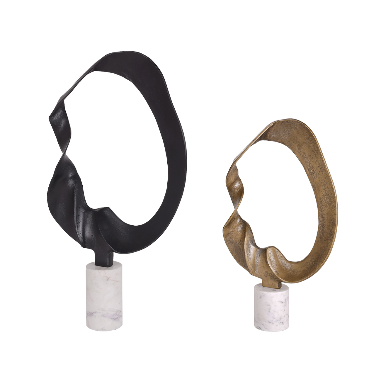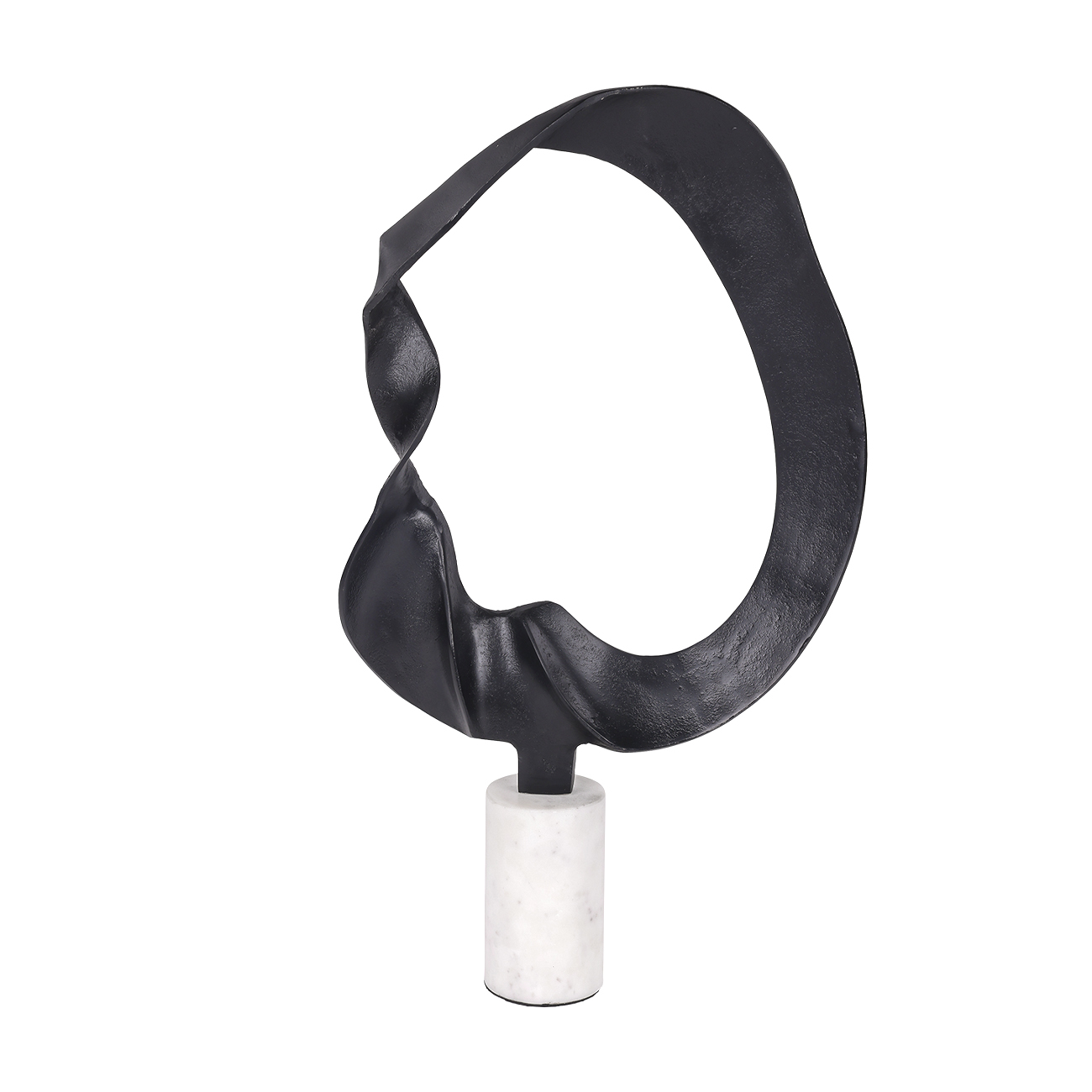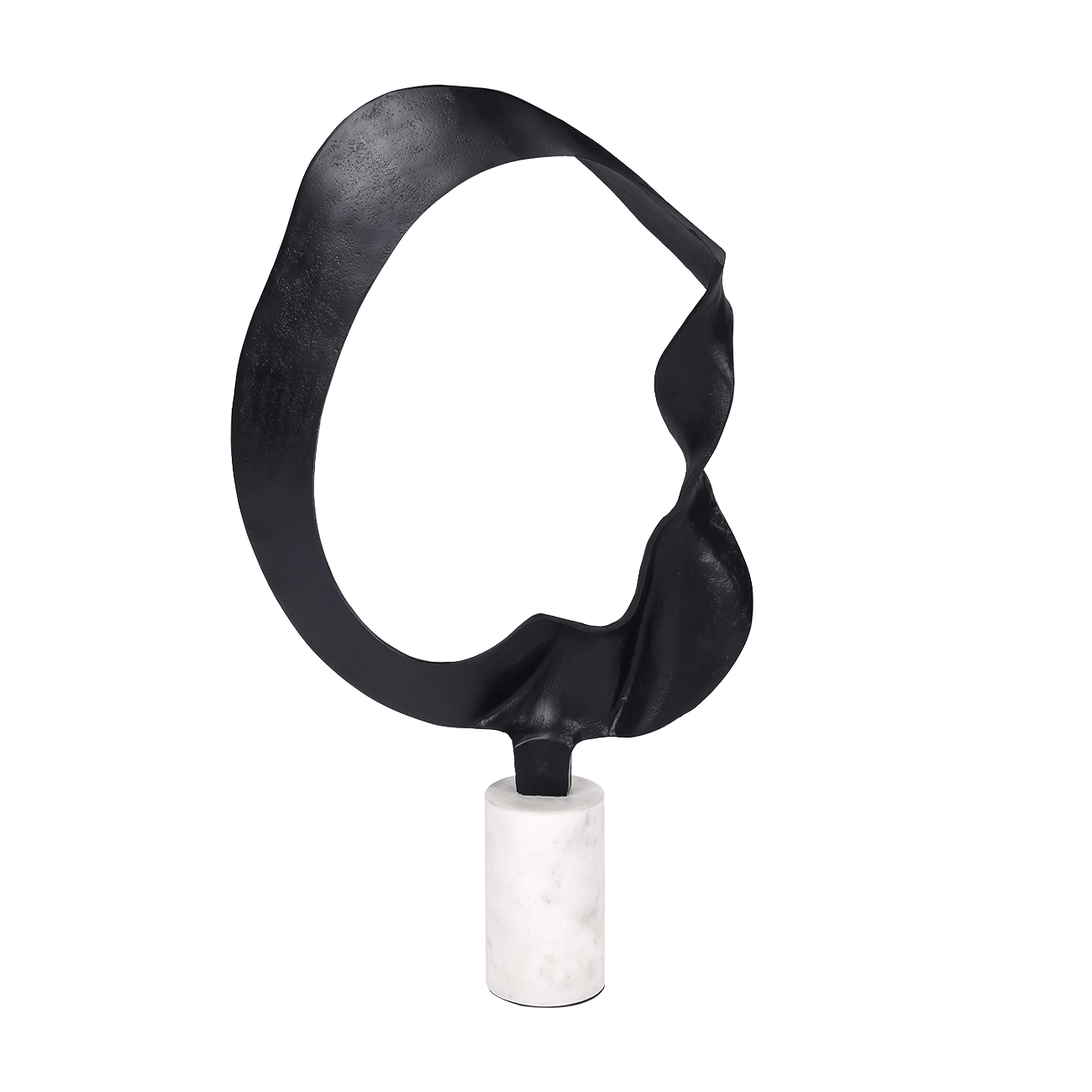 Striking in form and rich in texture, the Kentford Sculpture brings a bold, contemporary presence to any curated interior. Cast in aluminium with a deep matt black finish, its looping, abstract silhouette rests gracefully on a cylindrical base of smooth white marble. Subtle variations in the surface add depth and artisanal character, making each piece unique. Pair the Kentford Black with its Gold counterpart to explore a dialogue of contrast. Finish against finish, scale against scale. Designed for modern interiors that value both drama and refinement. Dimensions: W39 Ă— D9 Ă— H68 cm.