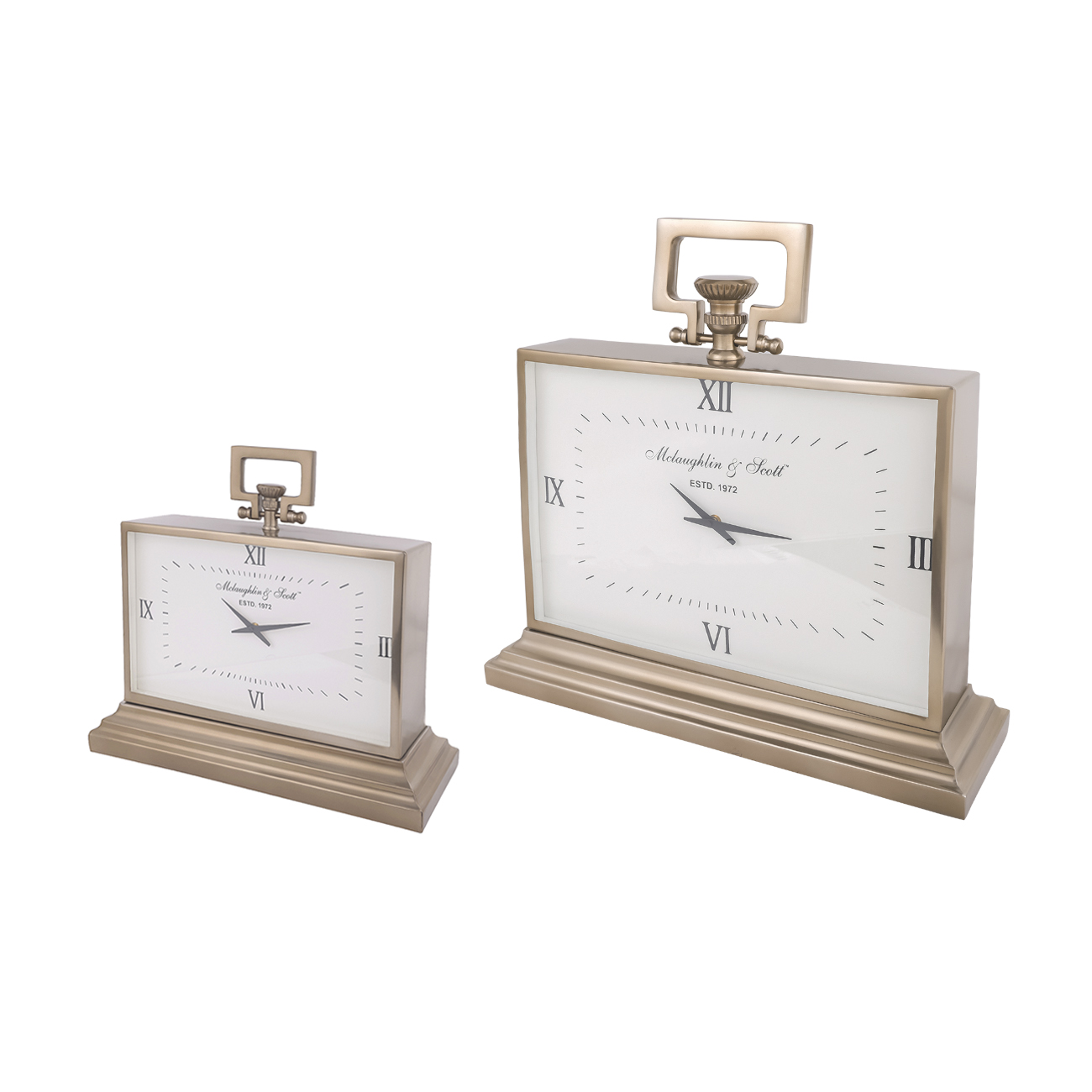 The refreshed large Latham Mantel Clock now comes in a warm brass finish, adding a subtle richness to its classic silhouette. Crafted from aluminium, stainless steel and glass, it rests on a stepped plinth and features traditional Roman numerals. The original design remains intact, with the new finish bringing a softer tone to contemporary interiors. Also available in a medium size. Both versions are offered in our signature nickel finish. Requires 1 Ă— AA battery (not included). Dimensions: 55 Ă— 18 Ă— 52 cm.