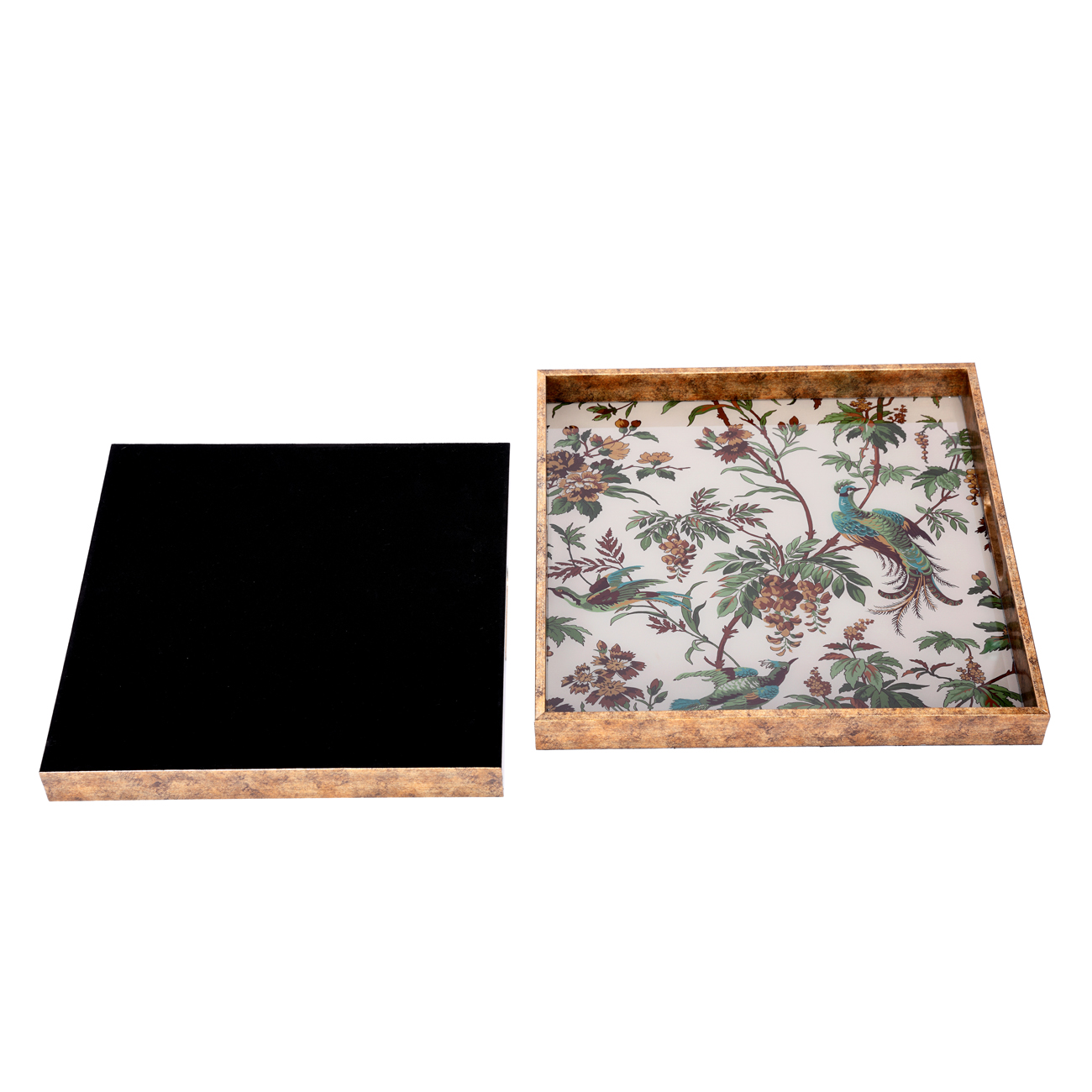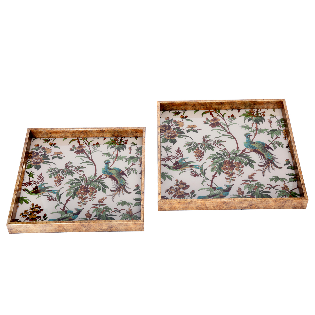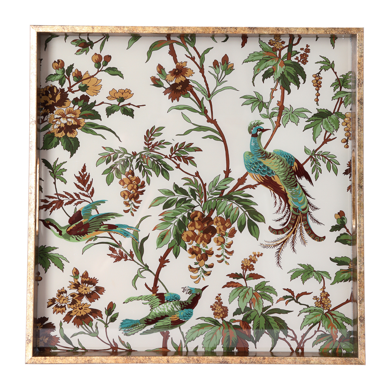 Elevate your home with this set of 2 Laura Ashley trays featuring the beautiful Attleton print. Undeniably elegant, Attleton is a gorgeous design featuring exotic birds amongst foliage and delicate florals. Held in the Laura Ashley archive, this charming and romantic design is perfect for interiors that exude elegance and evokes the beauty of nature with a timeless, sophisticated charm. The antique gold edging adds a soft, luxurious warmth, making these trays ideal for both serving and display. Dimensions: 40 x 40 x 4cm
