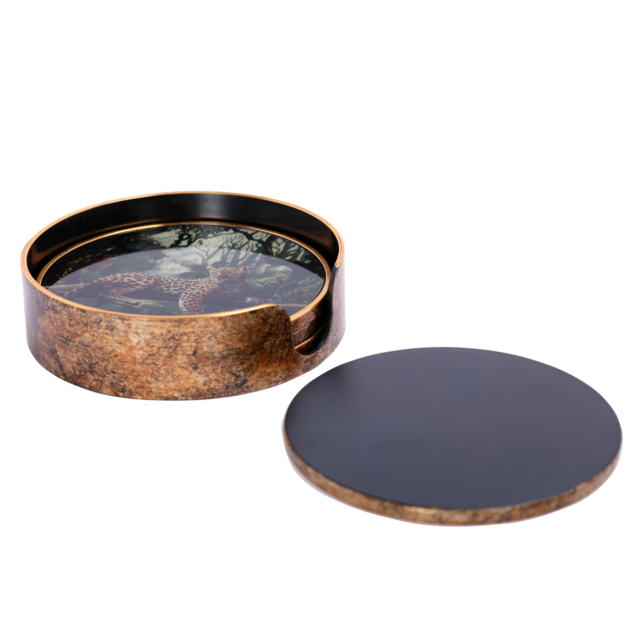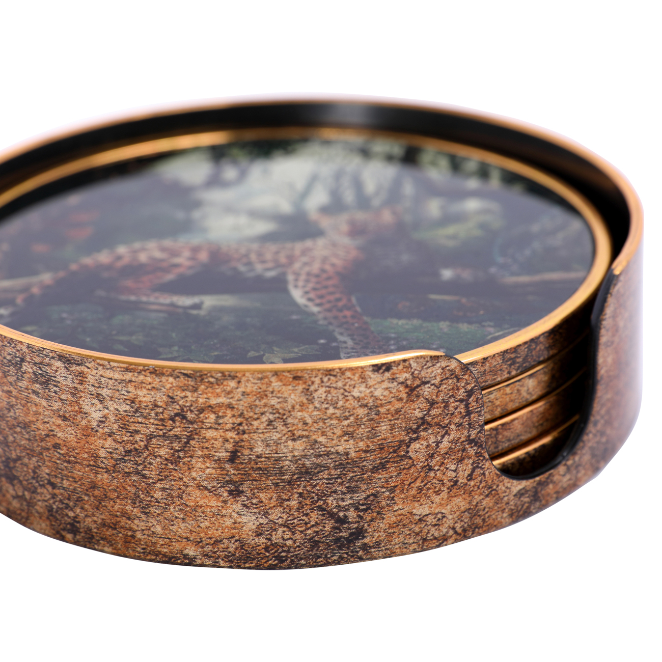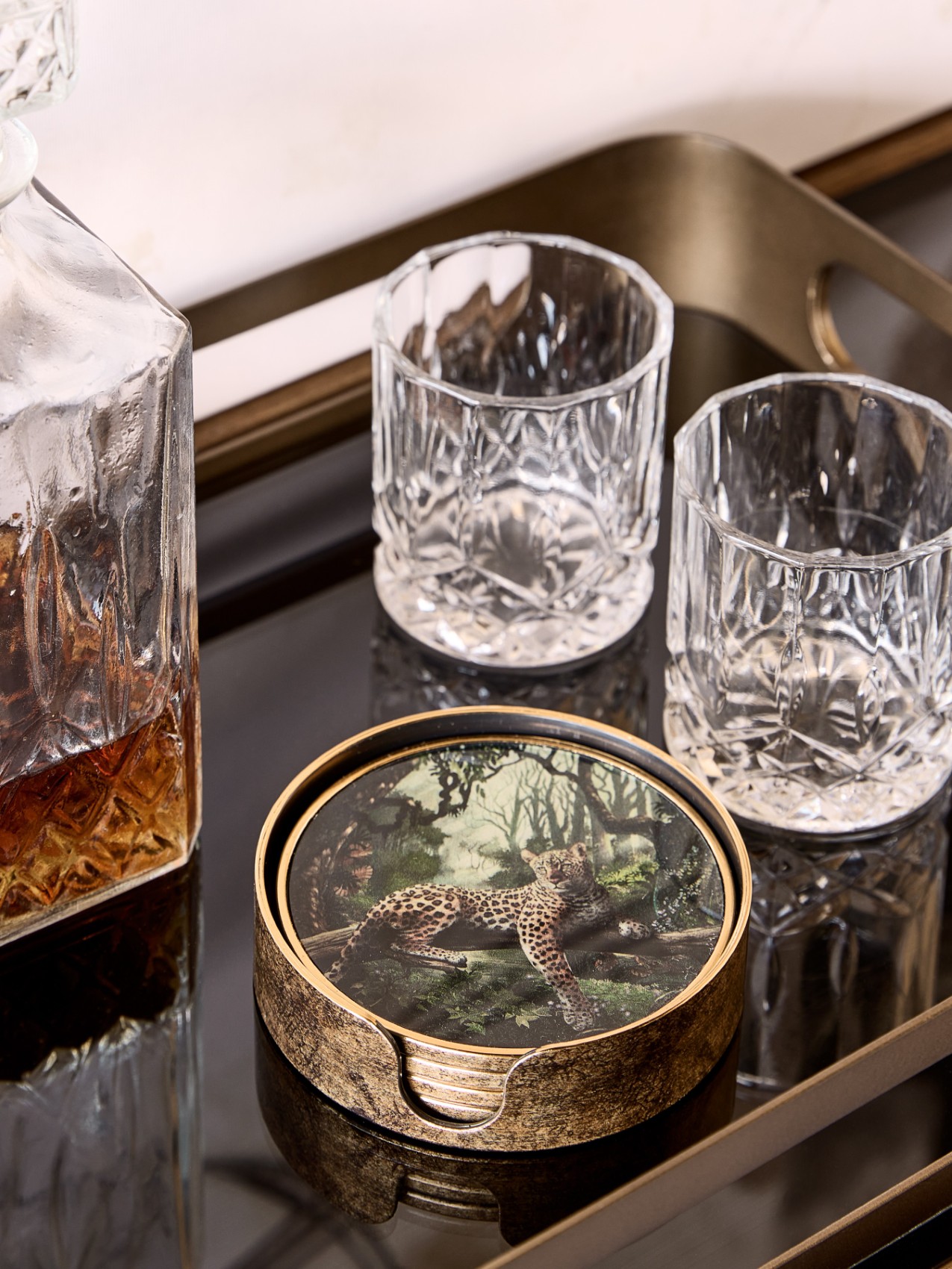 Bring a practical touch of pattern to your surface styling with this set of four coasters from the Lounging Leopard collection. Each round coaster features a vivid jungle illustration framed by a painted antique gold-effect rim, with a smooth top that’s easy to wipe clean. Designed to complement the matching tray set, these coasters are a decorative and functional addition, ideal for protecting tabletops from heat and moisture while tying your scheme together. Other items in the Lounging Leopard collection include a set of nesting tray tables and a set of 2 trays for a cohesive, layered look. Dimensions: 11 x 11 x 3cm