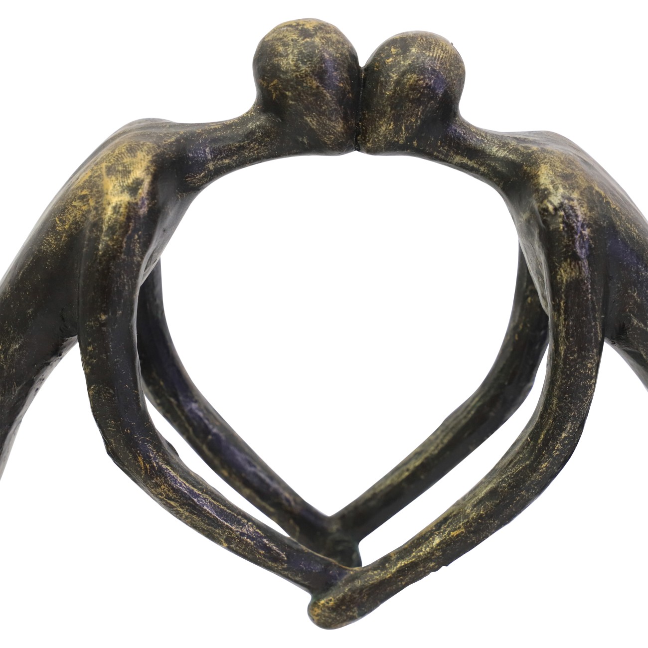 Lovers Heart Sculpture—A beautifully romantic representation of love and connection, this sculpture captures a pair of lovers standing close together, their silhouettes forming the shape of a heart as they share a tender kiss and hold hands. Cast in high-quality resin and finished with a rich antique bronze coating, the sculpture is elegantly grounded by a sleek matt black base. Whether displayed on a mantel, shelf, or tabletop, it serves as a striking focal point, celebrating both the strength of love and the delicate tenderness of a shared kiss.