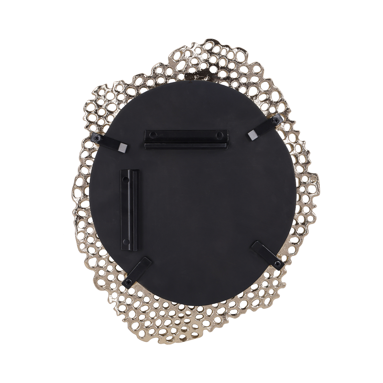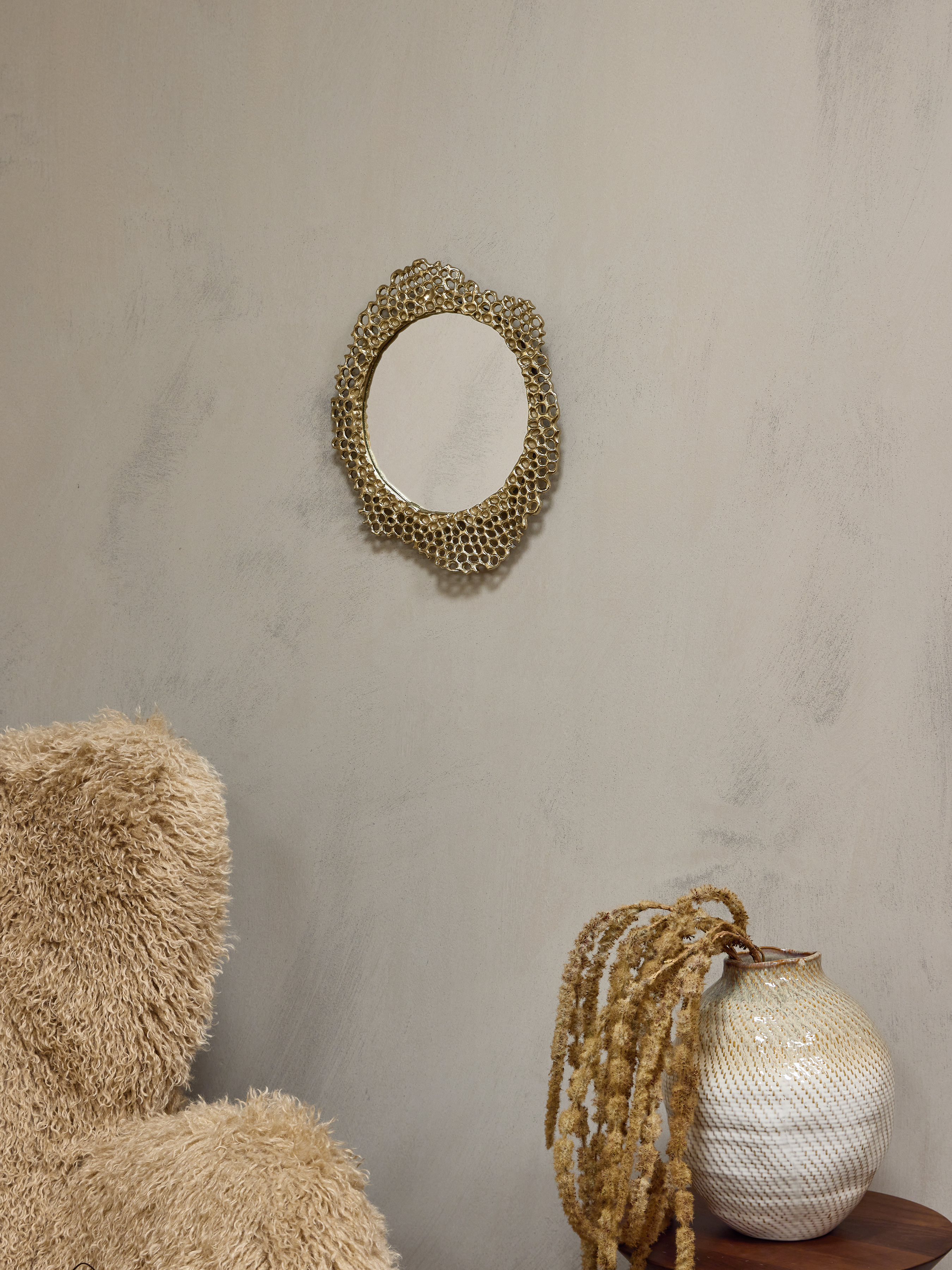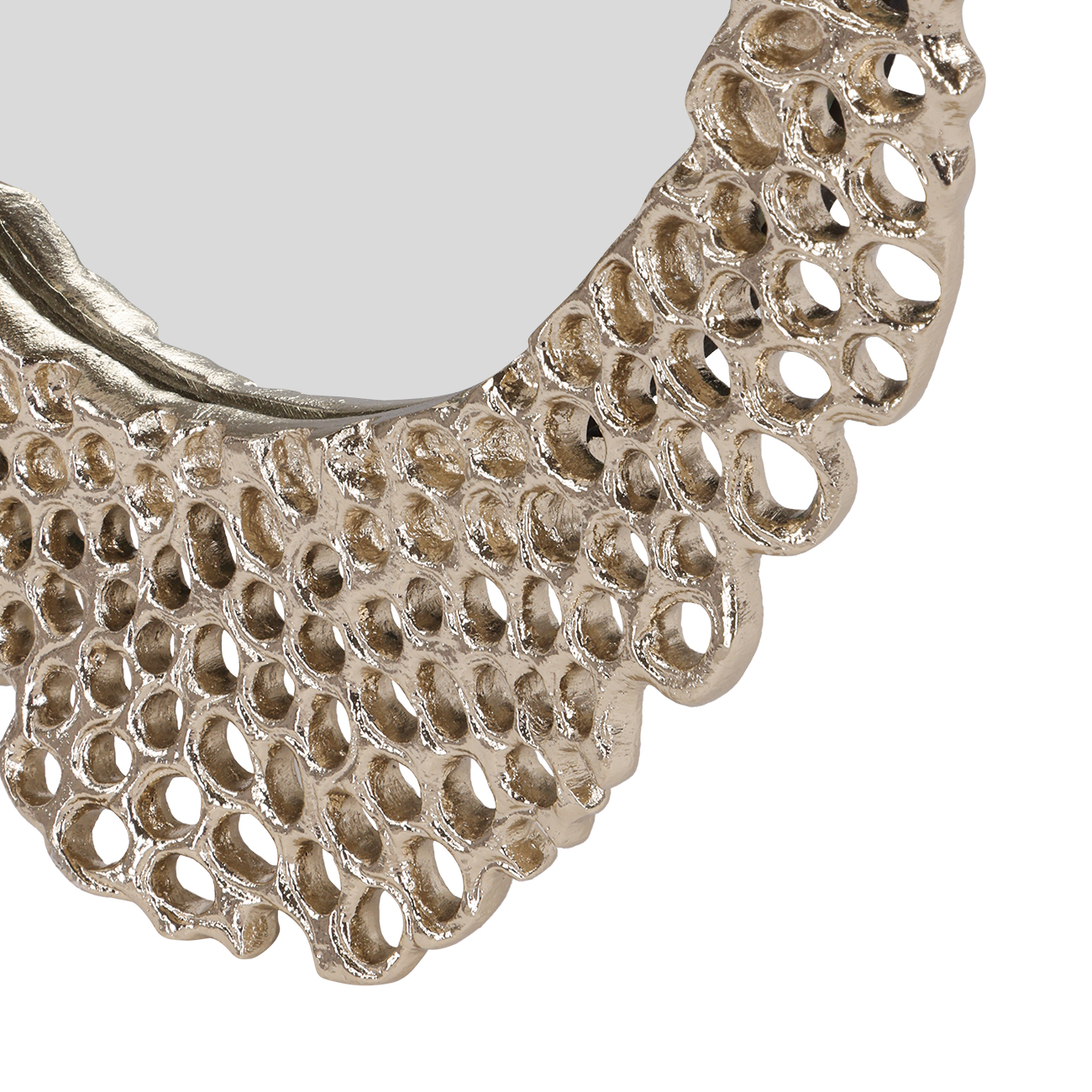 Organic form meets functional design in the small Miel Cast Aluminium Mirror. Sculpted in cast aluminium with a warm gold-toned finish, its openwork, lace-like silhouette evokes natural honeycomb patterns. The irregular edge and soft metallic sheen bring artisanal texture and subtle depth to the wall. A bold yet refined statement, ideal for enhancing hallway consoles or layered gallery walls. Hangs portrait or landscape. W31.5 x D3 x H40 cm. Style solo or layer with the matching medium and large mirrors. Part of the wider Miel collection, which also includes coordinating photo frames and a decorative platter.
