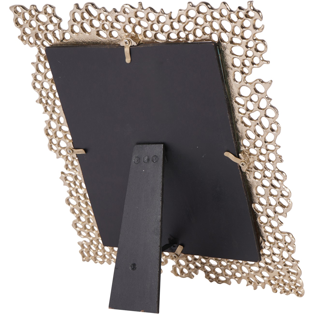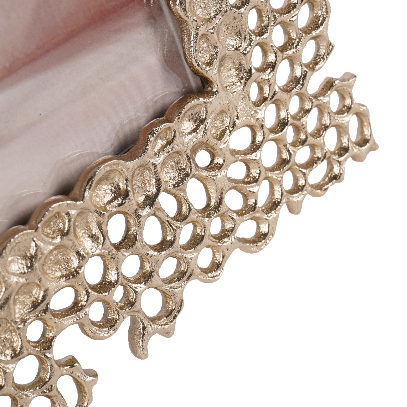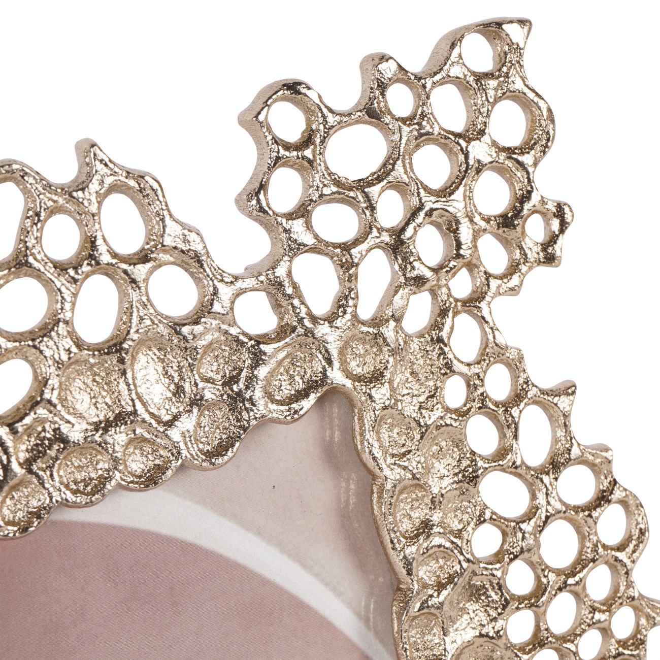 Miel Cast Aluminium Photo Frame 8x10 Made from champagne gold-coloured, handcrafted cast aluminium, this frame features a design that depicts an organic-shaped honeycomb pattern. Perfect for food and nature lovers, the collection includes two photo frames and a matching decorative platter. This frame is thoughtfully designed for portrait orientation only.