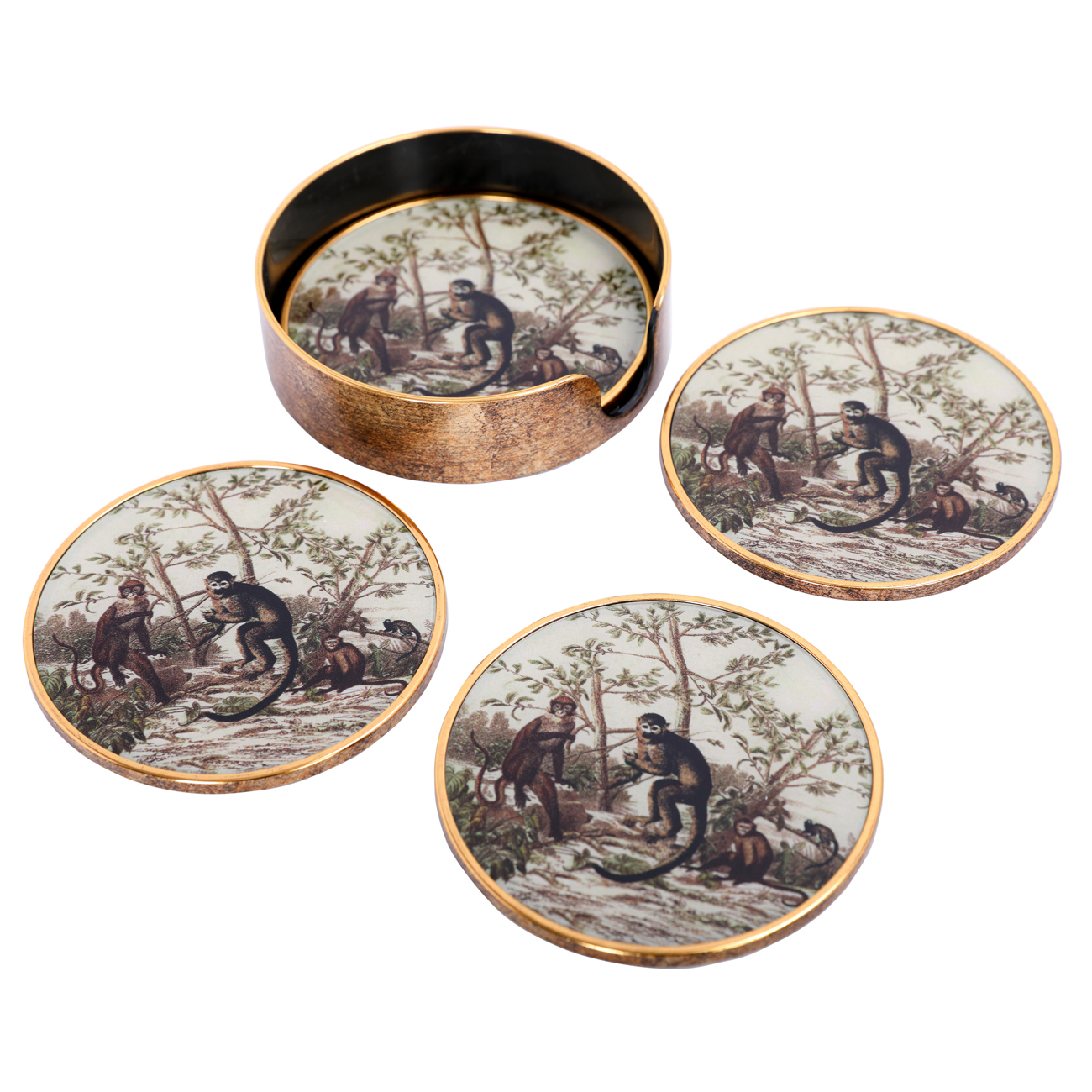 A fun finishing touch for coffee tables, each coaster in this set of four features a miniature version of our vintage-style jungle monkey print. Complete with a matching holder in an antique gold-effect finish, they’re perfect for gifting or styling alongside the coordinating trays and side tables. Style as part of the Monkey Jungle collection to bring a touch of playful sophistication to entertaining spaces. Dimensions: 11 x 11 x 3cm