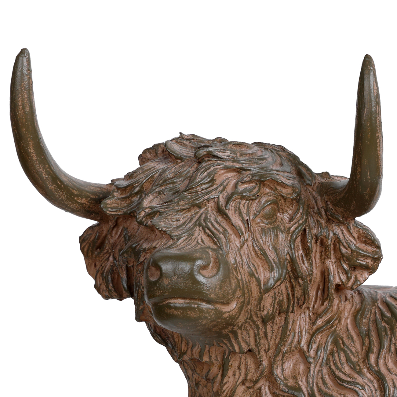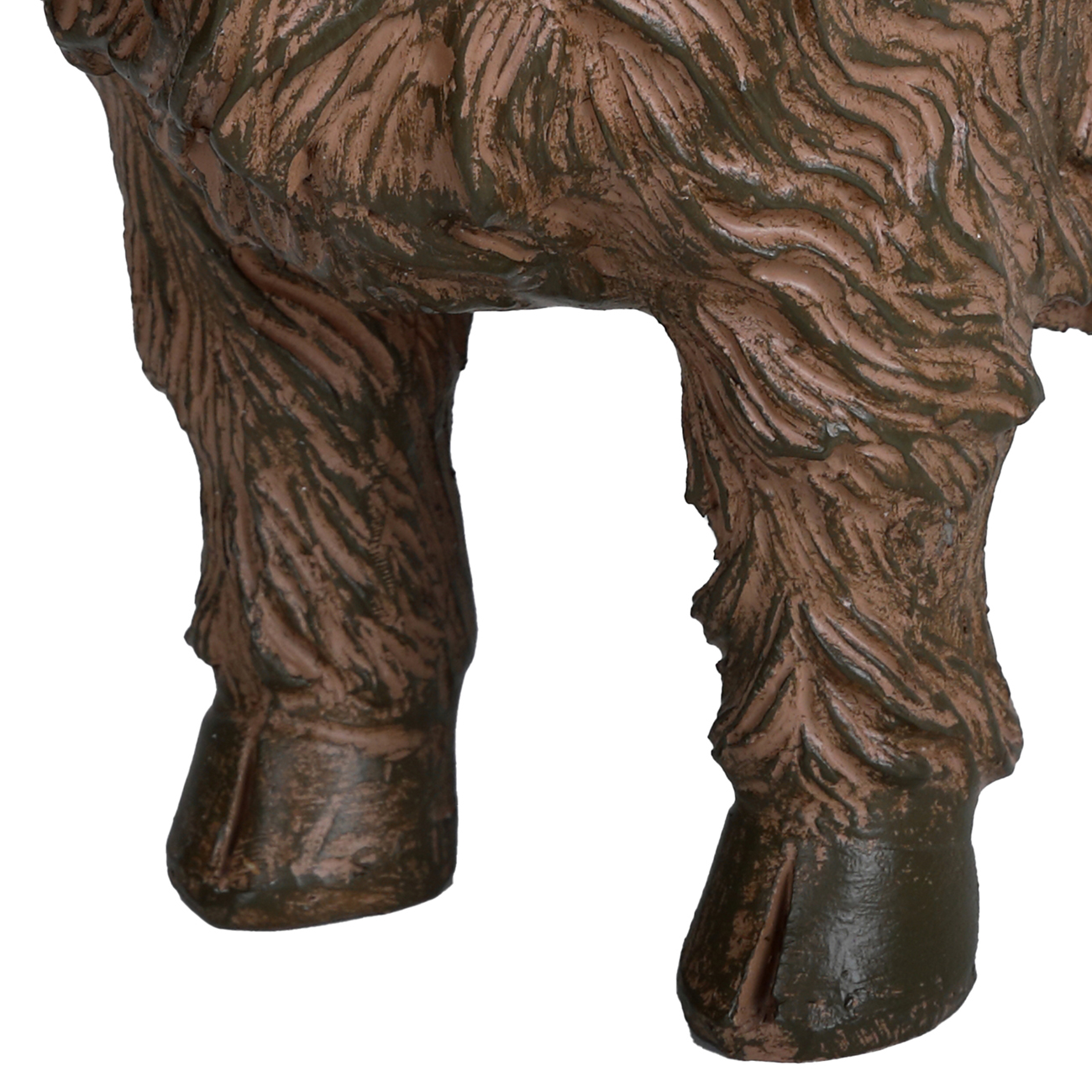 Evoking the distinctive character of the Highland breed, this rustic sculpture captures the flowing coat and sturdy stance of a horned cow in textured, lifelike detail. Cast from a durable mix of polyresin and limestone, its form is enriched with a rough, rust-toned finish that accentuates deep carvings and expressive contours. Proud and grounded, this piece brings countryside authenticity to bookshelves, sideboards, or layered vignettes. Pair it with the coordinating Mac Rustic Highland Cow Wall Sculpture for a cohesive look that blends form and texture across surfaces and walls. Dimensions: W34.4 x D15 x H30 cm