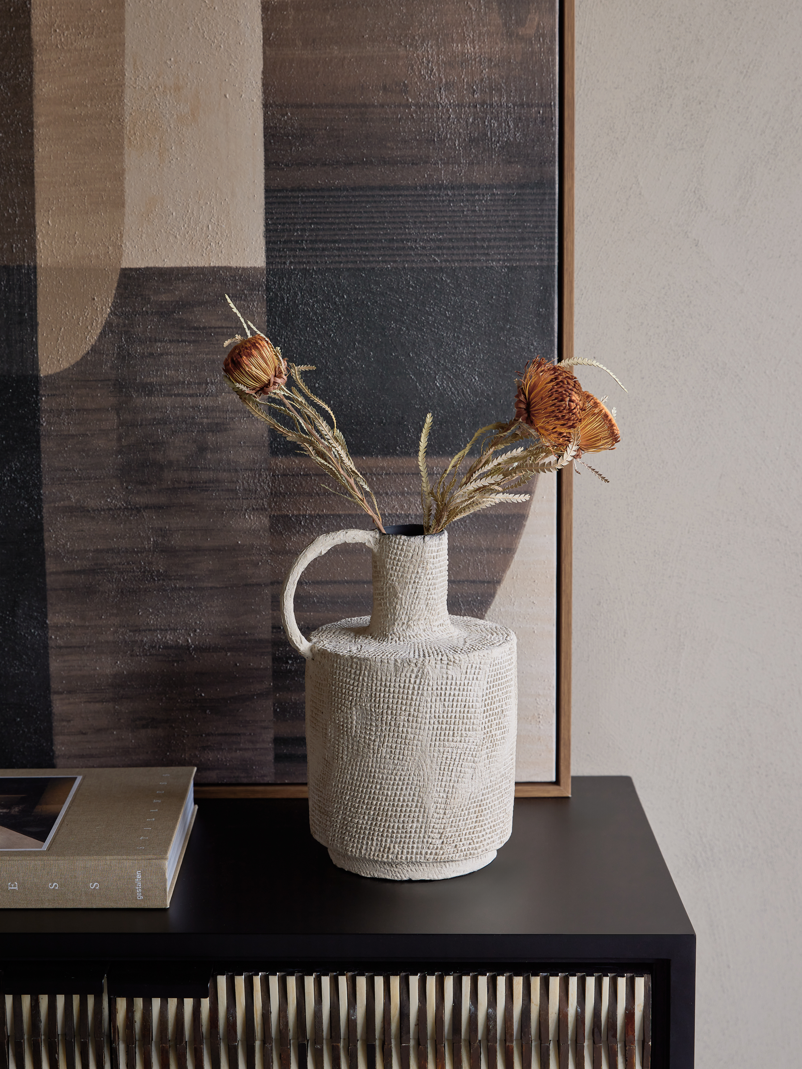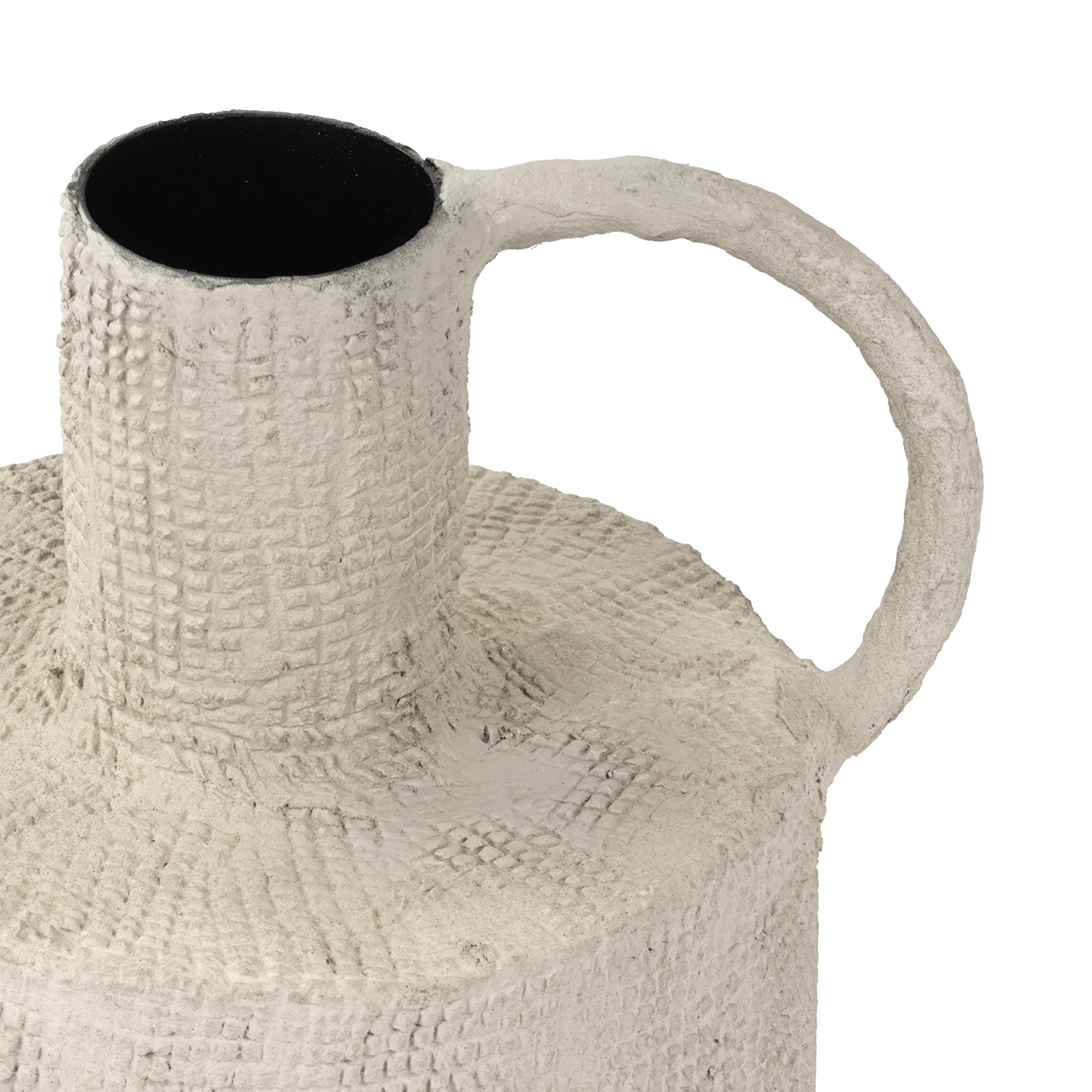 A sculptural statement with a handcrafted feel, the Navi Barrel Textured Vase brings organic warmth to your interior styling. Its rounded silhouette is formed in lightweight iron and coated in a papier-mâché finish, offering a raw, woven texture in a natural beige tone. A generous handle adds visual balance, while the neutral palette, softly textured surface and crafted finish make it perfectly in tune with today’s interior trends. Style with the Teardrop vase for a relaxed and layered look. Not water tight. For decorative use only. W18 x D16 x H26 cm