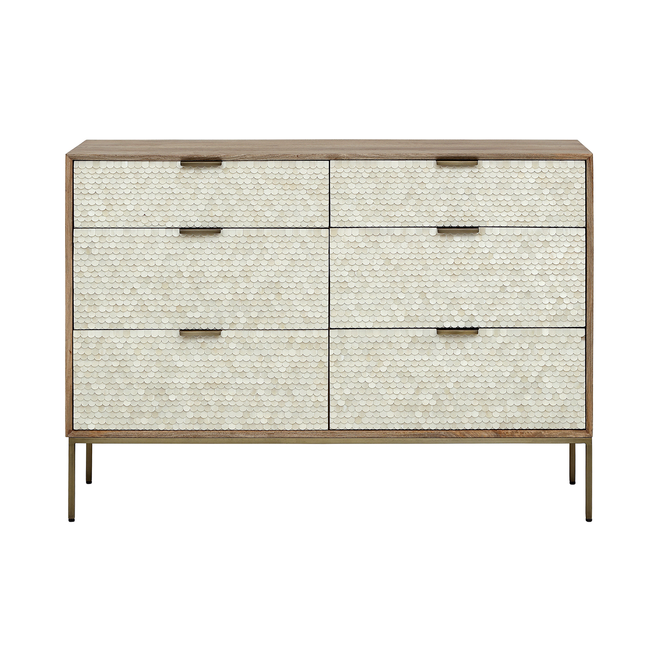 Elegant and tactile, the Nerida Bone Inlay Chest of Drawers brings soft texture and natural warmth to contemporary interiors. Its scalloped bone inlay is meticulously handcrafted, creating a subtle, light-catching pattern that embodies today’s move toward tactile minimalism and organic luxury. A warm mango wood frame and antique brass accents ground the design with modern simplicity, while generous drawer storage keeps spaces calm and ordered. Pair with the Nerida Bedside and Desk for a cohesive look. W127 x D45 x H90cm. Drawer size W55.5 x D34cm.
