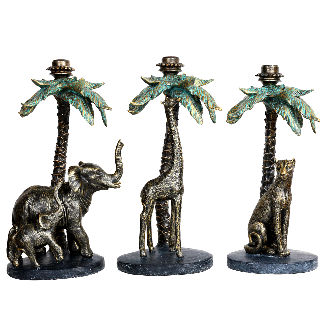 Grounded and poised, the leopard candle holder brings a calm presence to this distinctive series. Seated beneath the spread of a gently textured palm, the leopard is rendered in antique gold with softened, tactile fur detailing. The sculpted trunk and verdigris leaves frame the piece, offering vertical interest and contrast. Crafted in polyresin and limestone with a gently aged finish, this piece is a considered decorative accent. Made to hold a single taper candle, it can be styled solo or with the matching elephant and giraffe candle sticks to create a cohesive story of texture, form and quiet drama. Dimensions: W15.4 x D14.6 x H33.8 cm