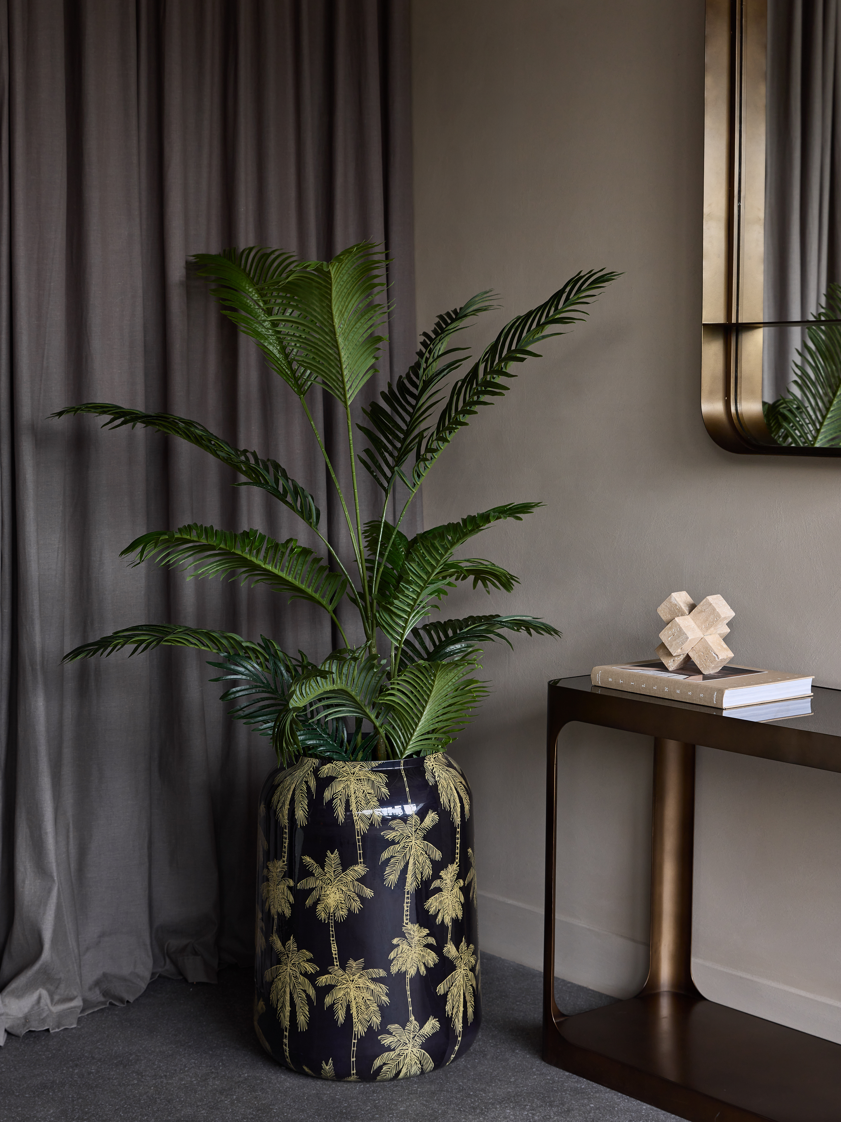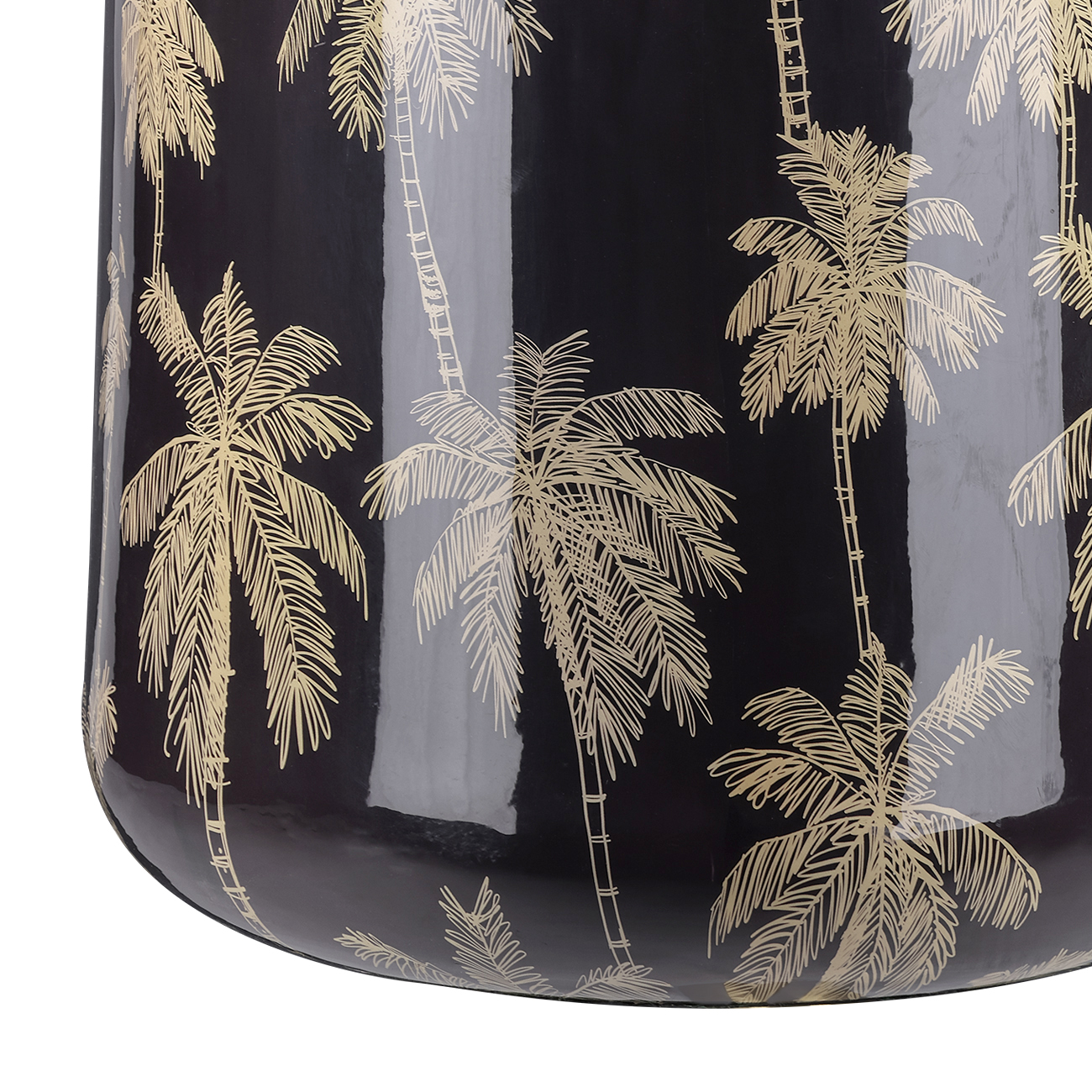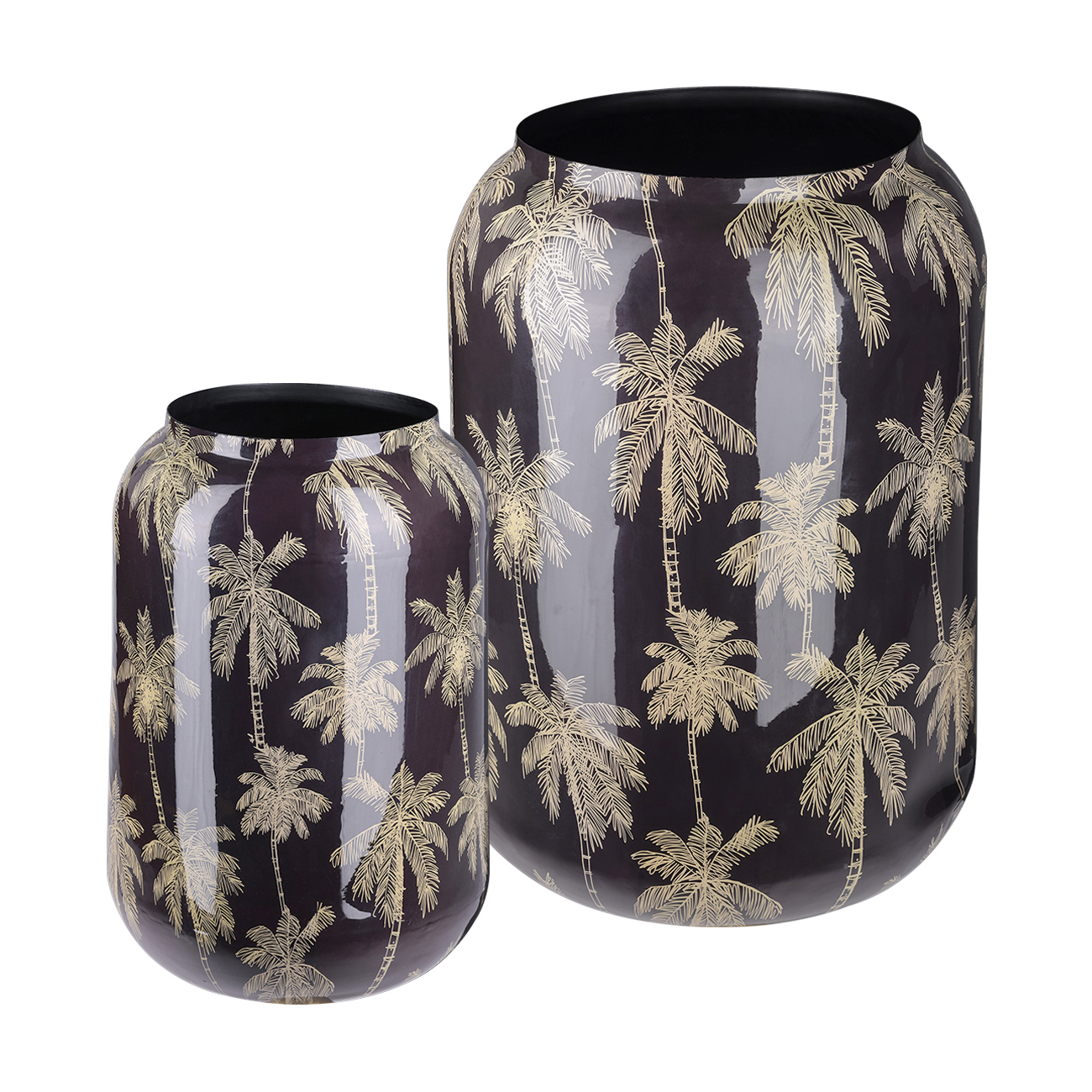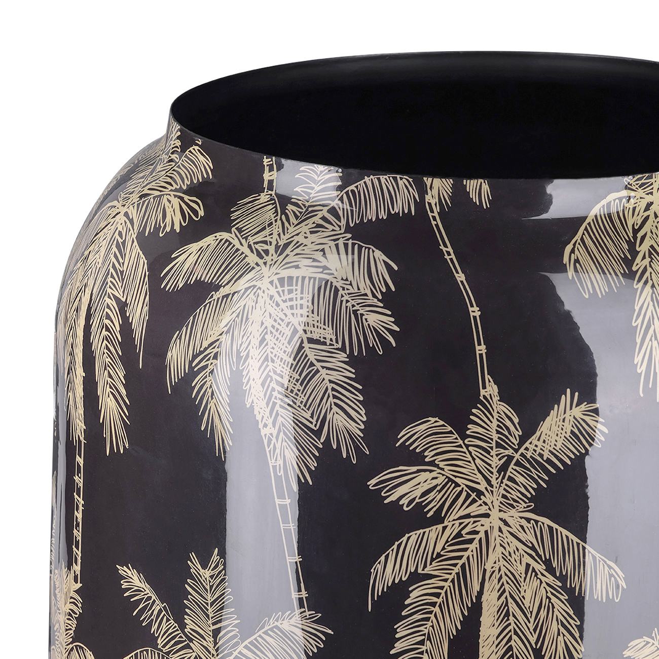 A striking decorative piece, the Palm Large Vase stands 62cm tall and features a sleek silhouette wrapped in a shimmering gold palm tree motif. The print is applied to an iron base and finished with an enamel coating for a smooth, polished look. Rich in detail and exclusive to Libra, it brings contemporary pattern and shine to any interior. A plastic liner is recommended to protect against water damage. Also available in a smaller size. Style as a pair or display individually for impact. Dimensions: W76.5 x D76.5 x H62 cm