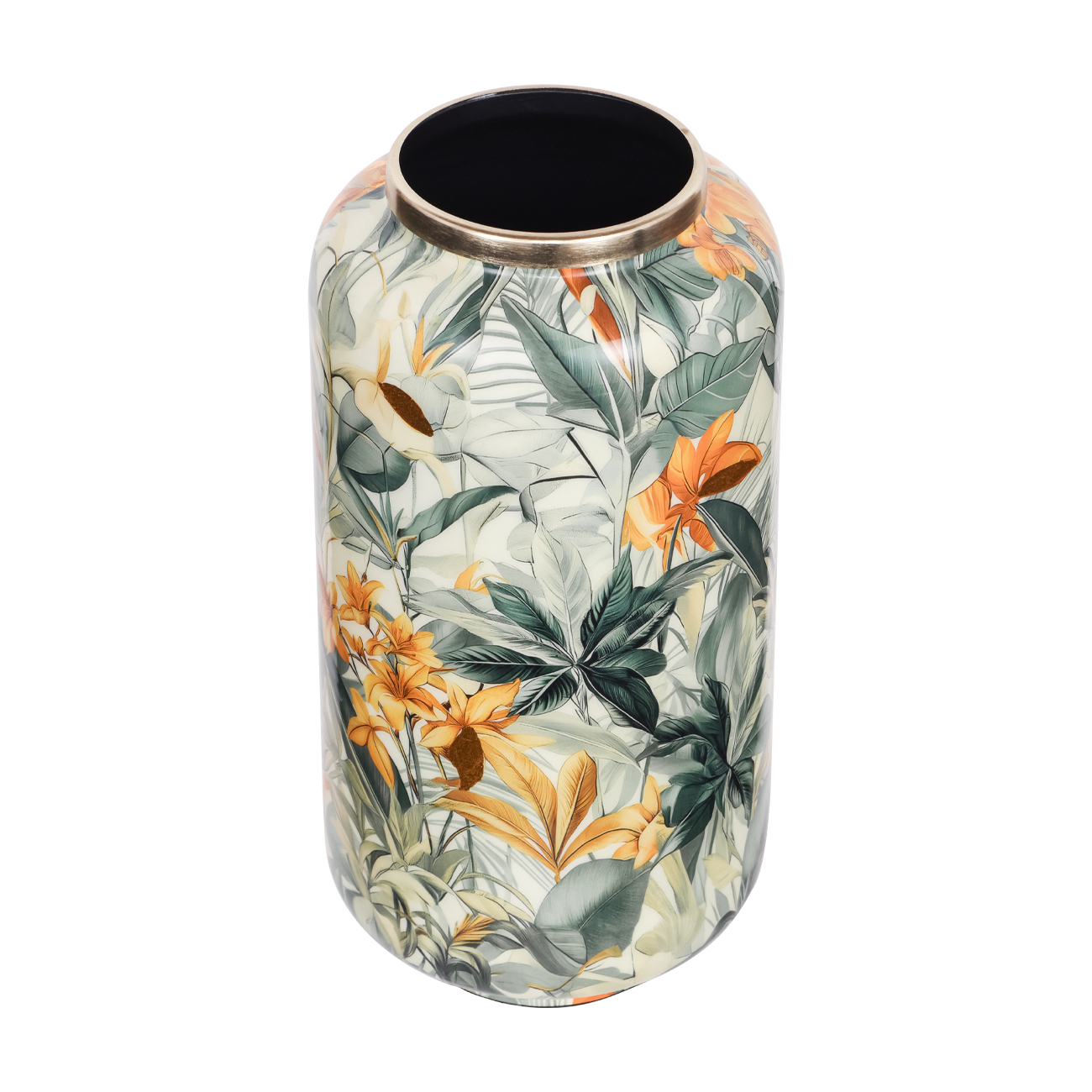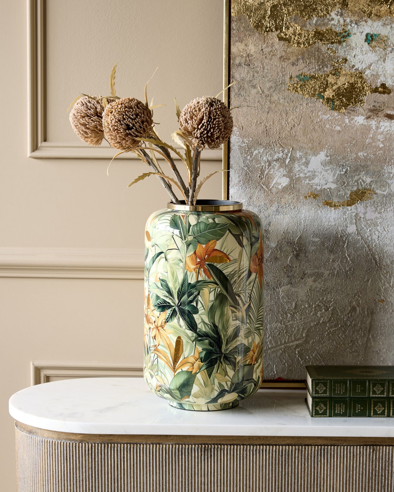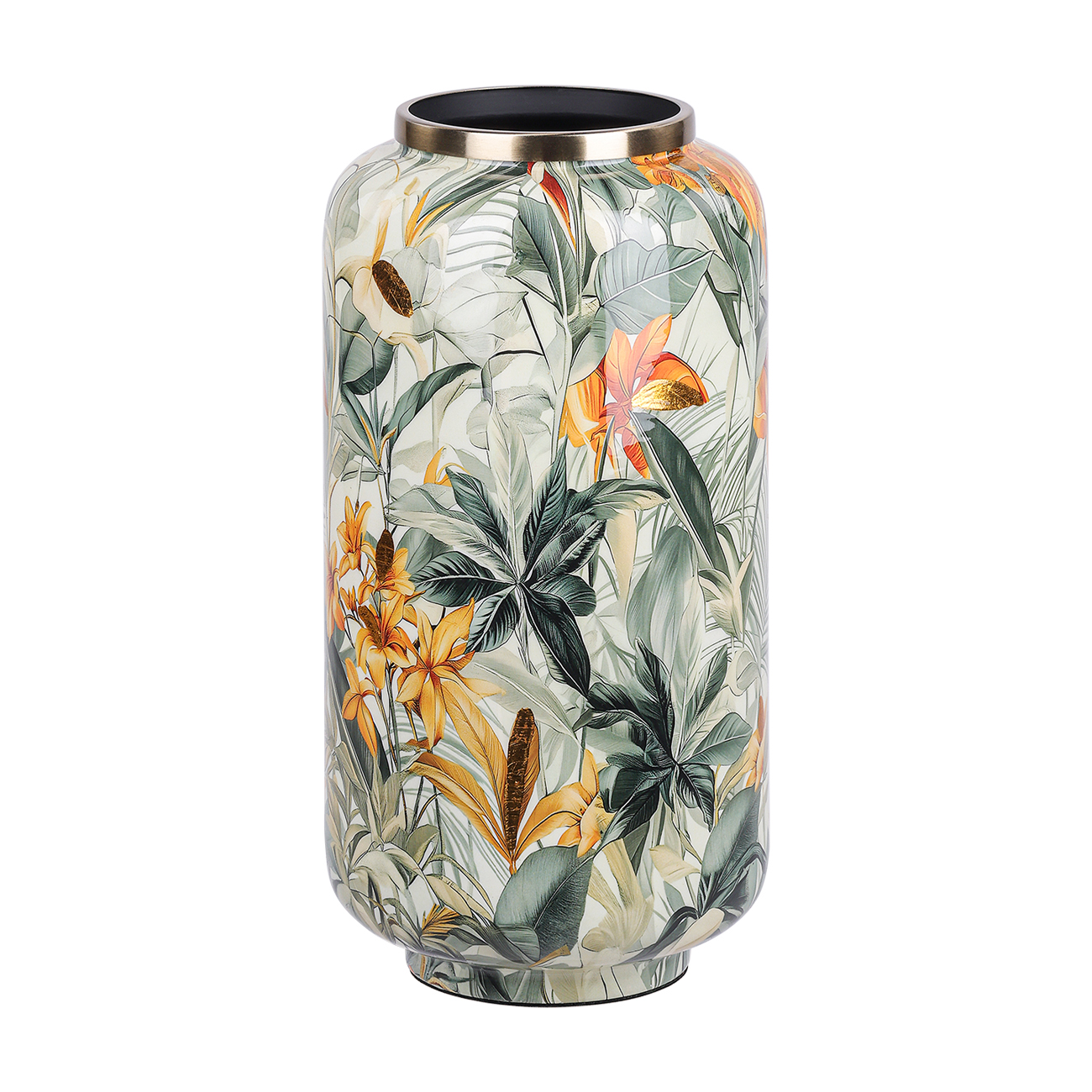 A fresh and uplifting accent piece, the Paradise Small Vase stands 35cm high and features a vibrant floral design in tones of citrus, coral and soft green. The botanical print is carefully applied to an iron base and sealed with a high-gloss enamel finish. A slim metallic trim at the neck adds a refined touch. A plastic liner is recommended to protect against water damage. Also available in a larger size. Style as a pair or display individually for impact. Exclusive to Libra's retail channel. Dimensions: W21 x D21 x H35 cm