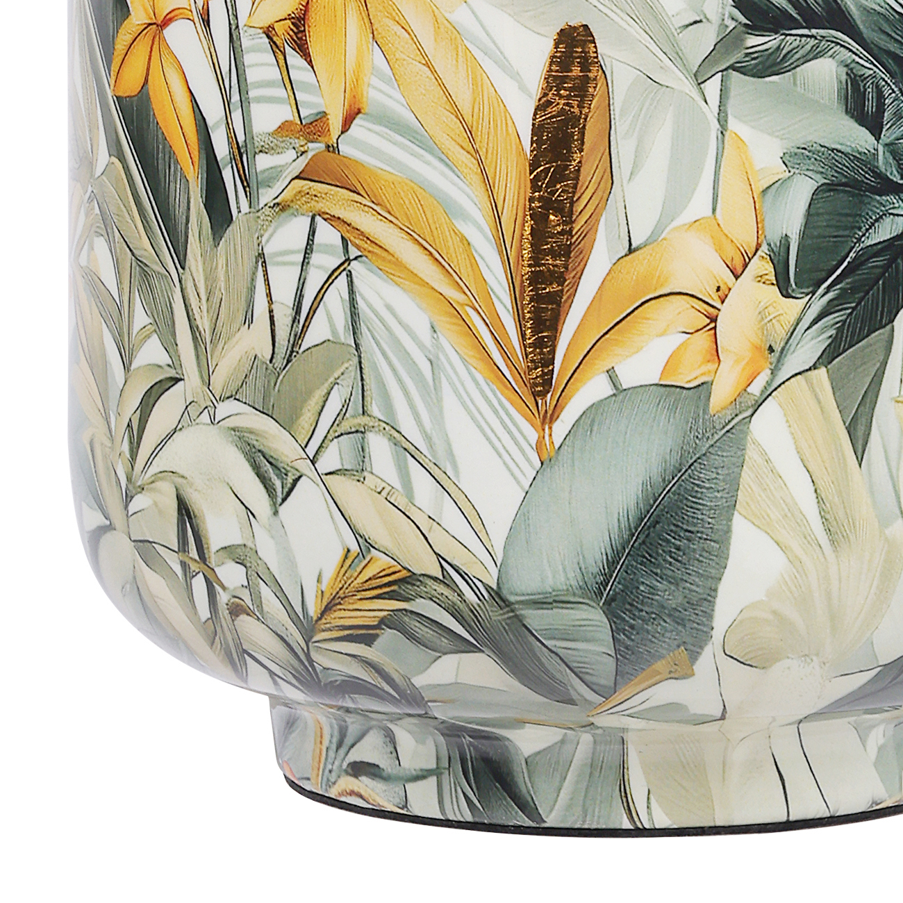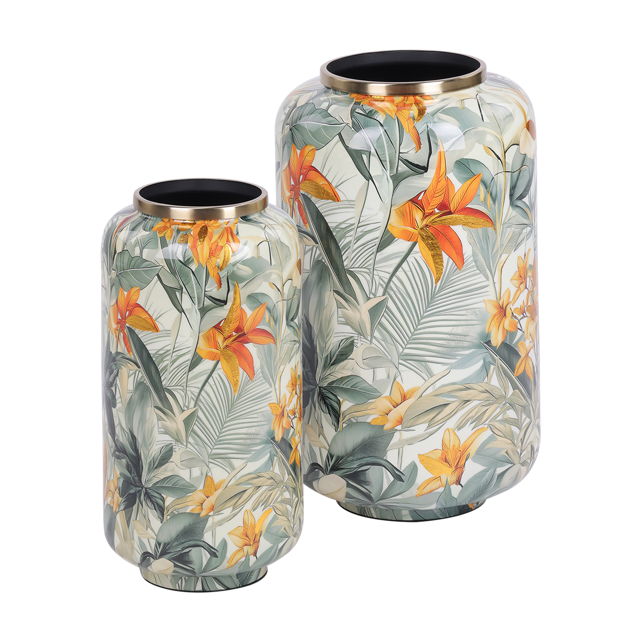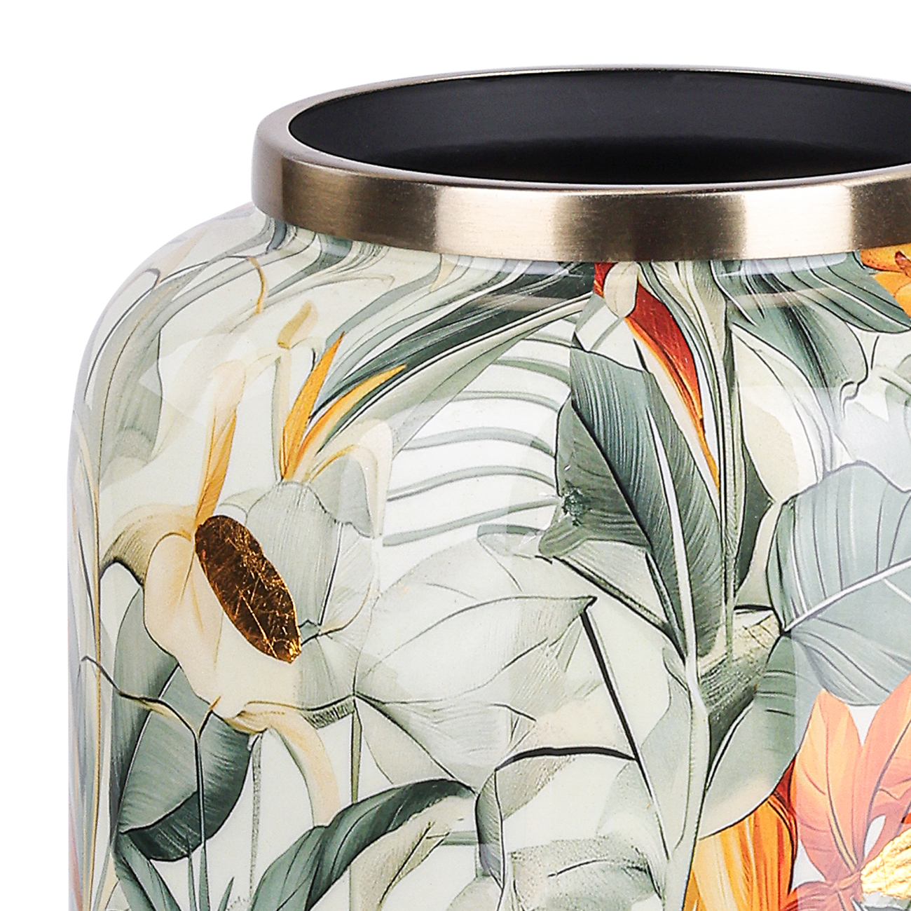 A fresh and uplifting accent piece, the Paradise Small Vase stands 35cm high and features a vibrant floral design in tones of citrus, coral and soft green. The botanical print is carefully applied to an iron base and sealed with a high-gloss enamel finish. A slim metallic trim at the neck adds a refined touch. A plastic liner is recommended to protect against water damage. Also available in a larger size. Style as a pair or display individually for impact. Exclusive to Libra's retail channel. Dimensions: W21 x D21 x H35 cm