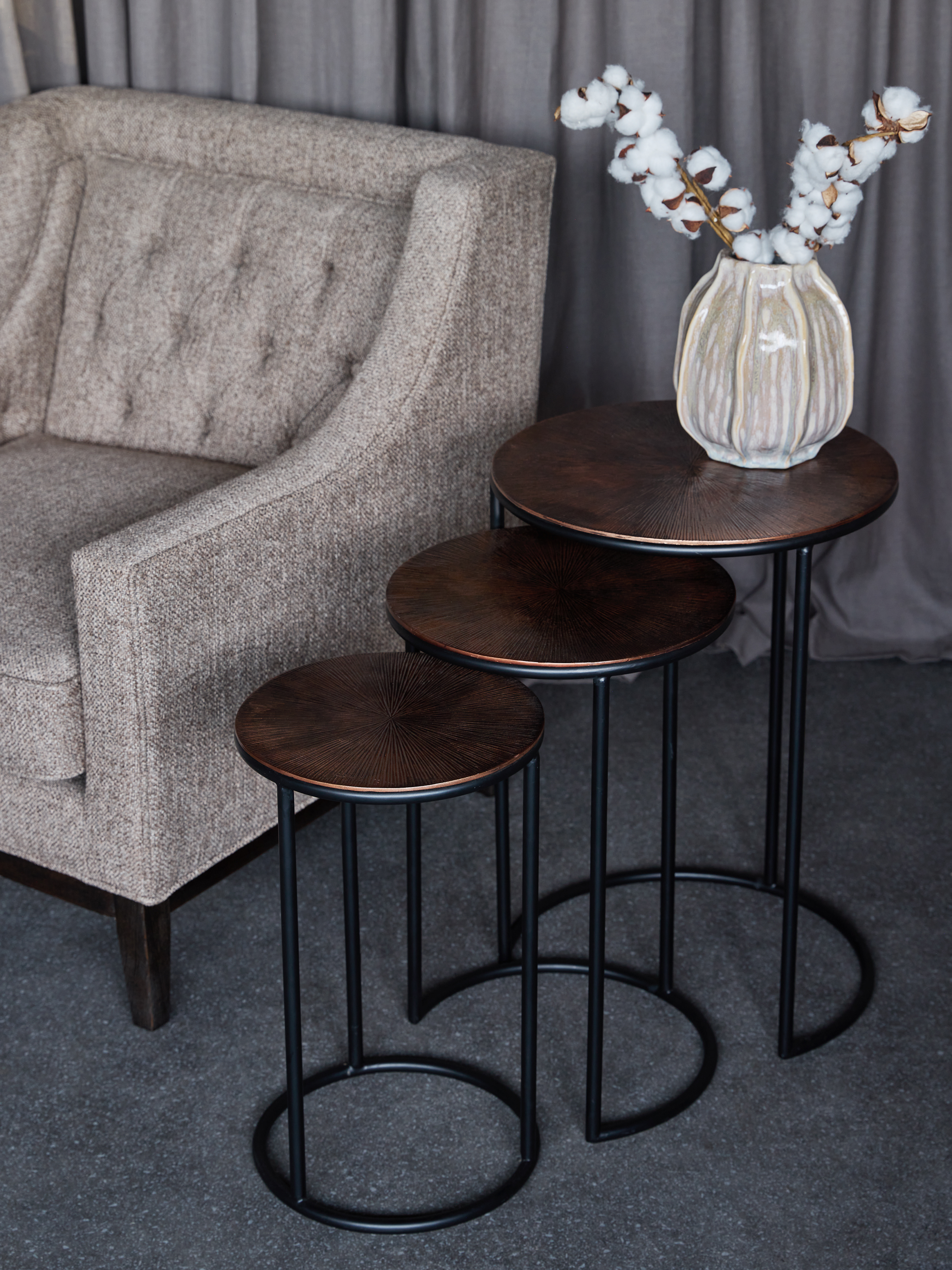 With tops cast in aluminium and finished in a warm rustic copper tone, the Tambora Nesting Tables combine sculptural texture with practical versatility. Each smooth surface carries a fine radial ribbed pattern that catches the light, adding quiet movement to the design. Slim black frames lend a grounded, graphic simplicity, allowing the trio to nest neatly together or stand individually. Well-suited to both layered styling and space-conscious interiors. Dimensions - Small: 31 x 31 x 50 cm; Medium: 36 x 36 x 57 cm; Large: 44 x 44 x 63 cm.