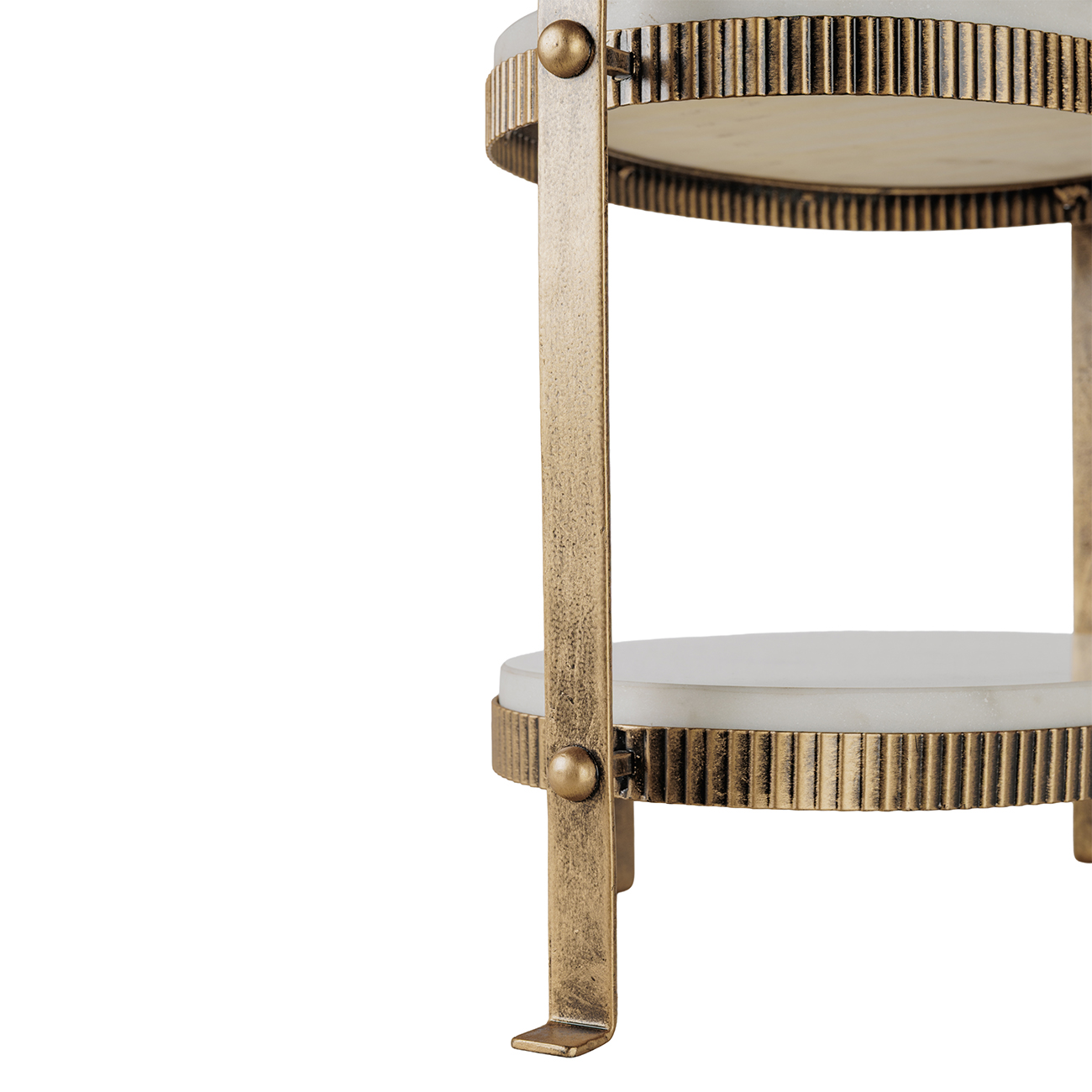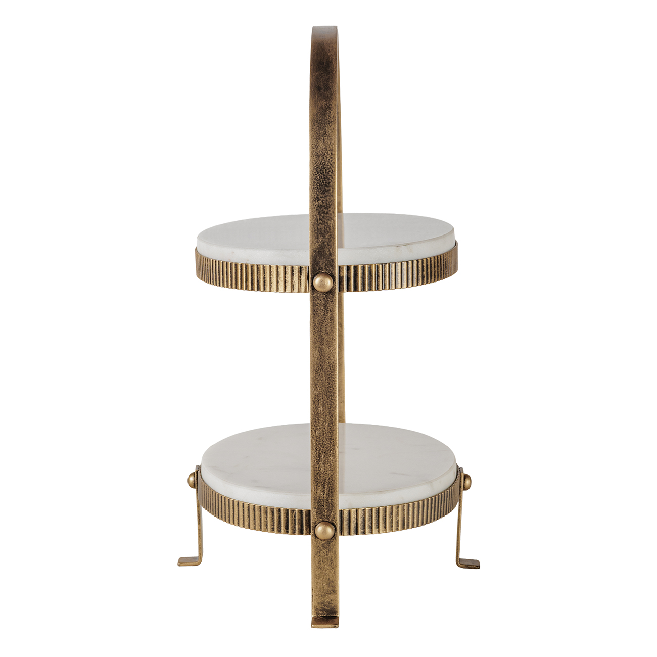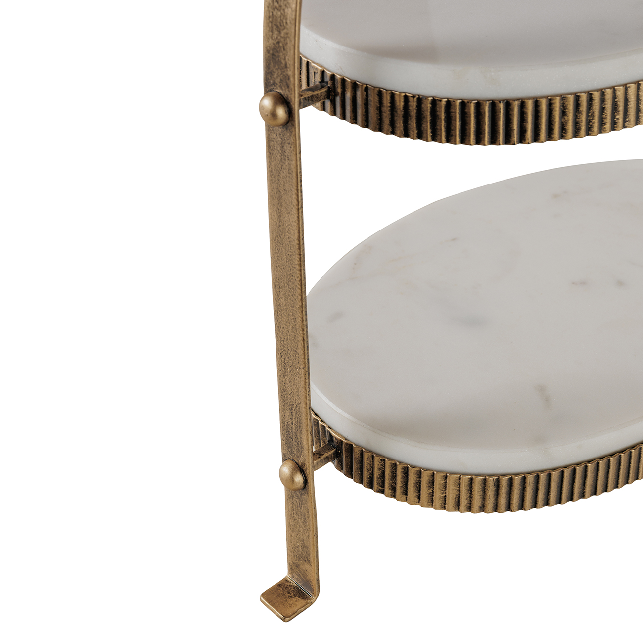 Elegant serving ware for curated gatherings, this two-tier stand is sculpted from White Banswara marble with soft corrugation that contrasts wonderfully with the marble. The natural variation in our food safe marble means each tier is quietly unique. An aged antique gold frame traces a graceful profile, bringing height and poise to dining or display. Whether styled for an afternoon tea or used to display treasured items, our two tier stand offers practicality and refined occasion. Also available in this finish is the Belvedere Aged Gold Oval Platter. Dimensions: 36 Ă— 25 Ă— 44.5 cm.
