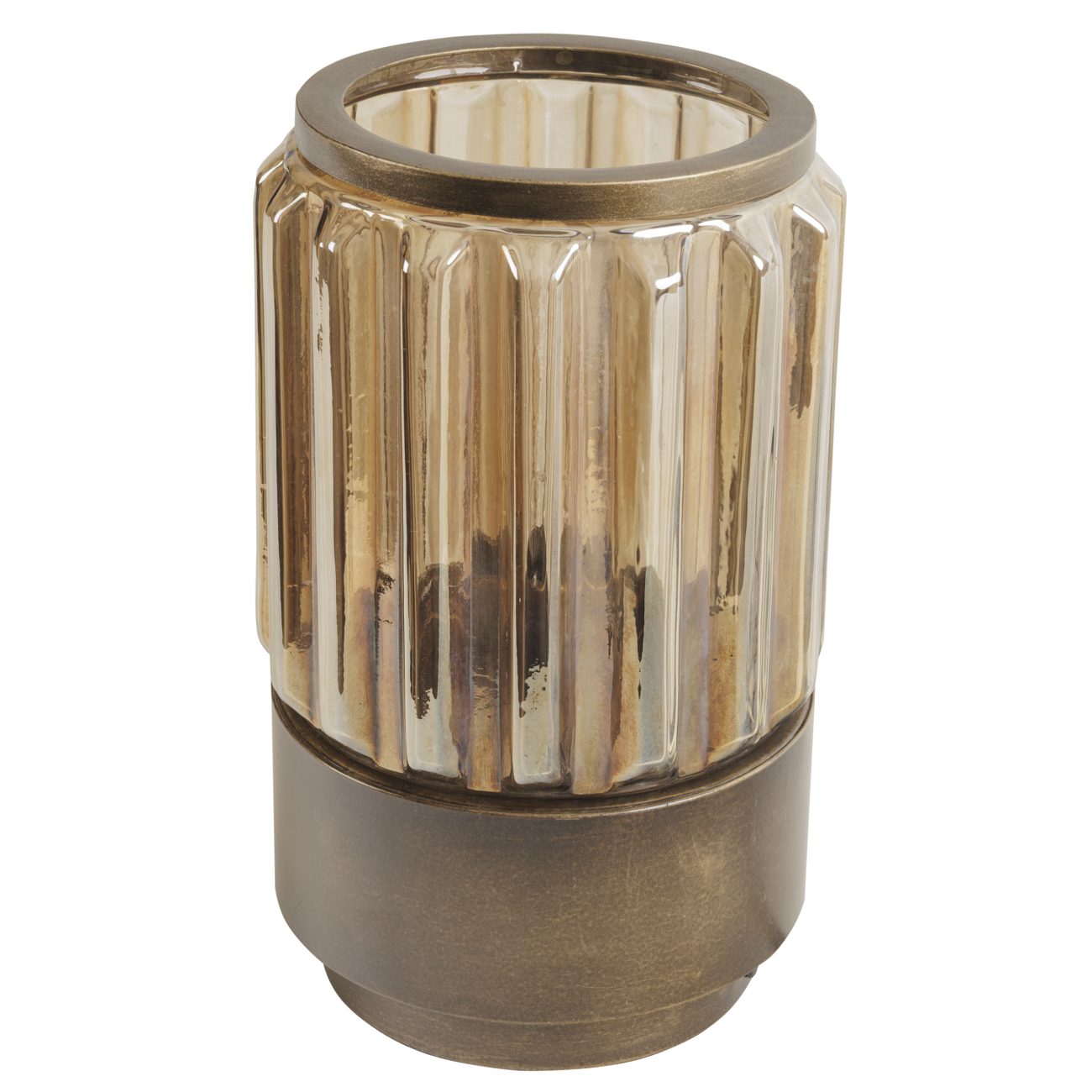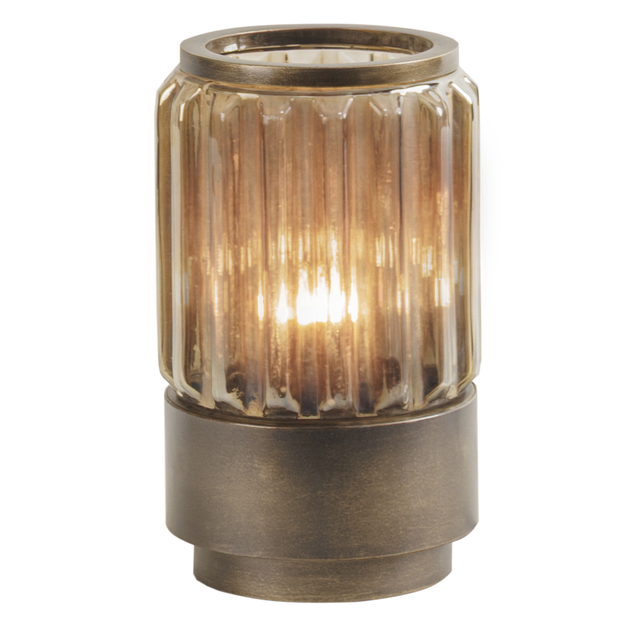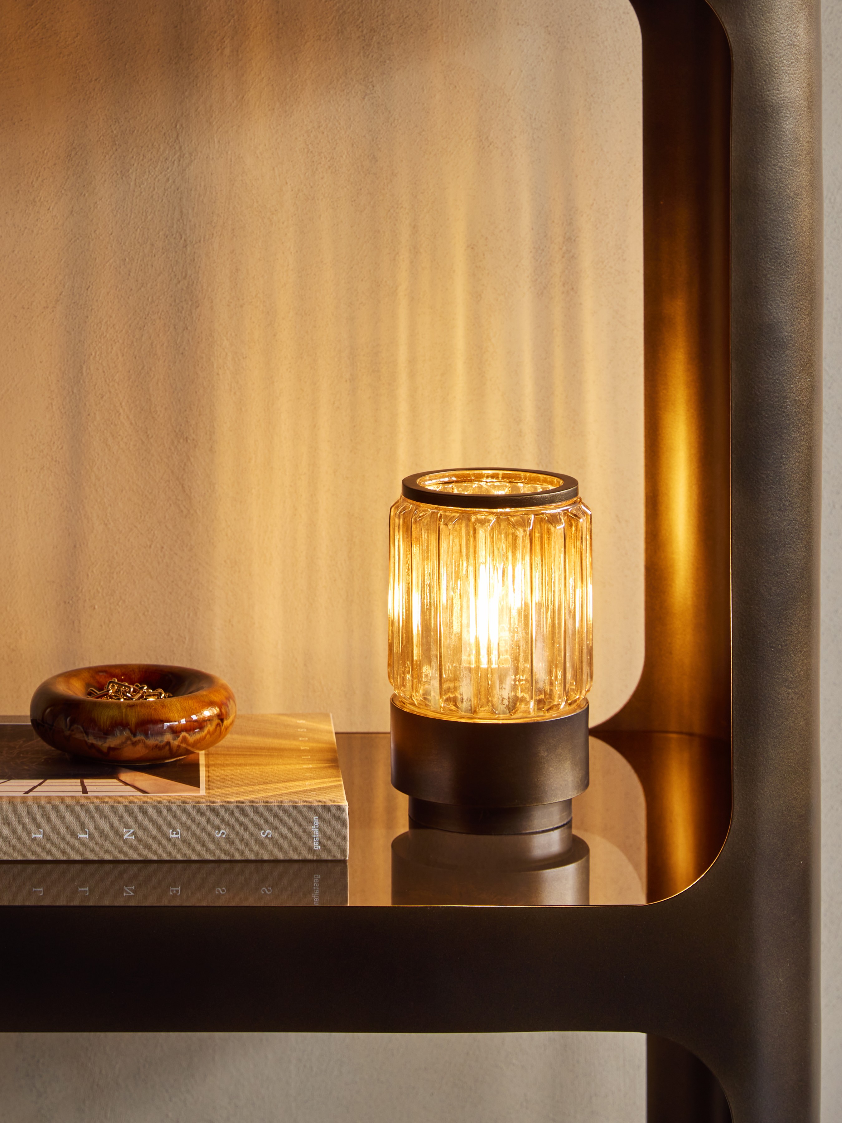 The Eleanor Glass Table Uplighter offers a harmonious balance of texture and tone. Available in two sizes, its fluted glass shade, finished in a copper-brown lustre, gently refracts light to create a warm, ambient glow. The base, crafted in burnished bronze gold iron compliments the warm lustre of the tinted glass above. Designed for E14 fittings (bulb not included), this uplighter is ideal as a bedside lamp or for creating atmosphere on sideboards, shelves or tables. Dimensions: W13.5 Ă— D13.5 Ă— H24.5 cm
