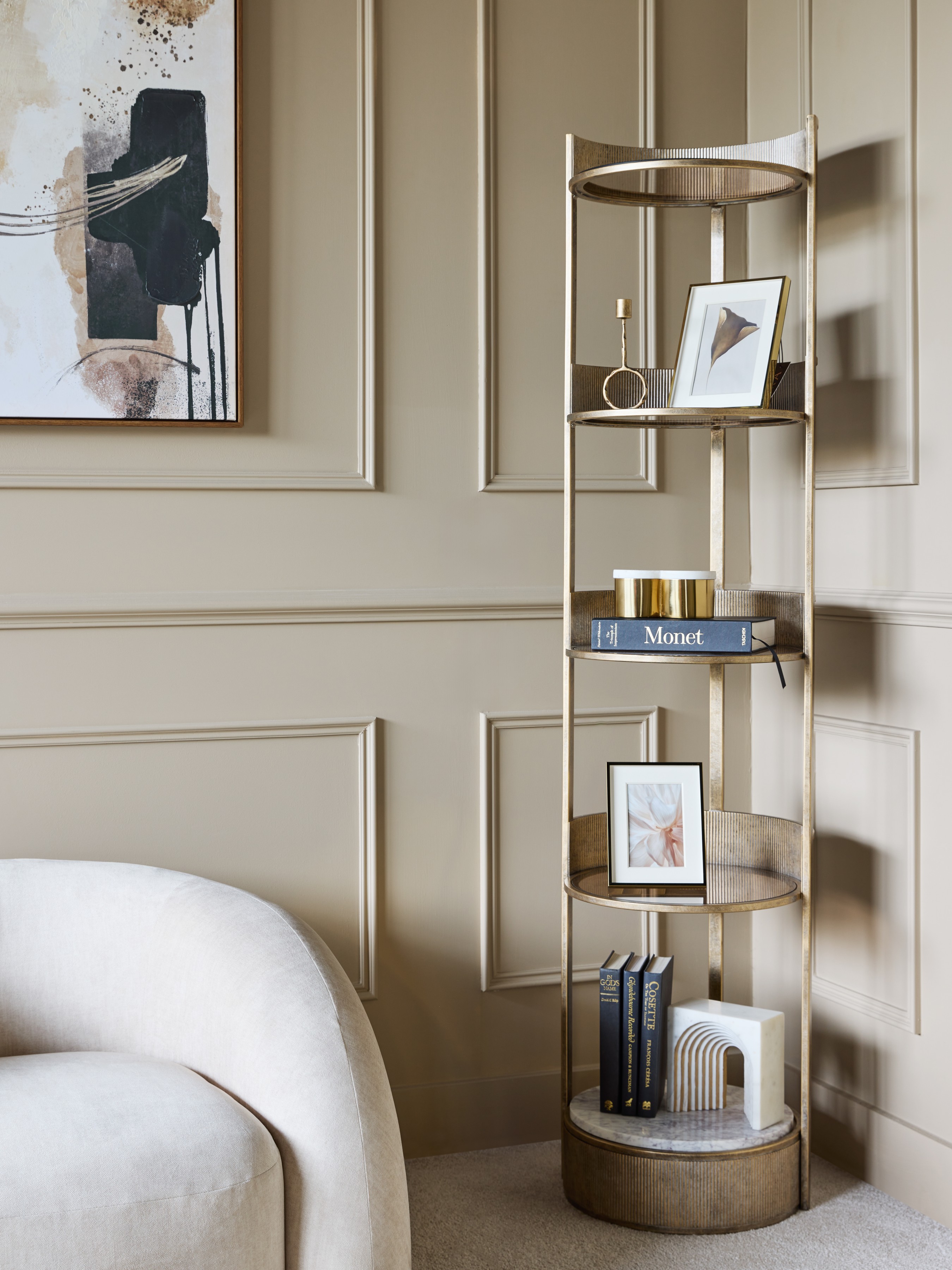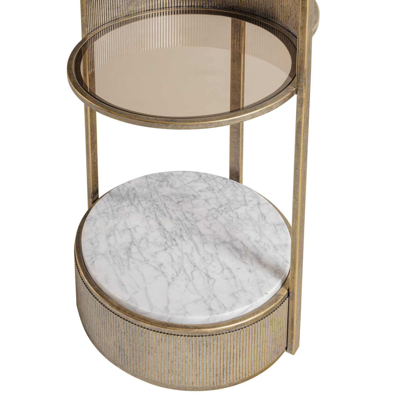 The Belvedere Round Shelving Unit brings vertical elegance and practical storage to any home or commercial space with its tall, slim profile and refined mix of materials. Champagne gold-finished iron frames four tiers of brown-tinted glass, crowned at the base by a striking white Banswara marble shelf. Each tier features a subtly ribbed surround for added texture. Perfect for displaying books, decorative accents or glassware, this statement piece blends function with sophistication. Part of our highly popular Belvedere collection. Dimensions: W43.5 Ă— D43 Ă— H180.8 cm.