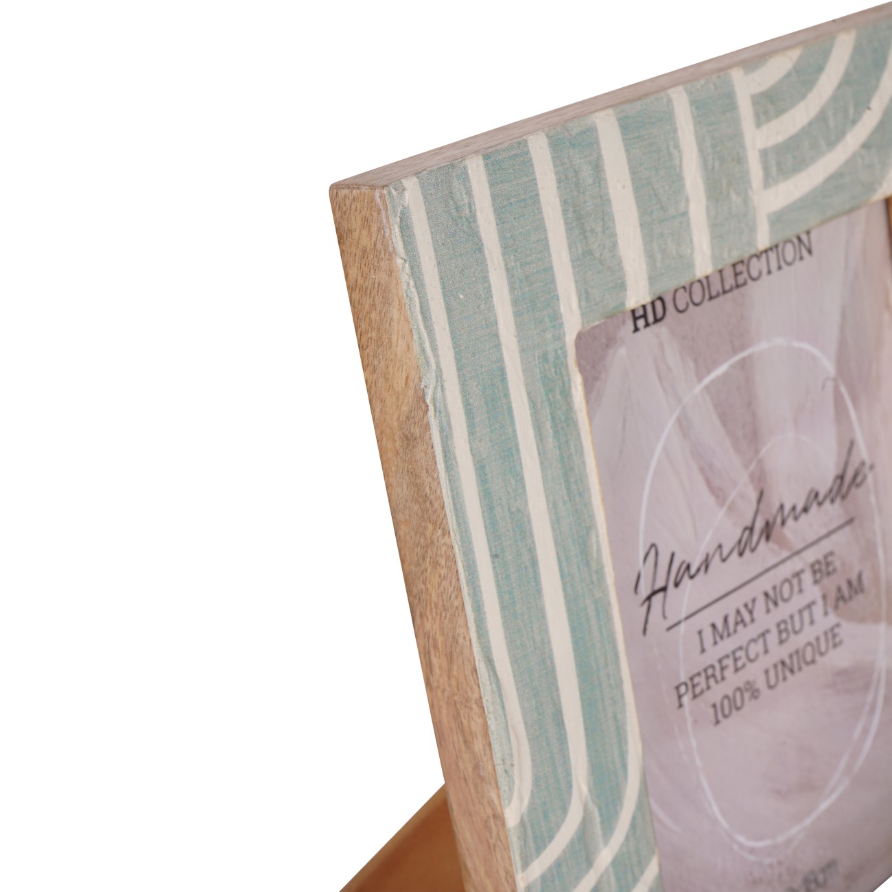 The Curve Mango Wood Frame Bold stands out with its bold design and natural charm. Crafted from sustainable mango wood, it features a striking teal finish accented by white curved line patterns that add a playful yet modern touch. The organic texture of the wood enhances its handcrafted appeal, making each piece unique. Perfect for 5"x7" photos.