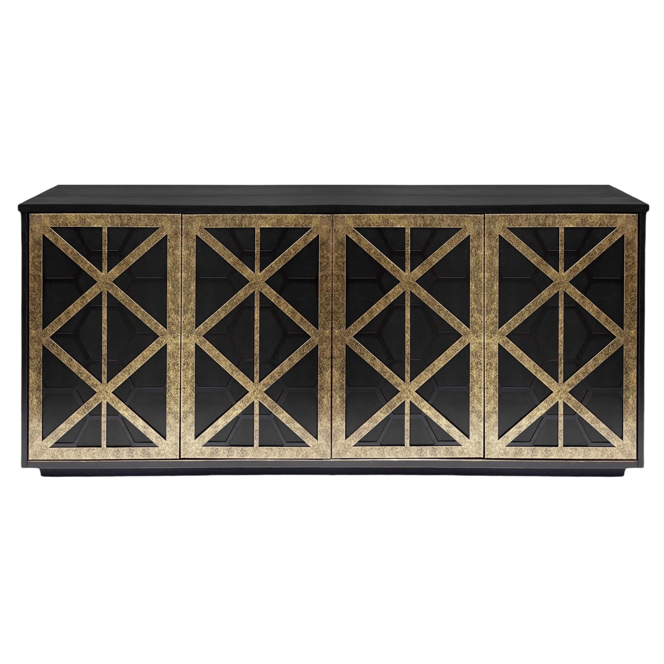The Reeno Fretwork Four-Door Sideboard features a black-washed mango wood top and surround. The main highlight of the front doors is a striking modern geometric fretwork pattern made from iron. The intricate fretwork combines gilded dark bronze with a warm dark gold contrast, while the textured black-washed mango wood adds depth and sophistication. Offering ample storage space with fixed shelves, this sideboard is both functional and stylish. Also features push-close doors and adjustable feet. As part of a matching collection, it pairs beautifully with a two-door cabinet and a two-door bar cabinet.