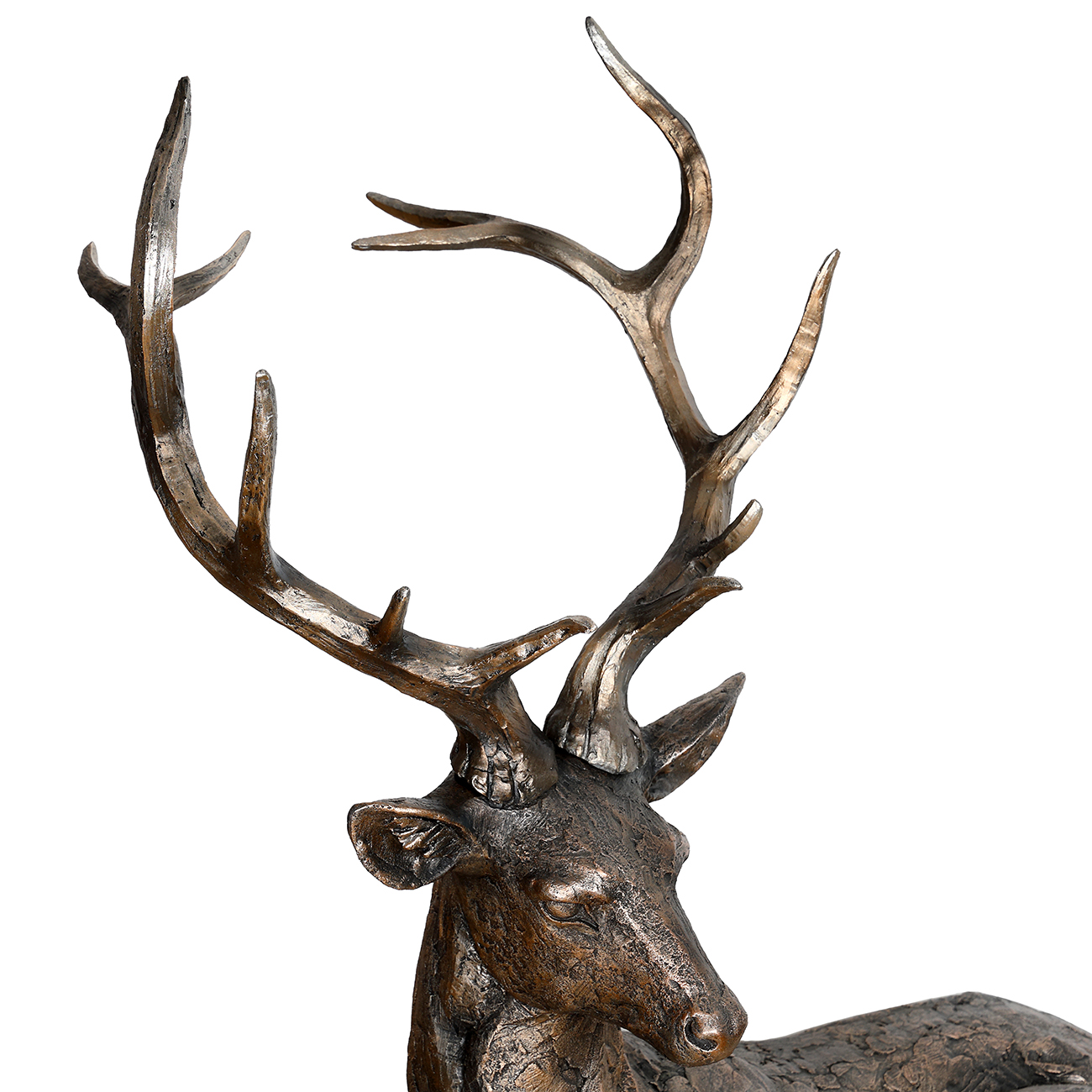 A timeless symbol of poise and presence, the Ewan Regal Lying Down Stag is sculpted with a commanding silhouette and finished in a rich, antiqued copper tone that enhances its intricate detailing. Crafted from a carefully balanced blend of resin and wollastonite powder, the piece captures a quiet majesty, its form evoking both stillness and strength. Ideal for placing beside a fireplace, nestled into a seasonal display, or standing alone as a sculptural statement, this elegant stag brings a sense of grounded grace and heritage-inspired style to any interior. Style individually or pair with the Magnus Standing Stag for a complementary display of scale and stature. For indoor use only. Dimensions: W82.5 Ă— D45.5 Ă— H79.5 cm