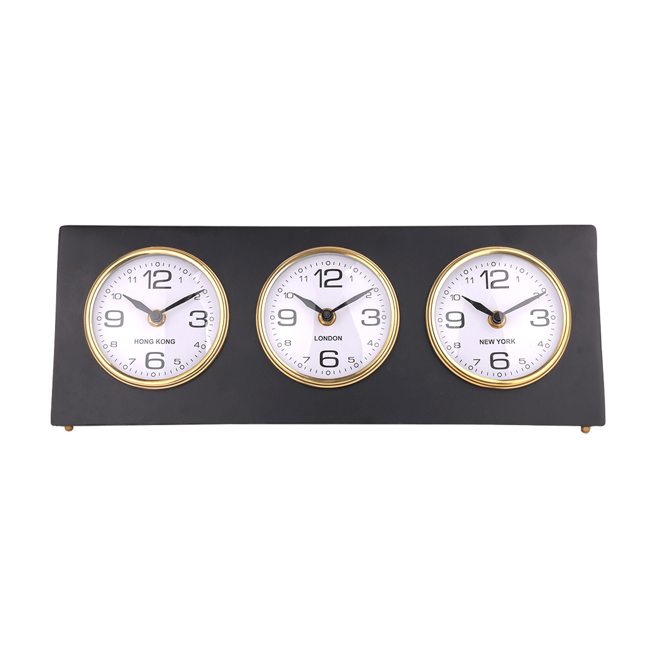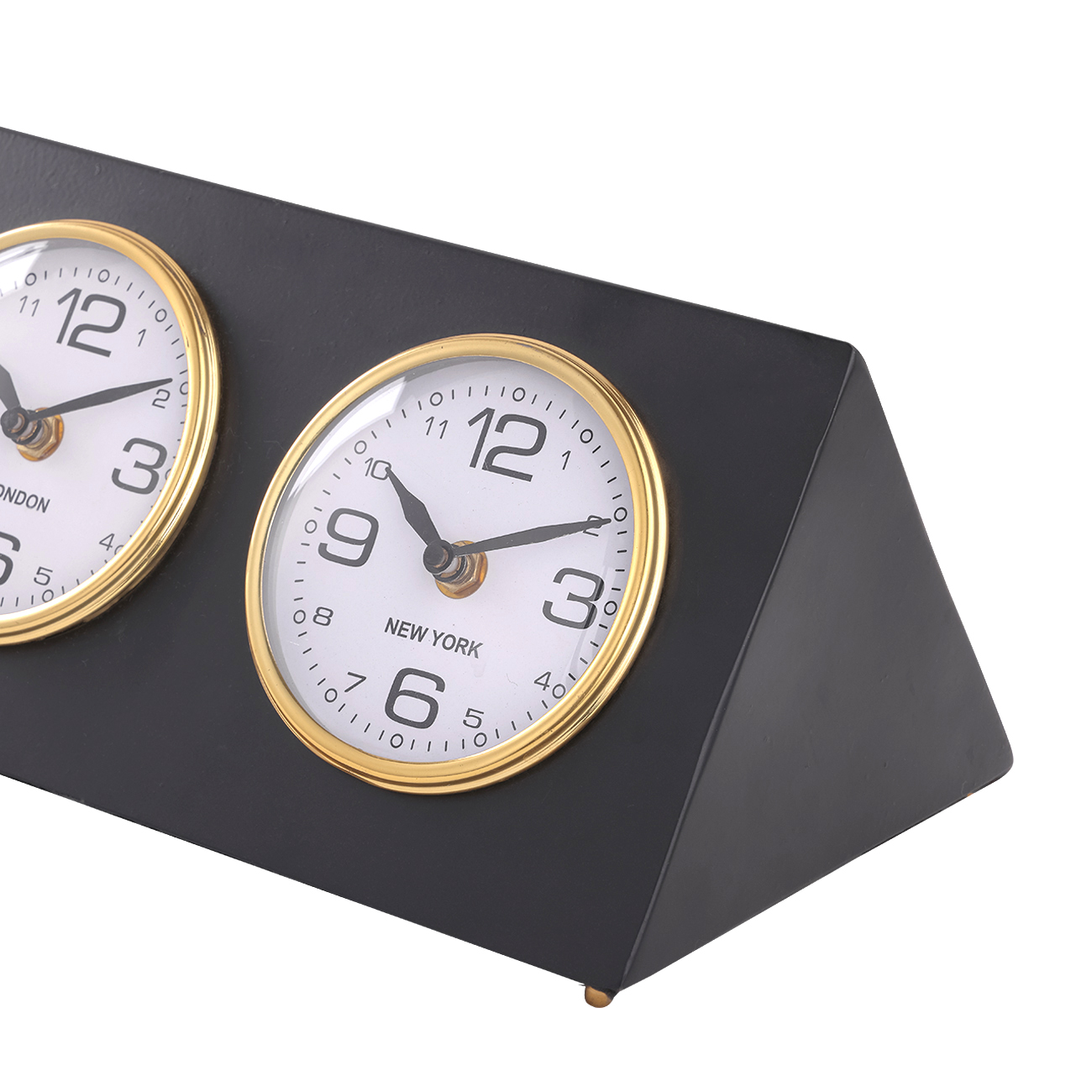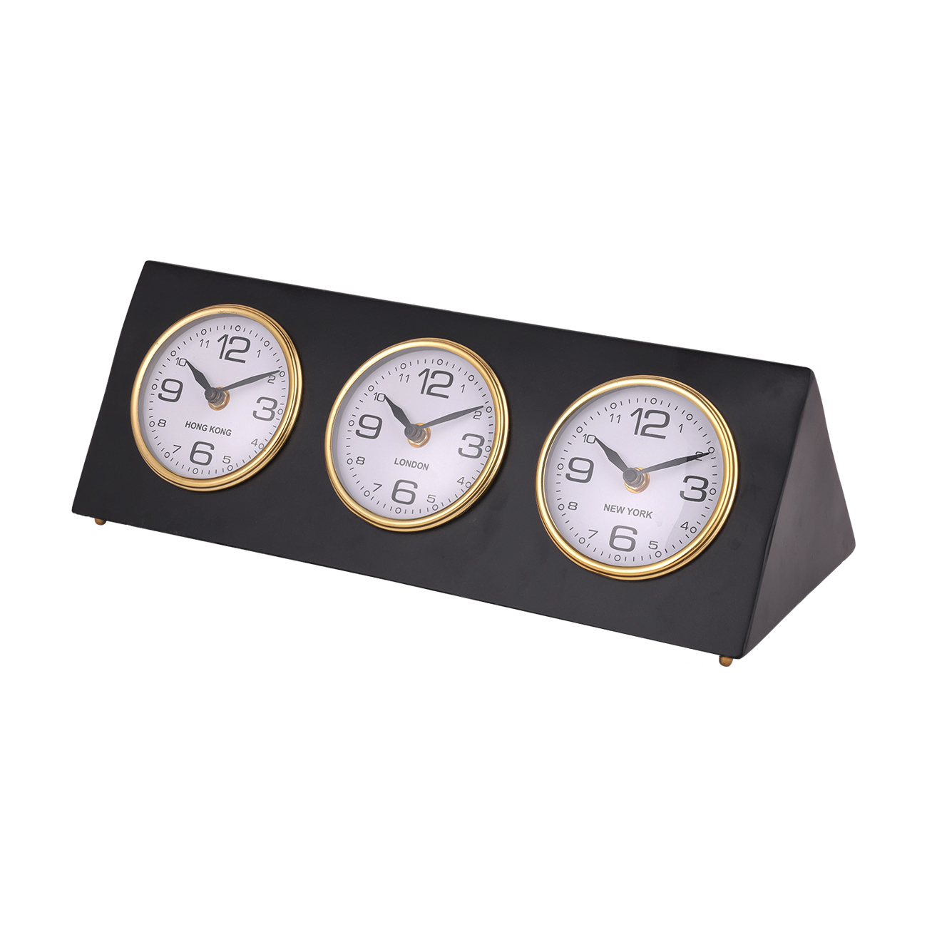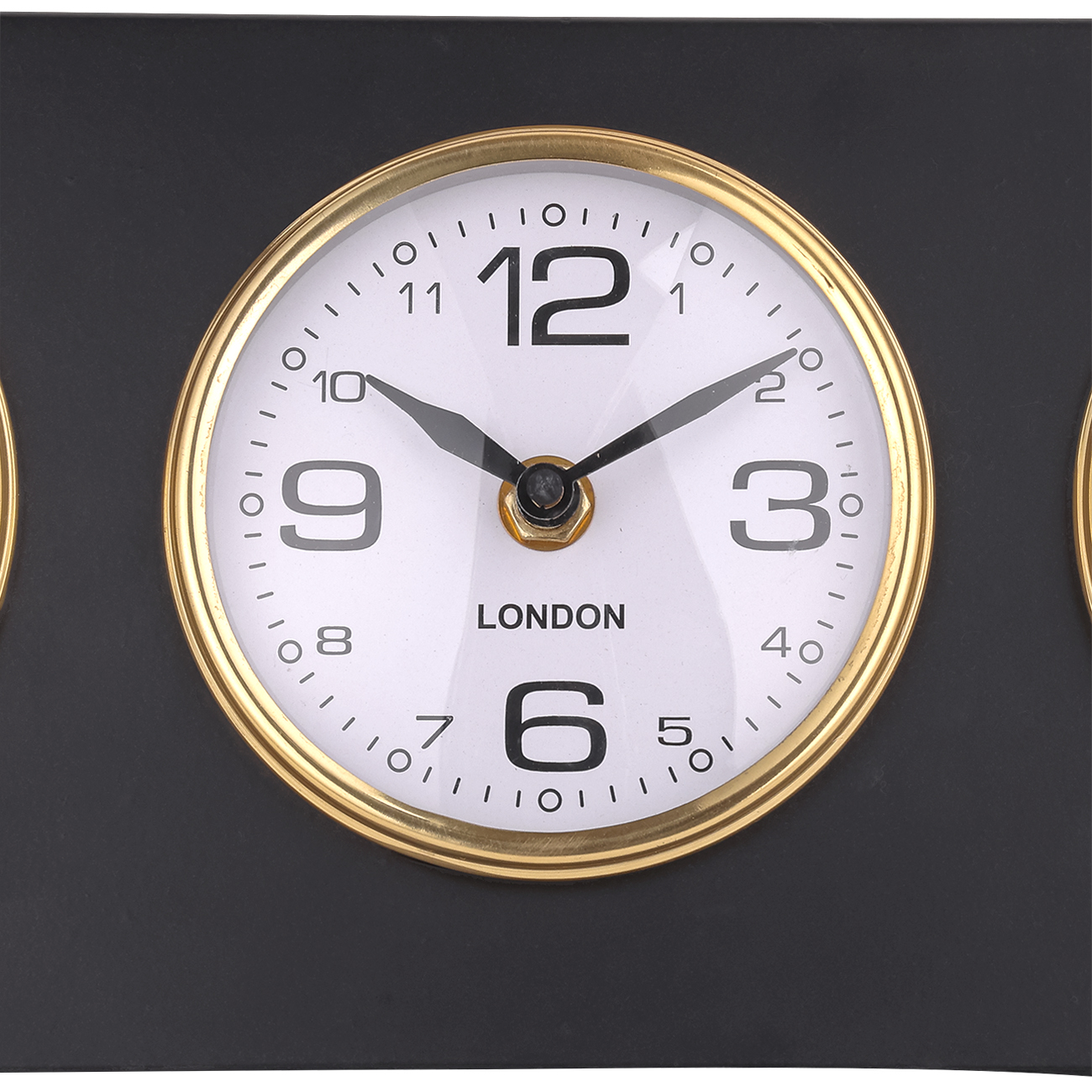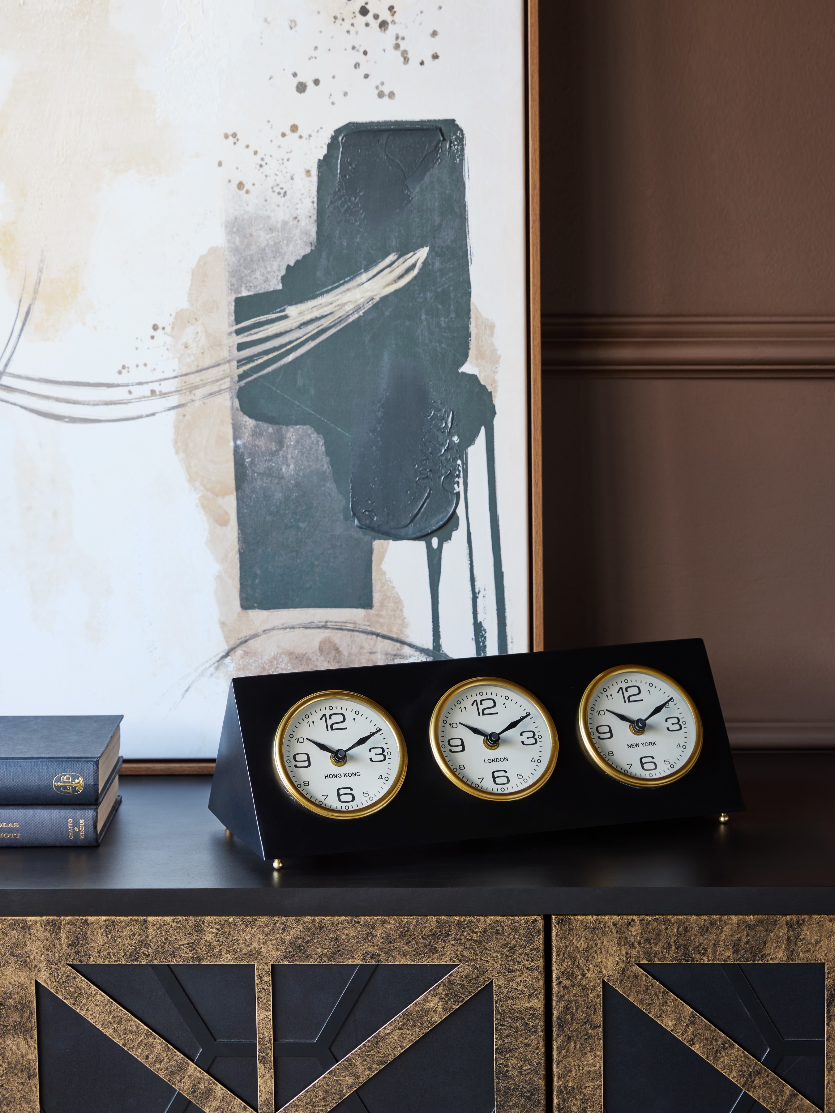 Compact and distinctive, the Retro World City Desk Clock displays three classic dials within a matte black steel frame, set to New York, London and Hong Kong time. The architectural shape and vintage-inspired details tie into its refined industrial style. Part of the Retro collection, which also includes the Retro Black Carriage Clock. Requires 3 x AA batteries, not included. Dimensions 41 x 7.4 x 13.5 cm.