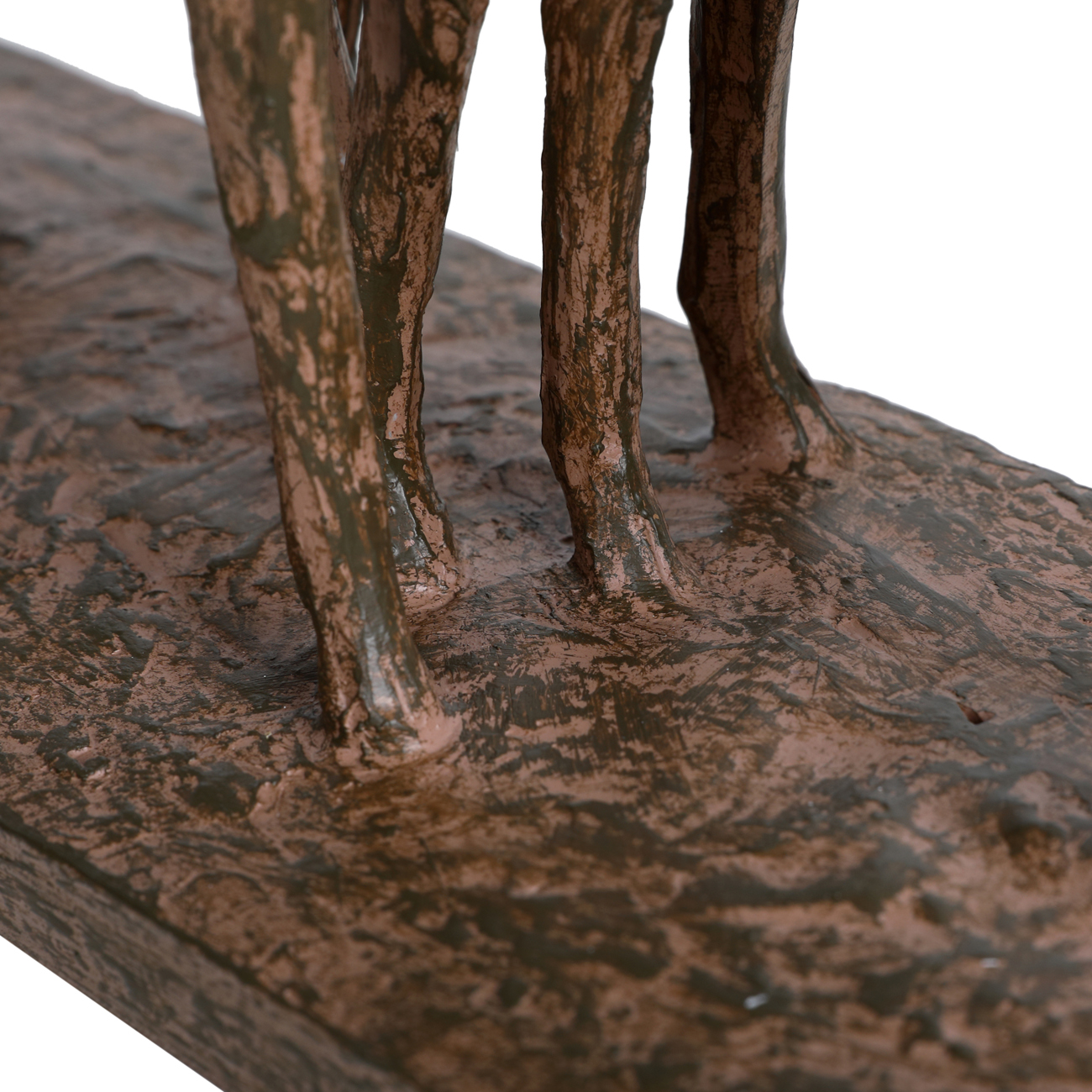 This stylised sculpture captures the elegance and presence of three stags in a strikingly textured form. Cast from a blend of polyresin and limestone, the trio stands poised atop a rectangular plinth, finished in a rich rust tone with an aged, rough texture that highlights the expressive modelling. Perfect for consoles, sideboards or mantels, this sculpture adds height, movement and rustic charm to curated interiors. The layered patina and fluid lines offer an artistic take on woodland wildlife, blending traditional subject matter with a contemporary sculptural twist. Dimensions: W34.8 x D10.4 x H25 cm