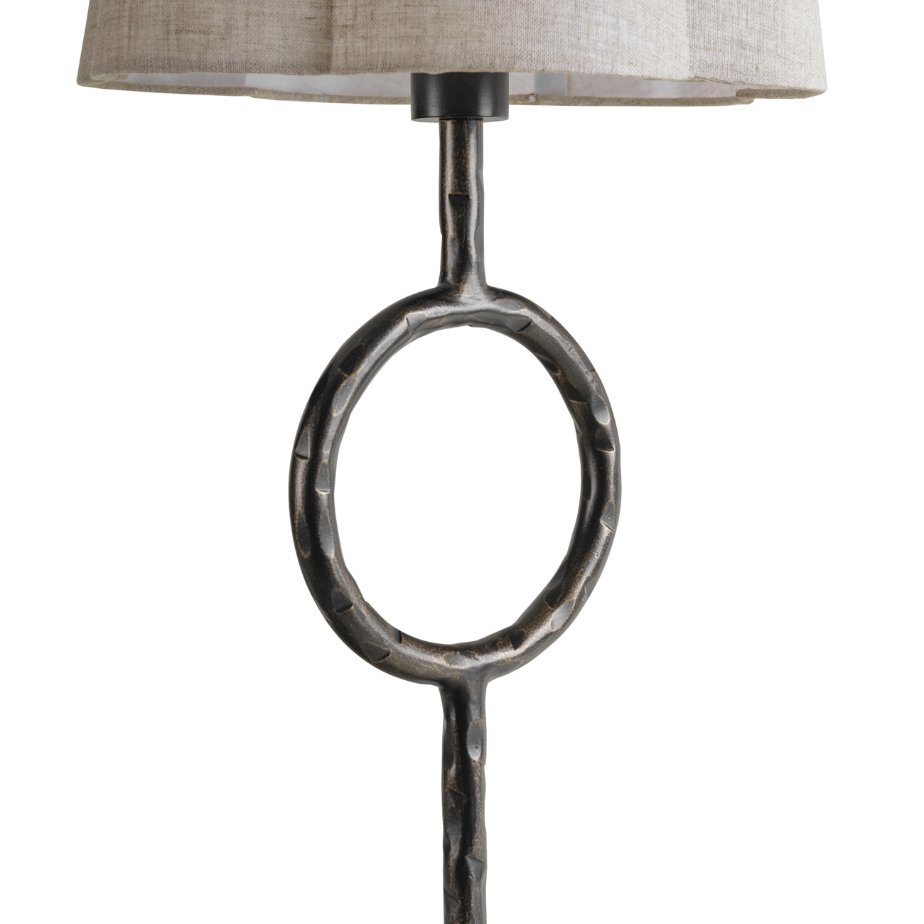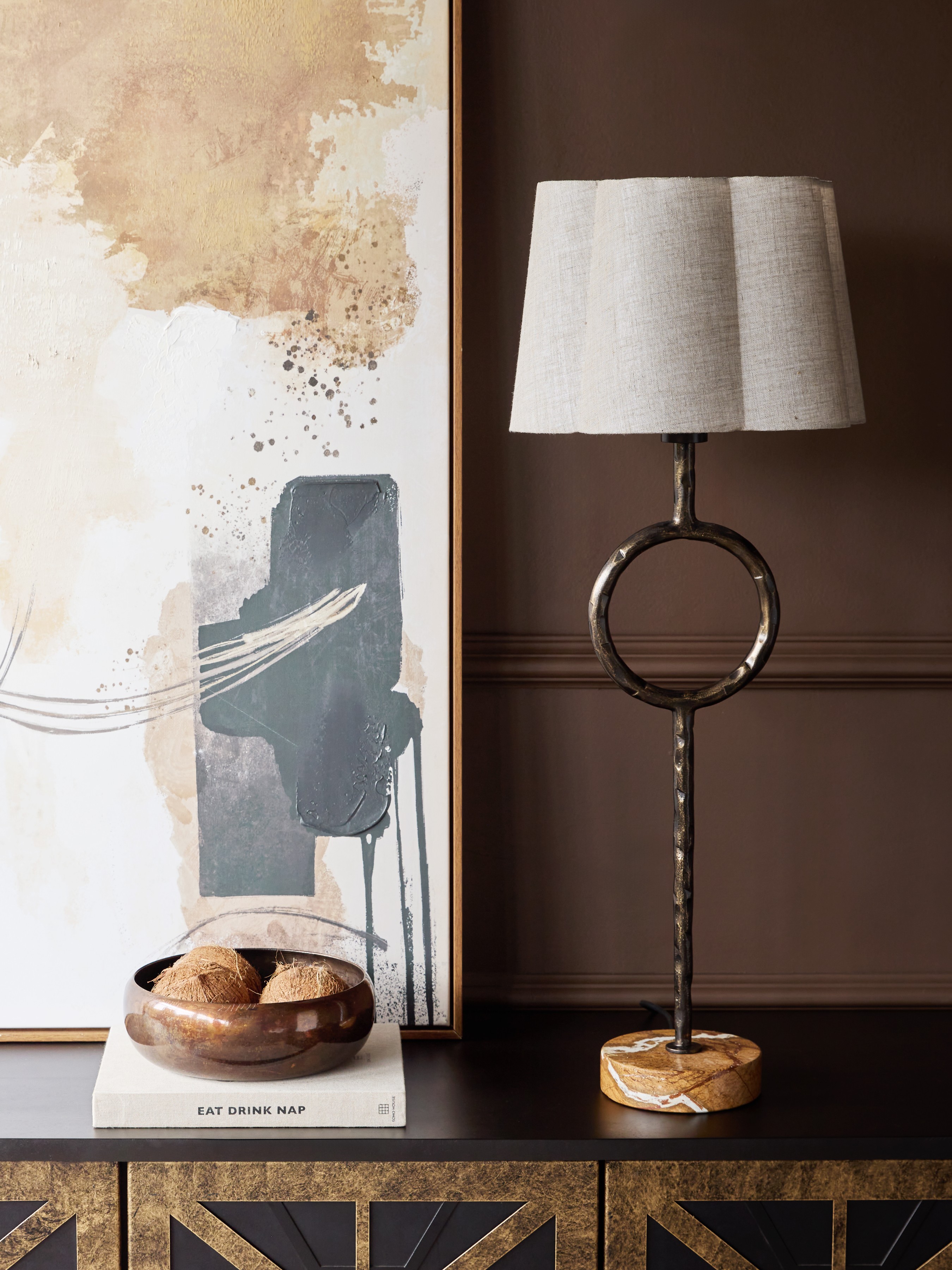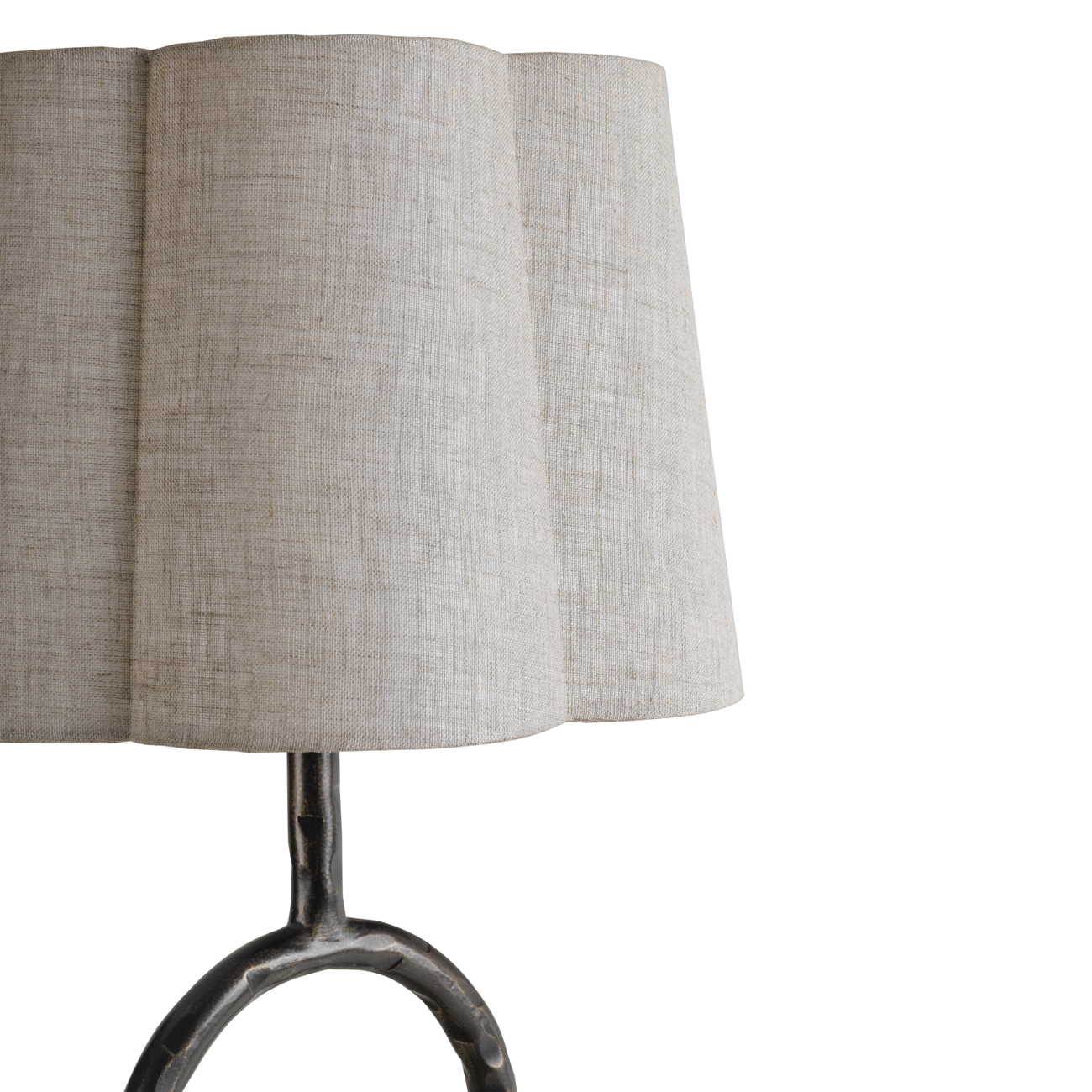 Blending sculptural form with a lighting source, the Rutland Floor Lamp makes an elegant statement. The hammered iron pedestal, finished in gilded dark bronze, features a distinctive circular detail that draws the eye without overpowering a space. Its base is crafted from richly veined marble, offering weight and organic warmth. Topped with a scalloped natural linen shade, this portable lamp brings calm presence to living rooms or reading corners. Fitted with an inline switch and designed for an E27 bulb (not included). Part of the wider Rutland collection, which includes floor and table lighting as well as decorative hurricanes. Lamp Dimensions: W40.5 Ă— D40.5 Ă— H90 cm. Shade Dimensions: 28 Ă— 33 Ă— 23 cm