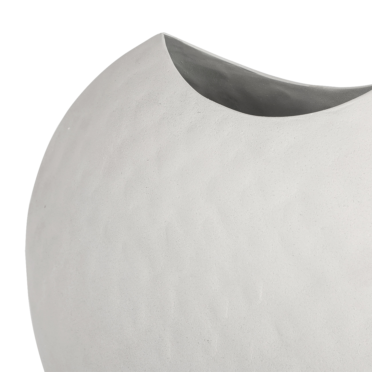 Tactile texture and soft geometry define this sculptural vase. The Samui Small Moon Vase is crafted from aluminium with a hand-applied white stonewash finish, offering a modern matte surface and an organic, rounded profile. A gently pinched neck adds visual rhythm, while the narrow opening is suited for a single dried stem or left unadorned as a standalone object. Ideal for shelves, sideboards or layered arrangements. Explore the full Samui range to discover coordinating vases, bowls and planters. Not water safe. For use with dry florals only. W28 x D11 x H24 cm