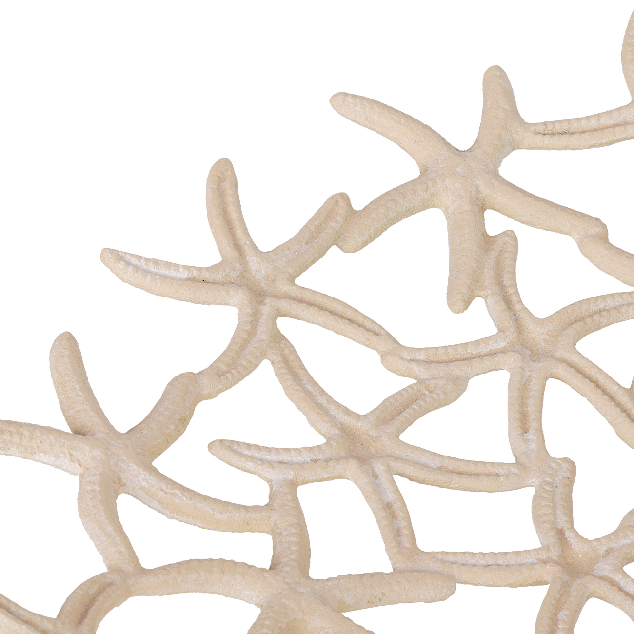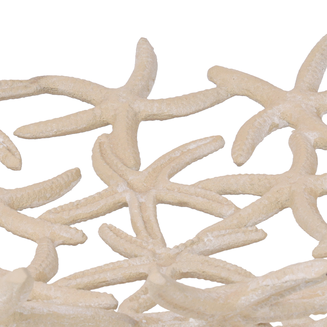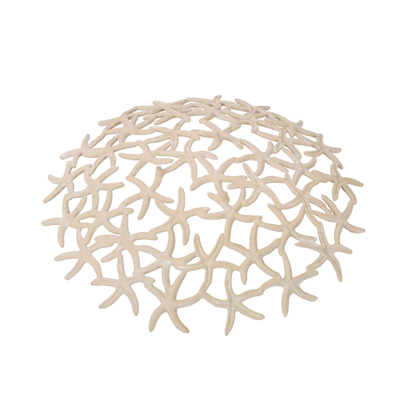 Open form with refined texture. This Shallow Starfish Bowl is made from cast iron with a hand-applied beige stonewash finish, shaped into an airy formation of interlocking starfish. Its wide, low profile adds seaside elegance to any surface, offering visual depth while remaining light and easy to style. A versatile accent for coastal-inspired interiors. Discover the matching small, deep bowl to extend the coastal story with layered dimension. Not food safe. W41.5 x D41.5 x H8cm.