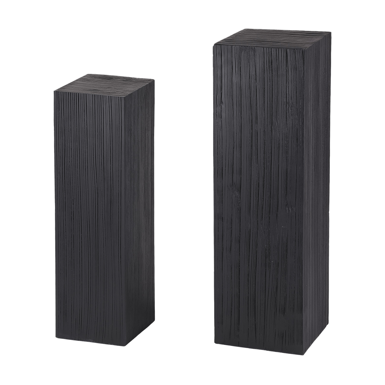 Sculptural and understated, the Sienna Plinths are a versatile pair designed to add height and structure to any interior. Crafted from solid mango wood with a deep black stain, each plinth features a carved linear texture that enhances the grain and adds tactile detail. The set includes one plinth at 100cm tall and a second at 85cm, making them ideal for displaying vases, sculptures or curated accessories at varying levels. Style together for impact or place individually to add vertical interest throughout your space. Dimensions: W30 x D30 x H100 cm; W27 x D27 x H85 cm