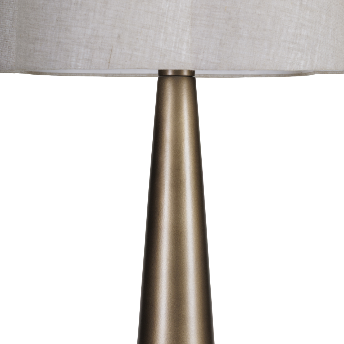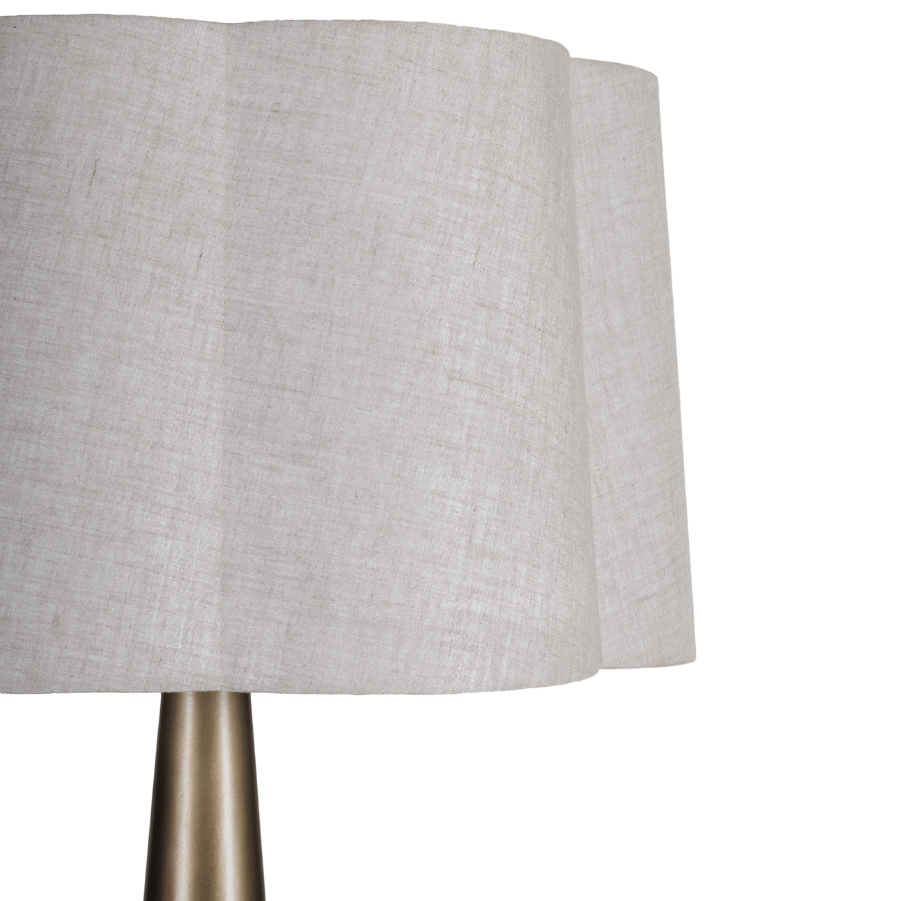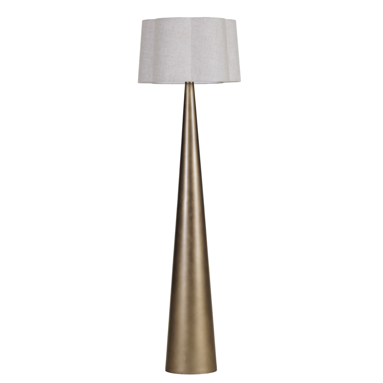 Crafted for sculptural presence and practical elegance, the Southbourne Floor Lamp pairs a tall tapered iron base in soft smoked gold with a scalloped linen shade that diffuses light in a warm ambient glow. Thoughtful in scale and finish, it brings shape and softness to any interior space. Pair with the Southbourne table Lamp and three sizes of Hurricanes, small, medium and floor, to create a consistent design thread across your space. W46 x D46 x H172cm. Shade W45 cm top x W51 cm base x H30.5 cm. A discreet foot switch offers ease of use. Lamp requires 1 x E27 bulb (not included).