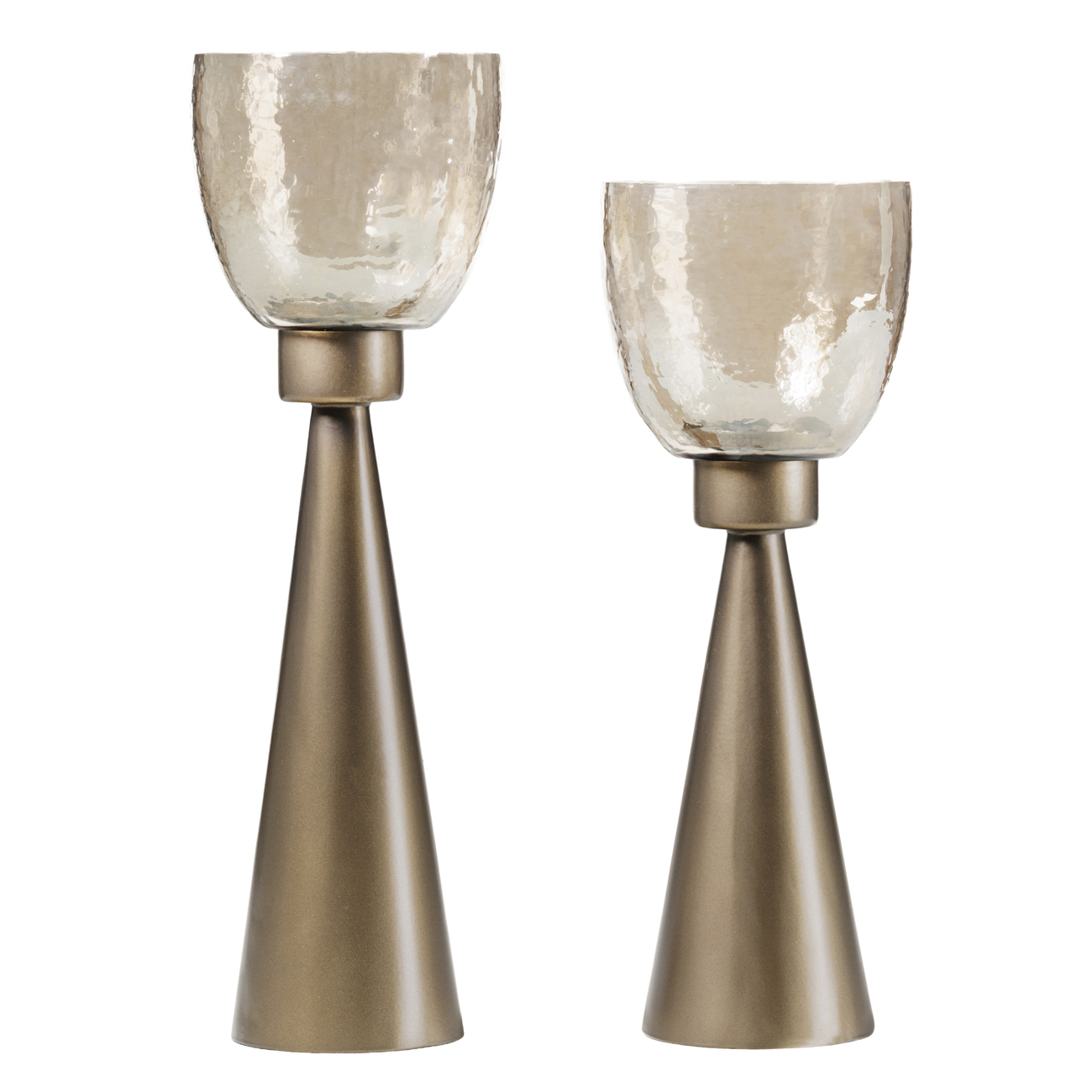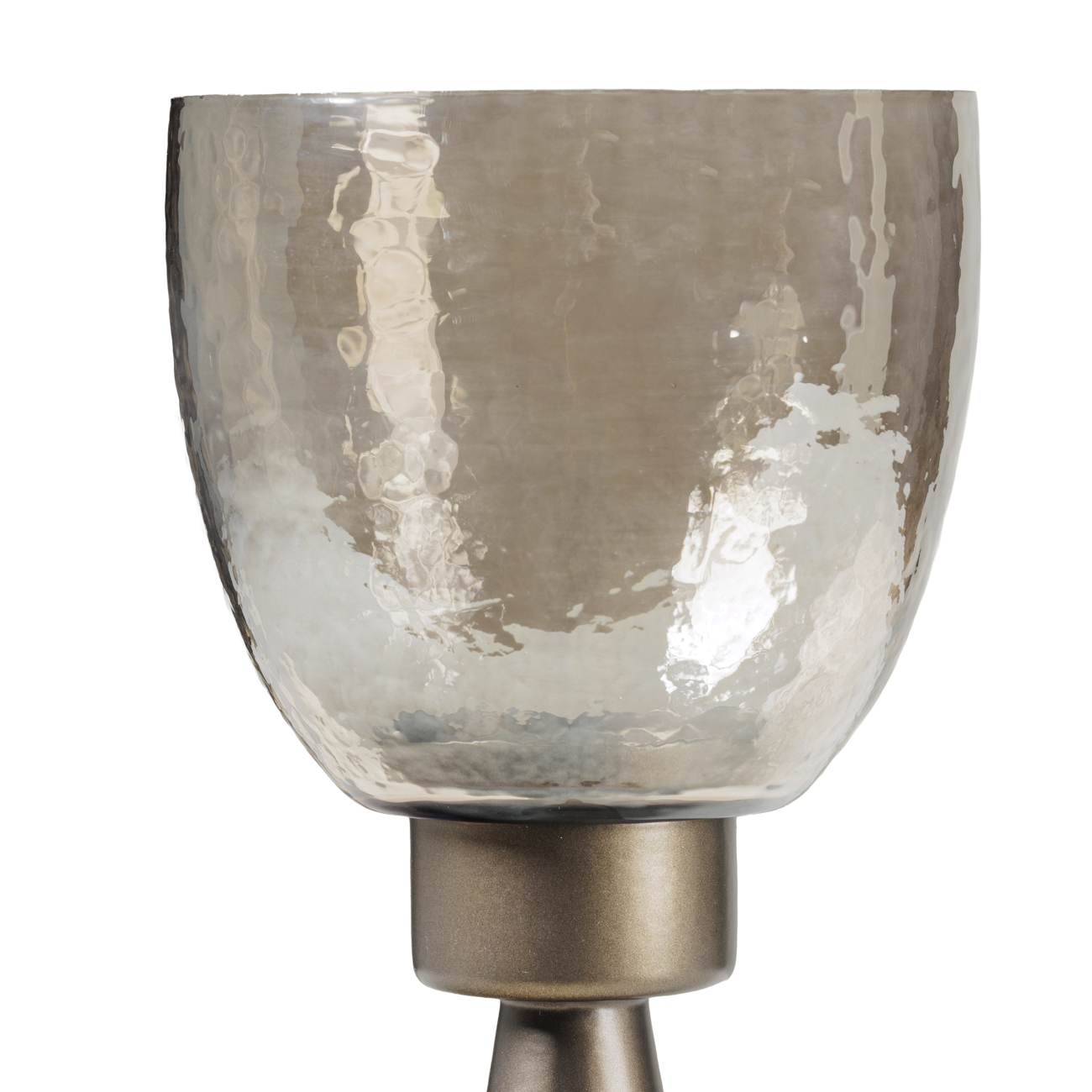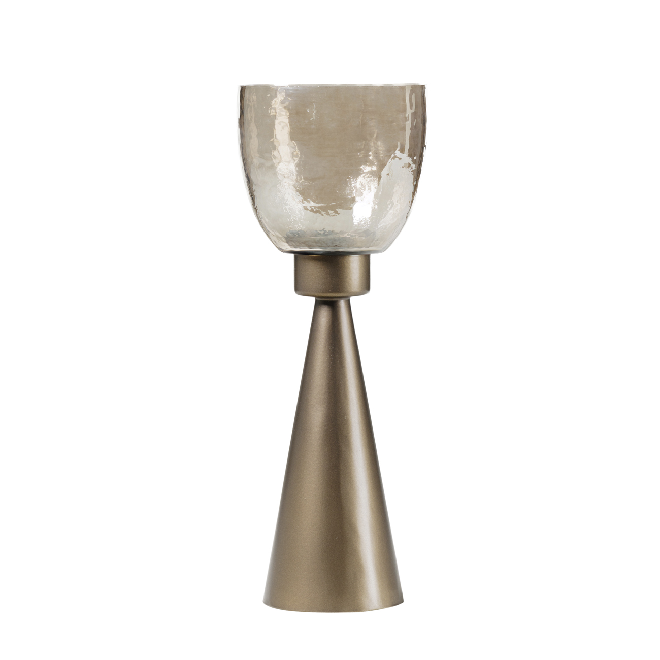 The smallest in the Southbourne collection, this hurricane holder pairs a gently tapered iron base in smoke gold with a hand blown glass vessel in a copper brown lustre. The hammered texture of the glass casts candlelight with quiet elegance and the compact size makes it ideal for layering on shelves or trays. Suitable for pillar candles or tea lights of a dia of 7cm. Display alongside the medium and floor hurricanes or style with the Southbourne Table and Floor Lamps for a coordinated lighting scheme. W11.5 x D11.5 x H37cm.