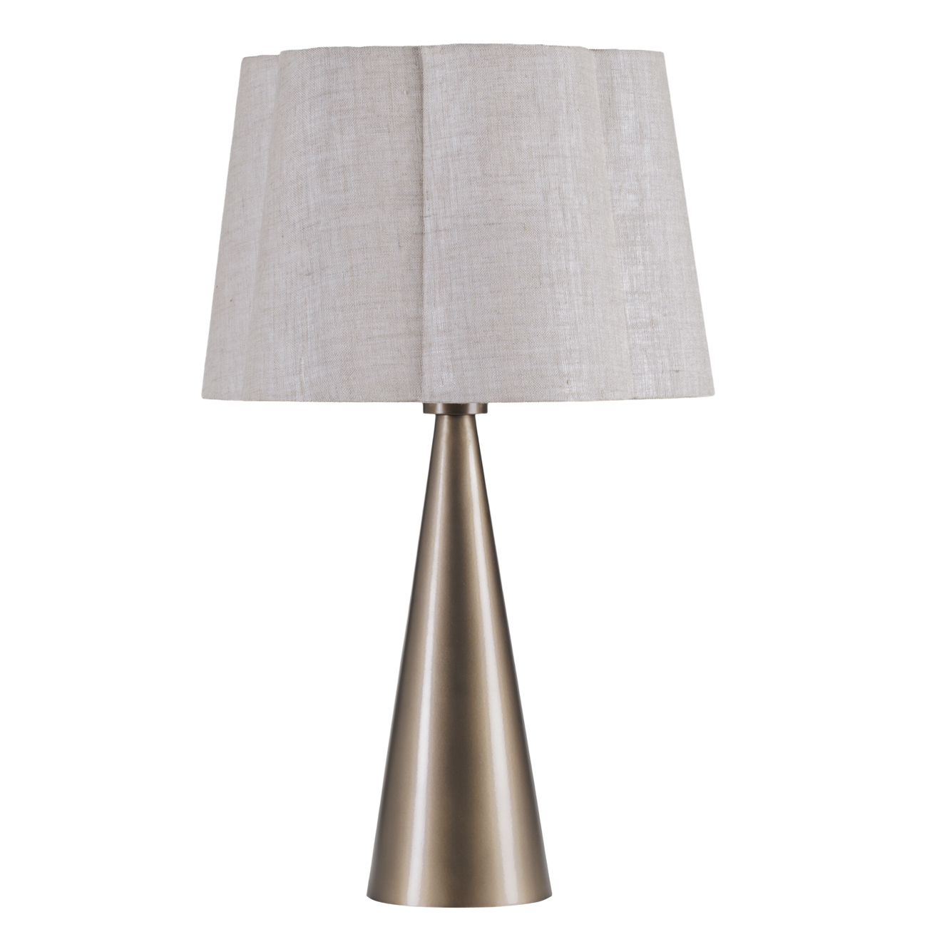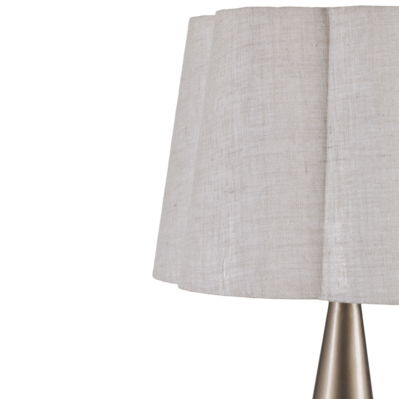 Compact and sculptural, the Southbourne Table Lamp is designed with a tapered iron base in a smoke gold finish, offering weight and character to smaller surfaces. Its scalloped shade in natural linen softens the light with texture and warmth. Pair with the Southbourne Floor lamp and three sizes of Hurricanes, small, medium and floor, to create a consistent design thread across your space. W33 x D33 x H60cm. Shade W23 cm top x W28 cm base x H20.5 cm. Fitted with a push button switch. Lamp requires 1 x E27 bulb (not included).