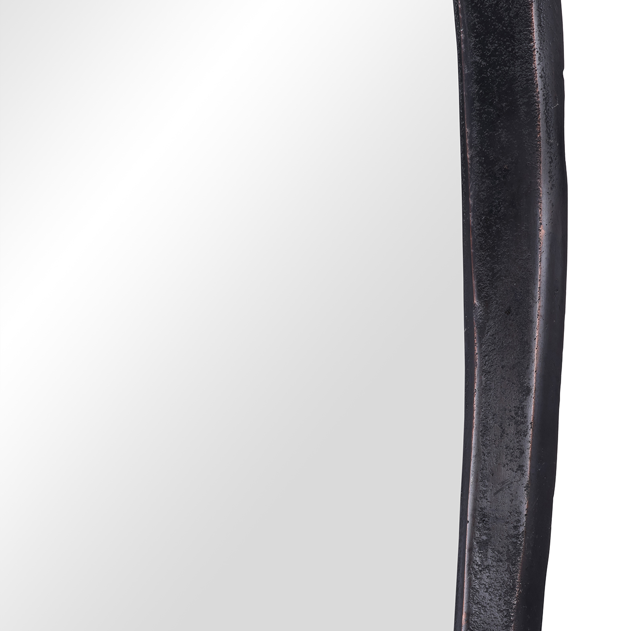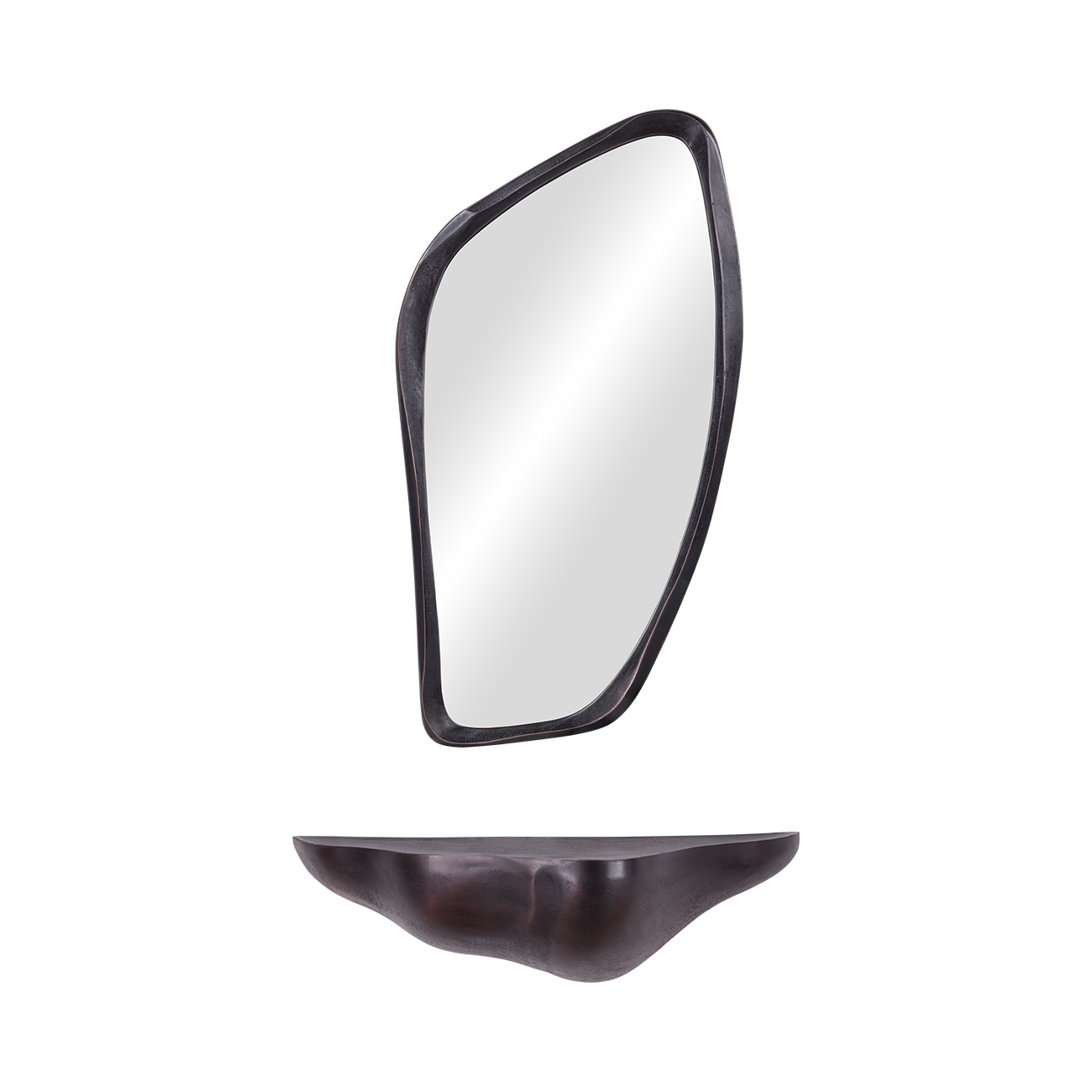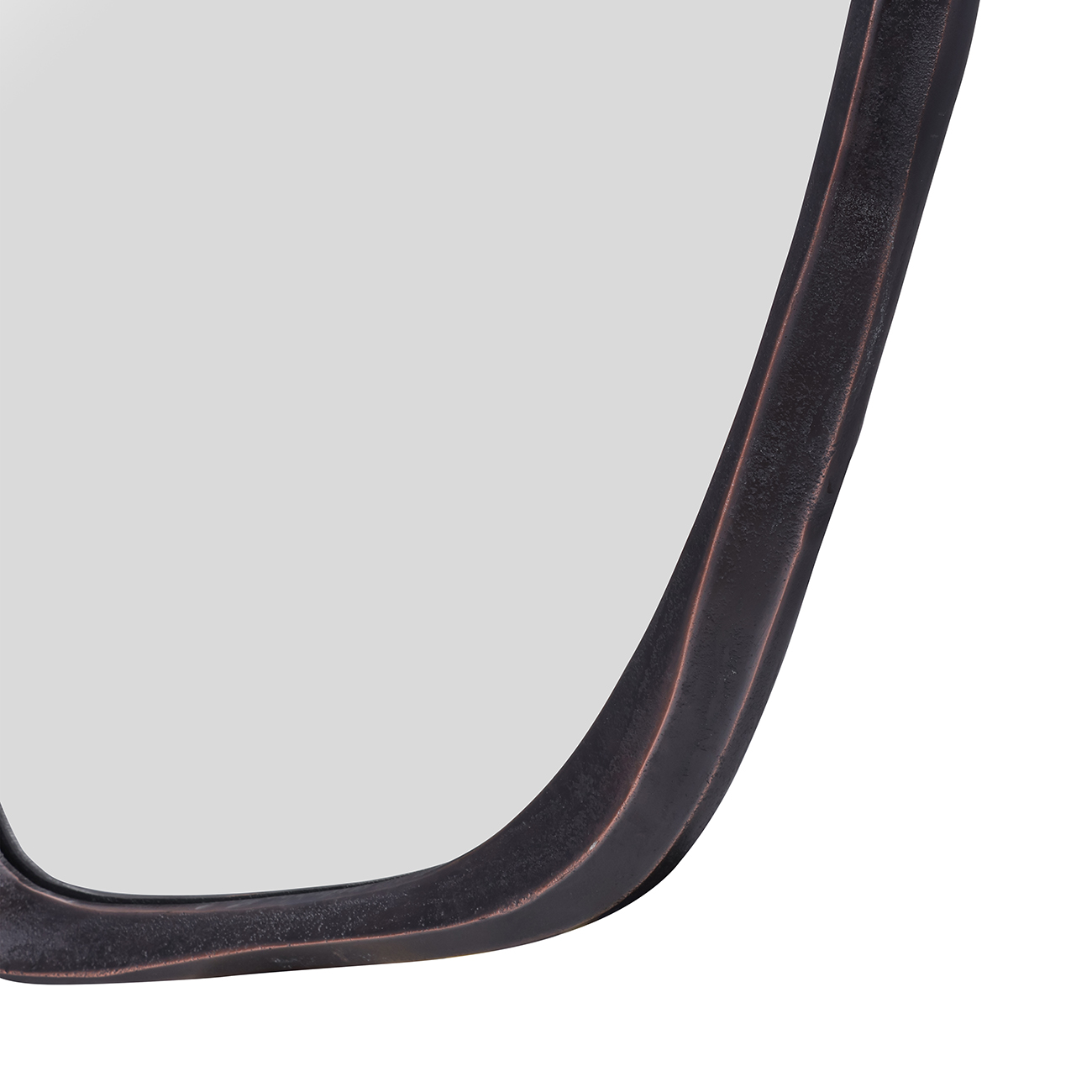 Organic form meets functional design in the Telby Bronze Mirror. Crafted from cast aluminium with a textured highlight bronze finish, its irregular outline echoes the softened, sculptural edges found in much of today's architecture. The subtly curved frame adds quiet movement to walls, while the generous mirrored surface reflects light and space with ease. A bold yet versatile statement which pairs perfectly with the Telby shelf for a cohesive and practical wall storage display unit. W64 x D4.5 x H118 cm.