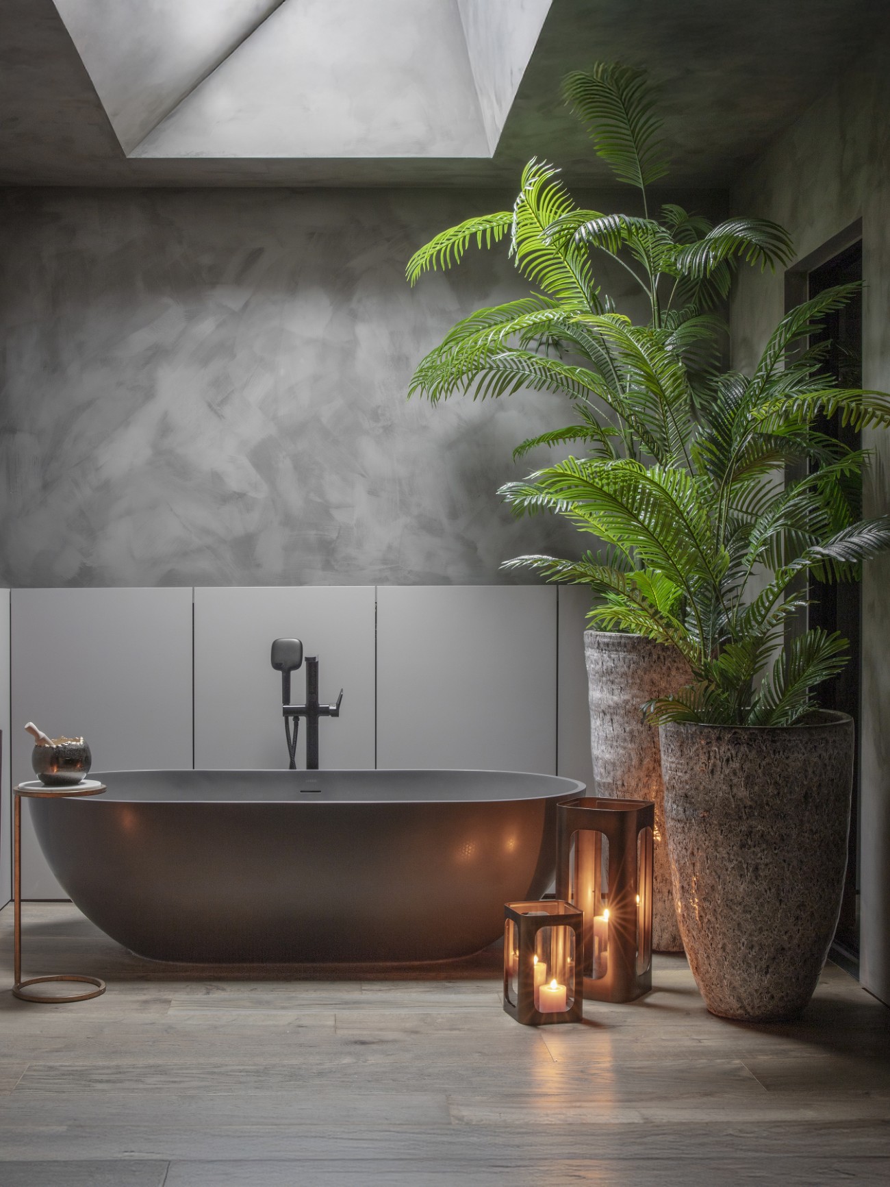 The Thorpe Small Hurricane stands 28cm tall, crafted from iron with a luxurious smoky metallic finish. This elegant piece features glass panels within each opening, allowing the soft glow of candlelight to create a warm, inviting atmosphere. Its sleek, contemporary design makes it a perfect accent for any part of the home and is available in three different heights: 28cm, 53cm, and 78cm. This collection also includes a shelving unit, coffee table, side table, and console table.